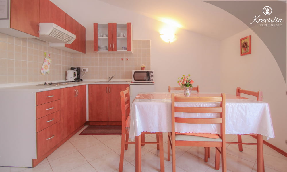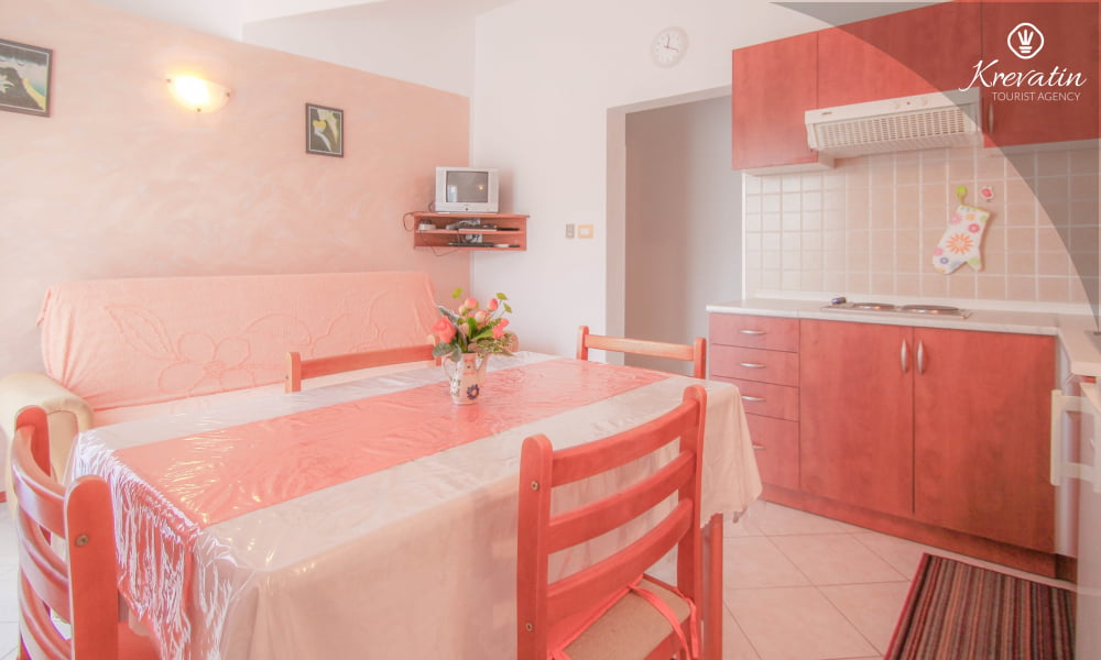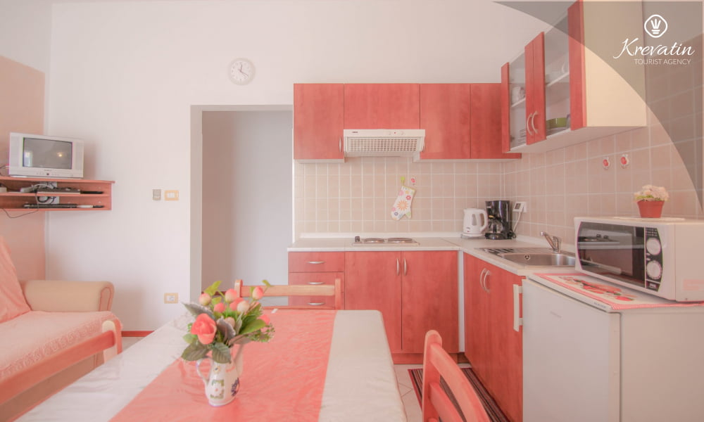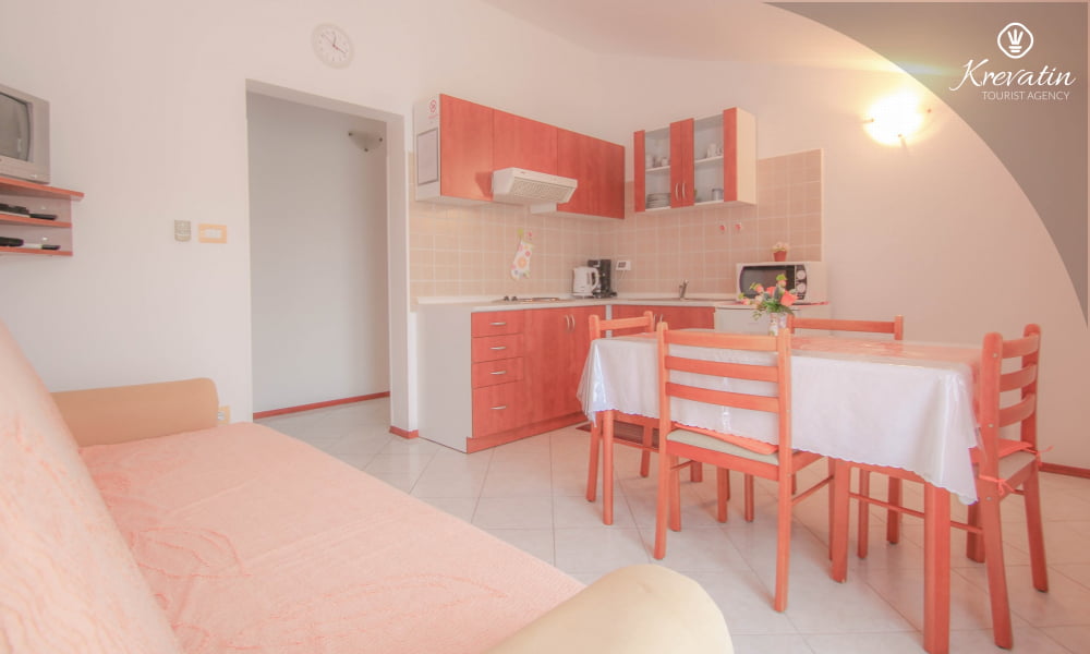 L'appartamento offre una camera da letto con letto matrimoniale, una cucina attrezzata con tutto il necessario, dove si trova anche un divano letto per un'altra persona, e un pratico bagno con doccia e WC.