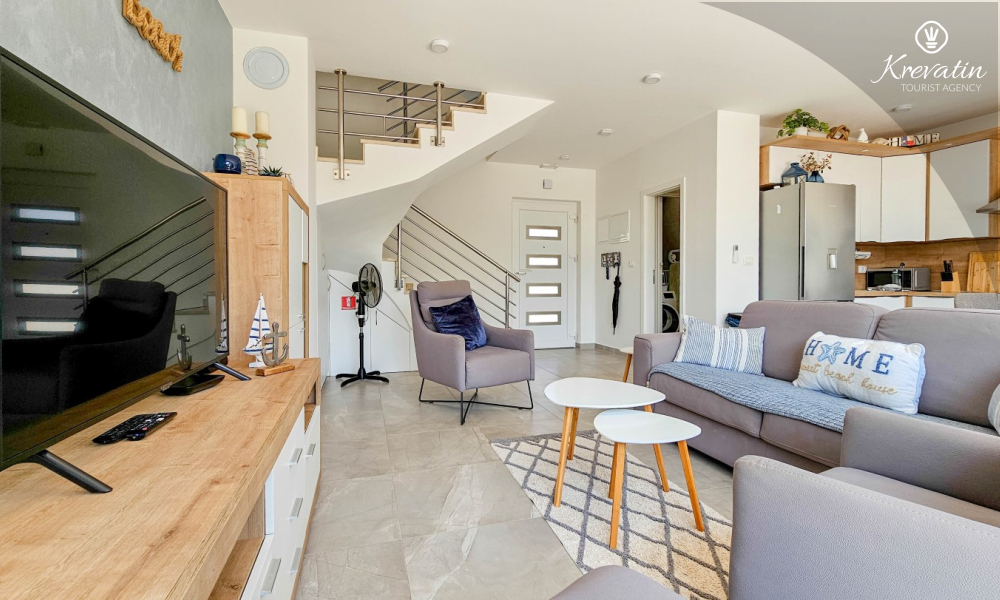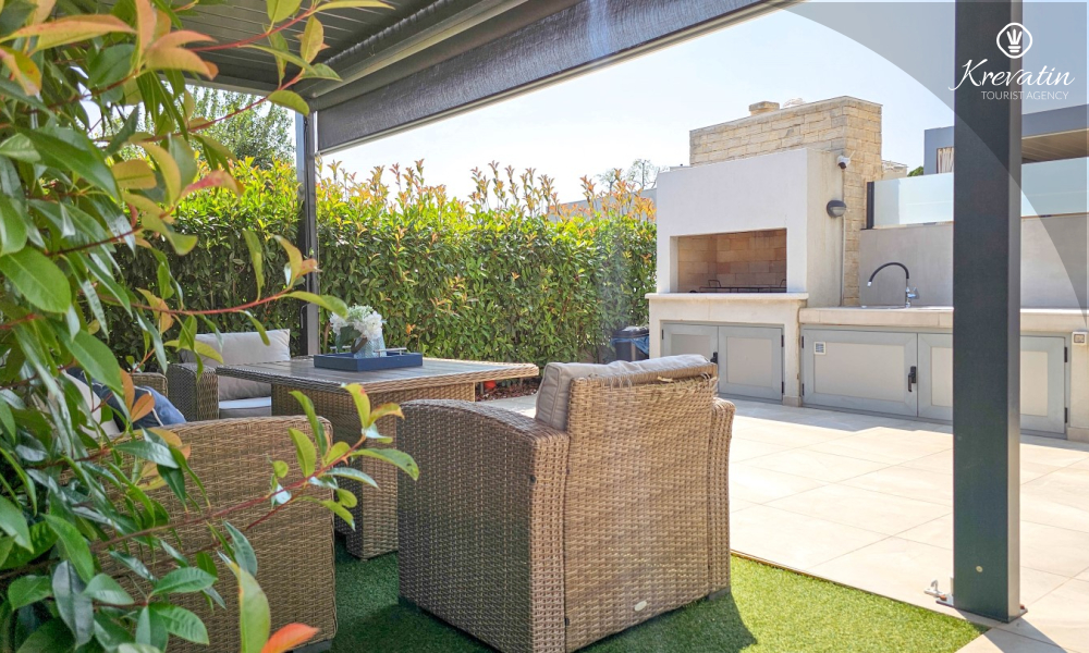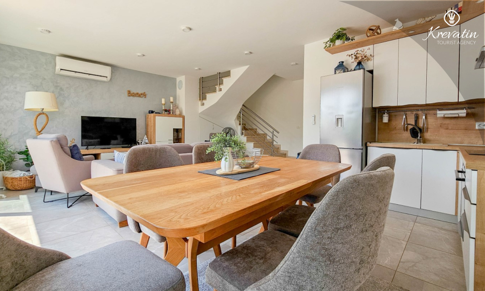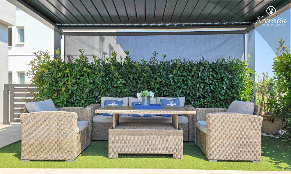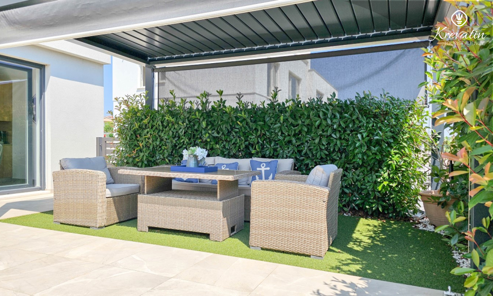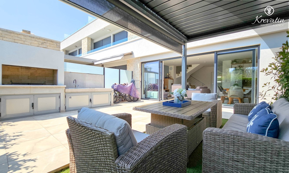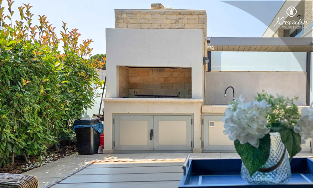 La casa si sviluppa su due piani e dispone di due ampie terrazze. La terrazza sul tetto offre una zona salotto e una vista panoramica sul porto turistico e sul centro storico, mentre la terrazza al piano terra è attrezzata con mobili da giardino e barbecue, ideale per socializzare all'aperto.