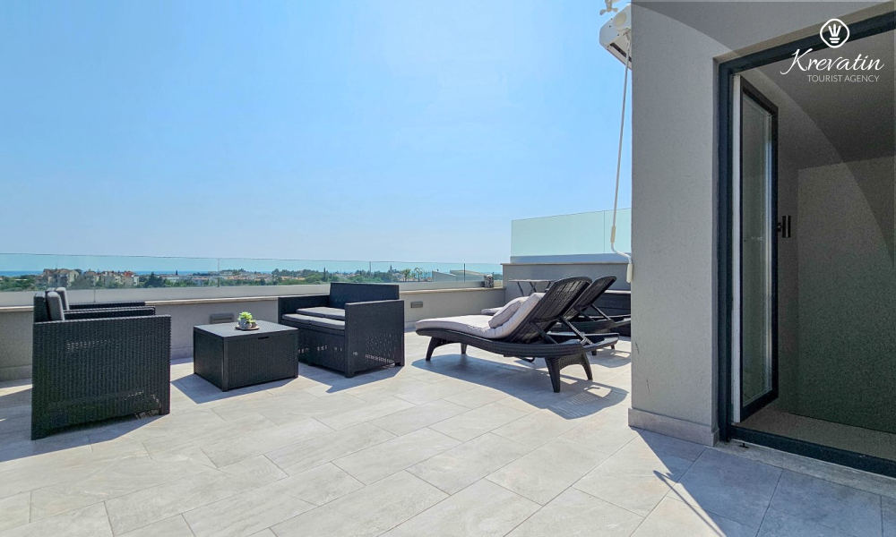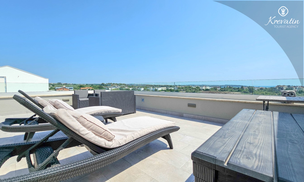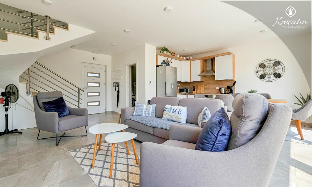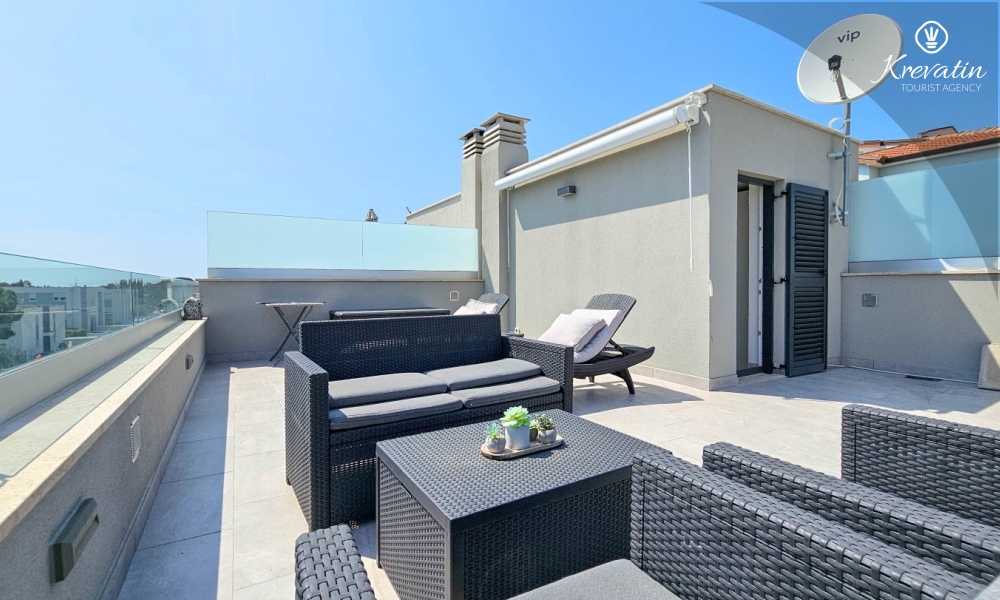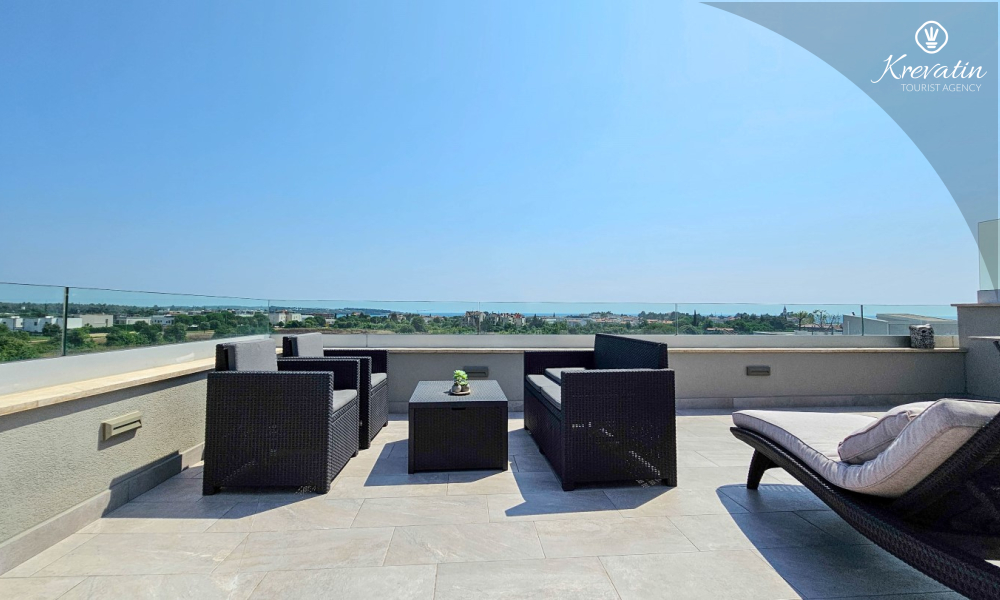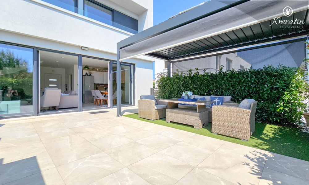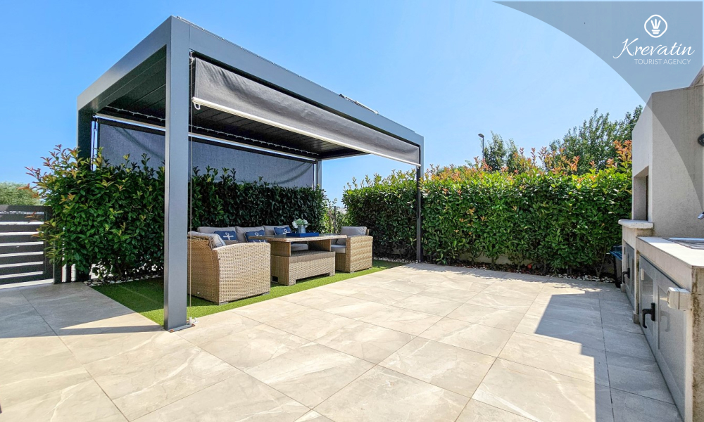 La casa si sviluppa su due piani e dispone di due ampie terrazze. La terrazza sul tetto offre una zona salotto e una vista panoramica sul porto turistico e sul centro storico, mentre la terrazza al piano terra è attrezzata con mobili da giardino e barbecue, ideale per socializzare all'aperto.
