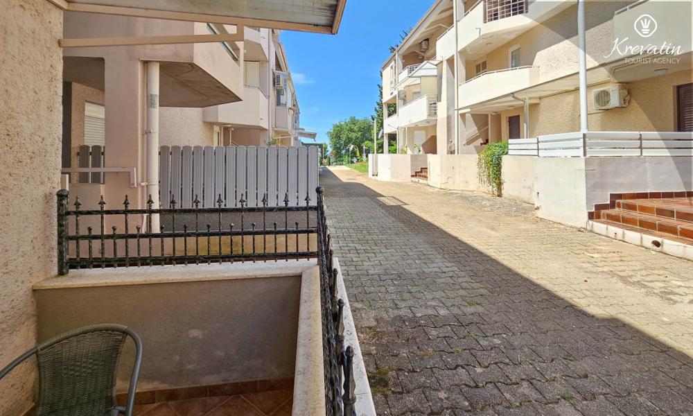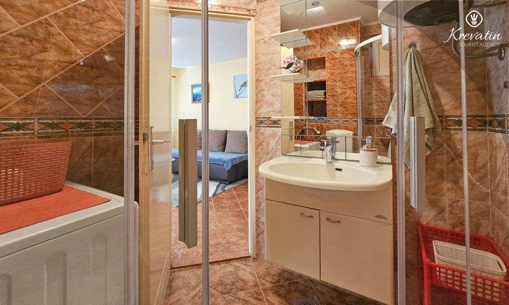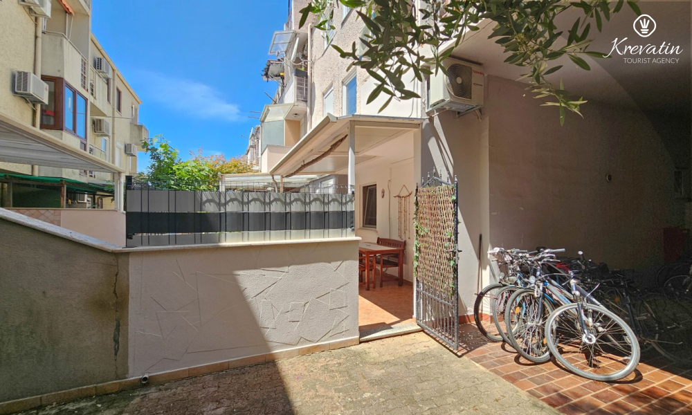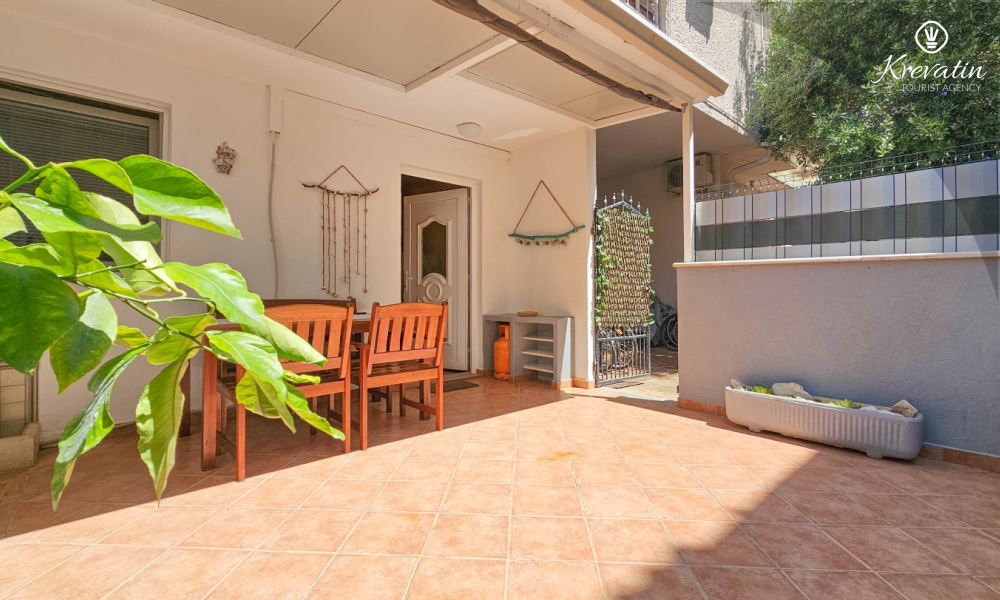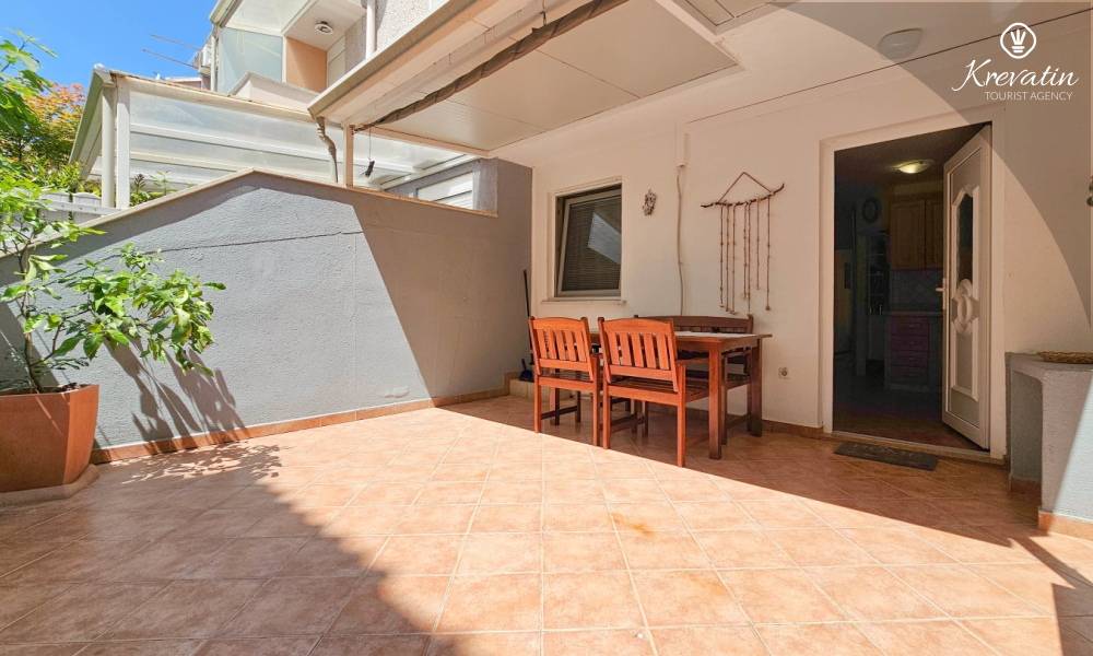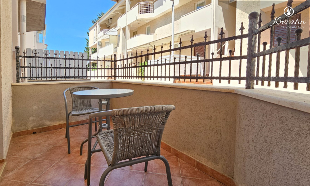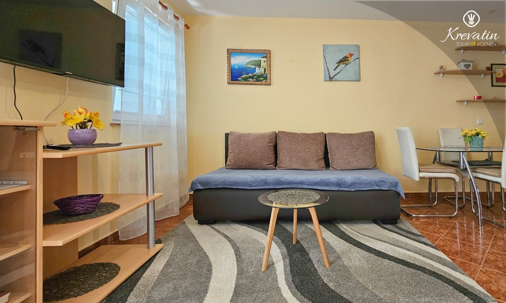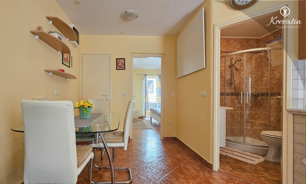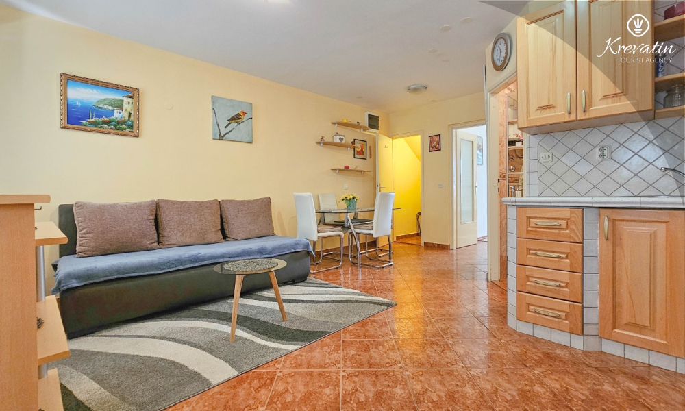L'appartamento è composto da una camera da letto, un confortevole soggiorno con cucina e sala da pranzo e una bella terrazza. Altri due ospiti possono dormire comodamente nel soggiorno. La cucina è attrezzata con l'essenziale per preparare pasti semplici e il pratico bagno è dotato di doccia, WC e lavatrice per la vostra comodità. Rilassatevi sulla terrazza attrezzata con tavolo e sedie, perfetta per un caffè mattutino o per riunioni serali. L'appartamento è dotato di TV, aria condizionata, internet, e la biancheria da letto e da bagno è disponibile senza costi aggiuntivi per un soggiorno spensierato.