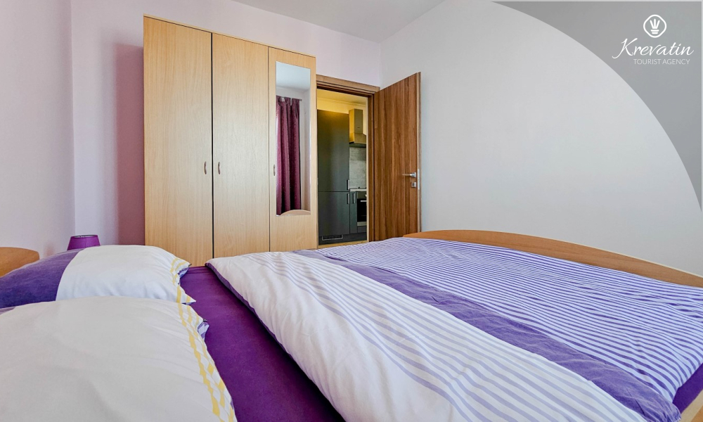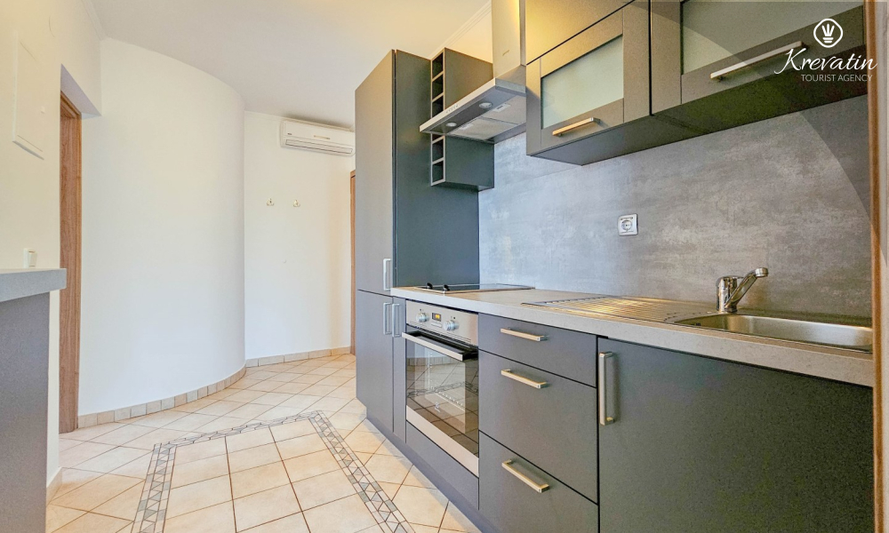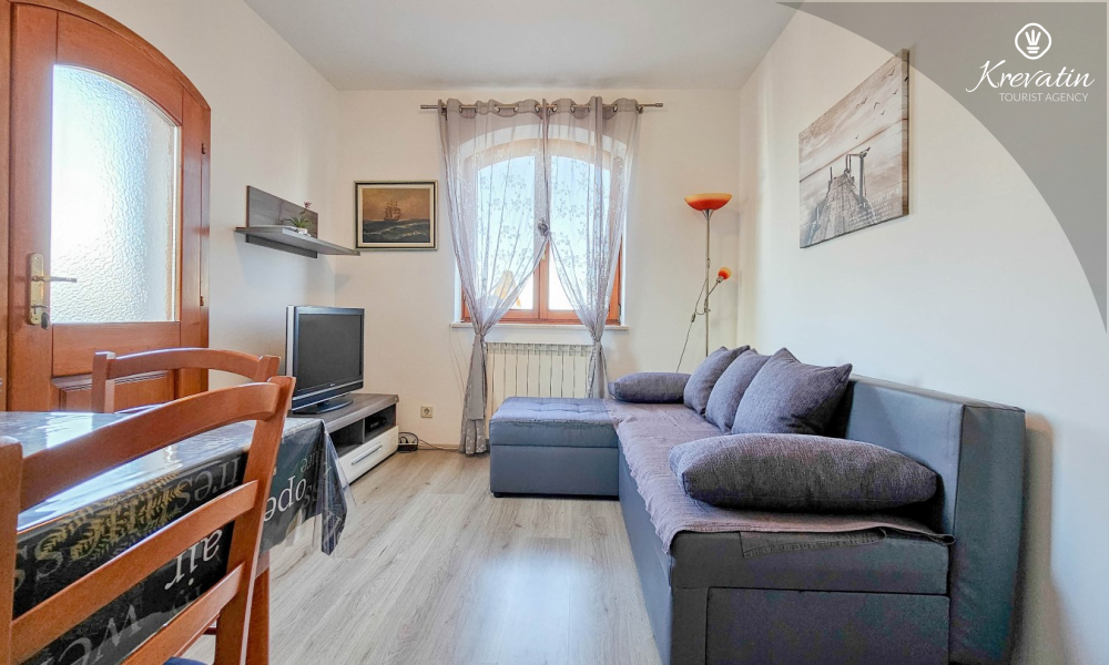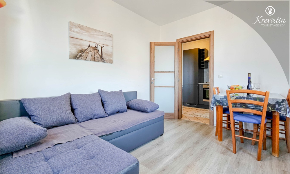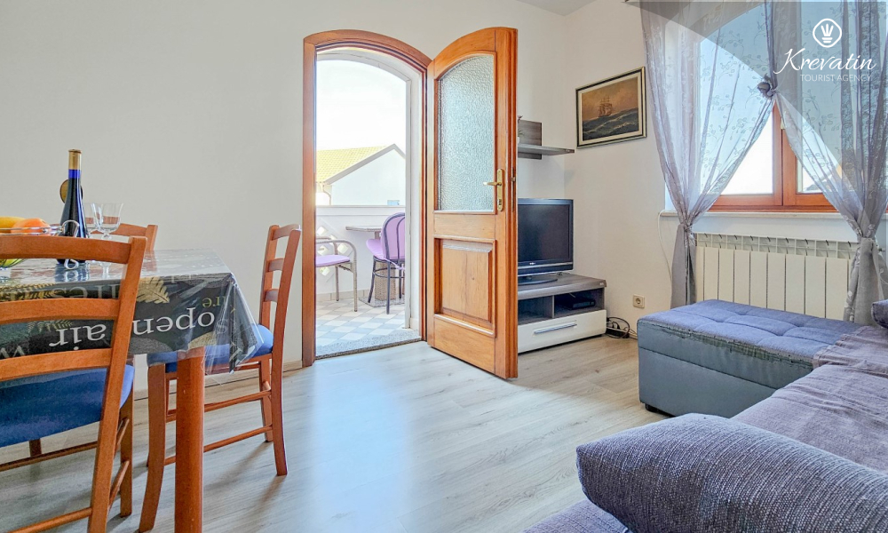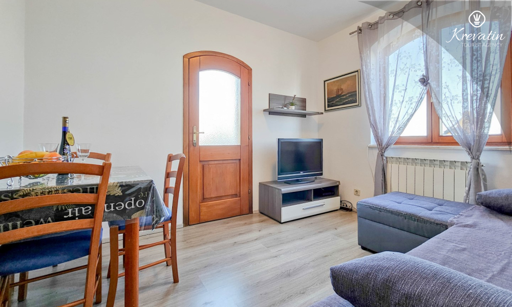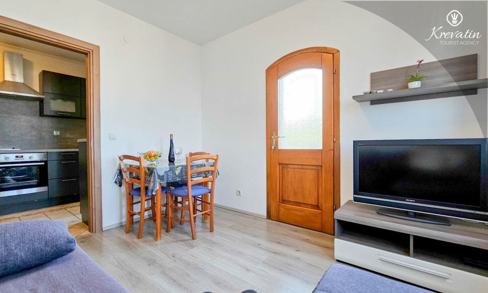 L'appartamento può ospitare fino a 3 persone e offre tutto il necessario per una vacanza rilassante. La cucina è attrezzata con le cose basilari, e l'ampio soggiorno con sala da pranzo dispone di TV e accesso al balcone con vista sul mare. Il balcone è il luogo ideale per un caffè mattutino o per il relax serale. L'appartamento è dotato di aria condizionata, internet e TV satellitare, oltre ad un pratico bagno con doccia, e la biancheria da letto e da bagno è inclusa nel prezzo.