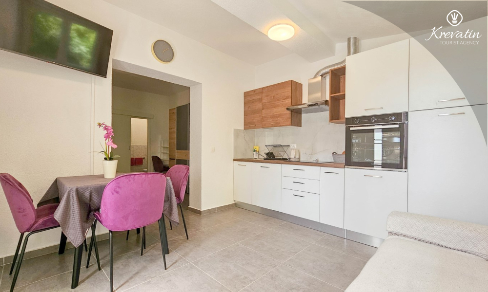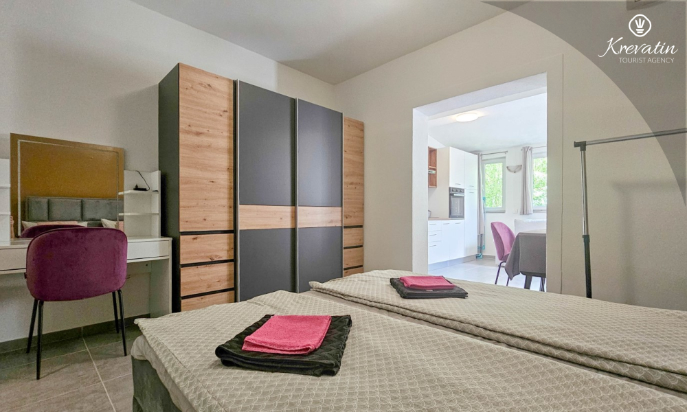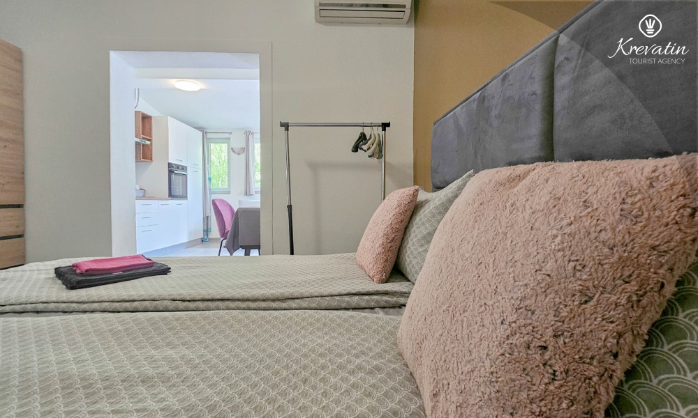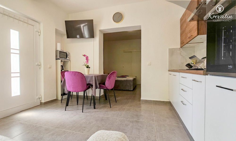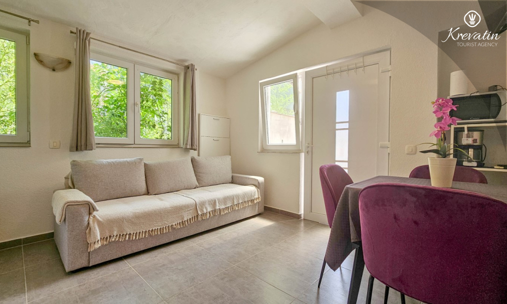 Situato al piano terra di una casa familiare in una zona tranquilla di Cittanova, questo accogliente monolocale è perfetto per due persone che desiderano una vacanza rilassante. L'ambiente, arredato in modo pratico, offre tutto il necessario: una cucina con tavolo da pranzo, una camera da letto con un comodo letto matrimoniale e un bagno con doccia.