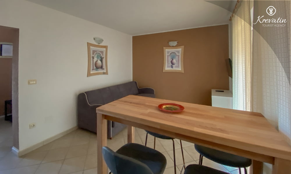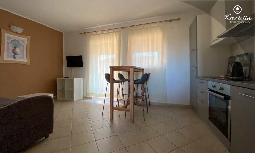 L'appartamento è composto da una camera da letto, un soggiorno con cucina e zona pranzo e un pratico bagno con doccia e WC. Il soggiorno dispone di un letto supplementare per un'altra persona e di una terrazza arredata, ideale per godersi l'aria aperta.