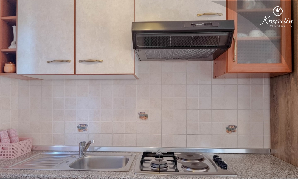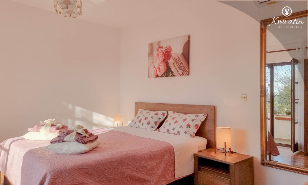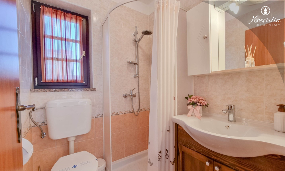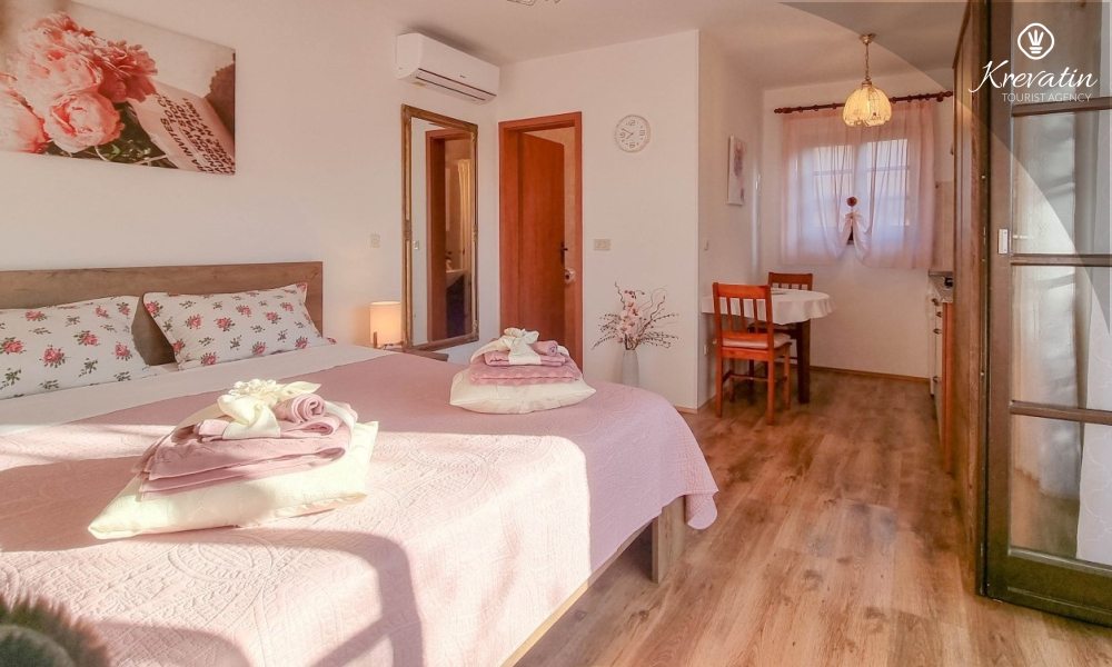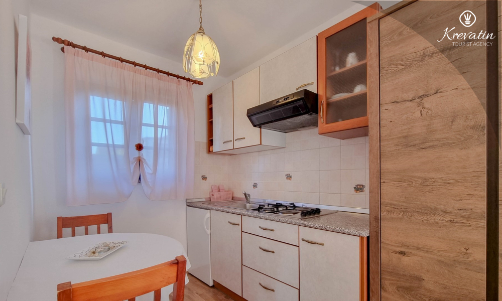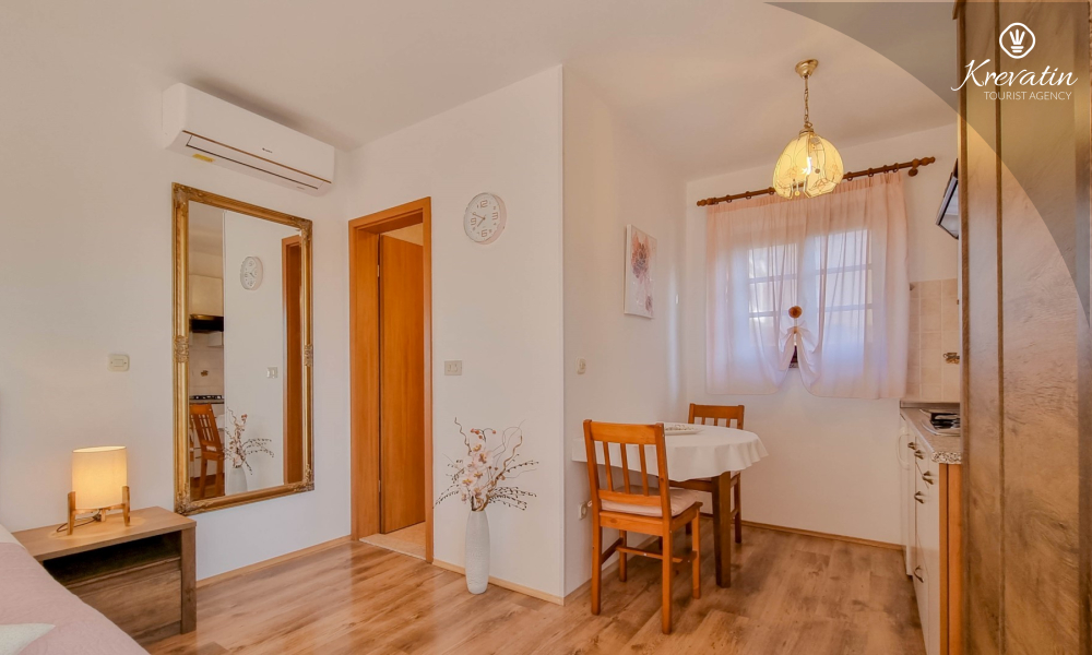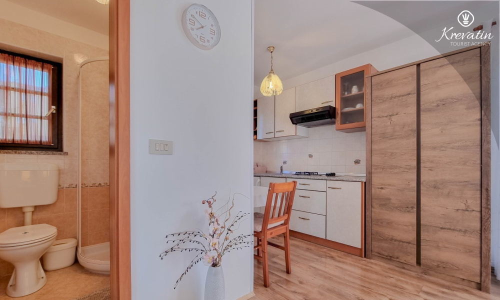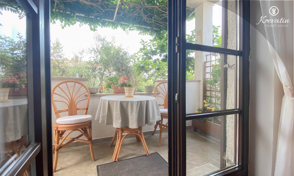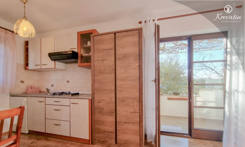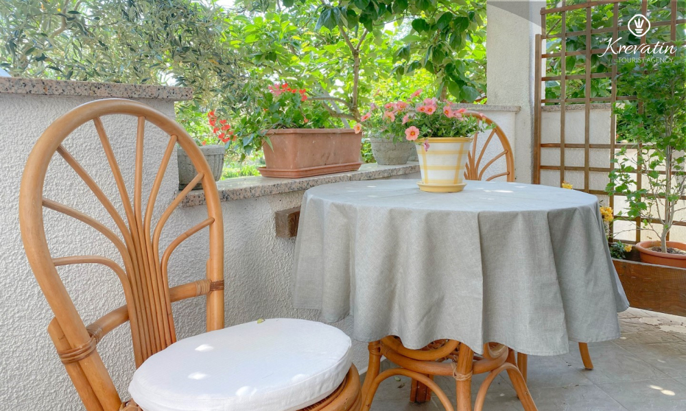 L'appartamento dispone di un letto matrimoniale, una cucina attrezzata con utensili essenziali per preparare pasti semplici e un bagno con doccia e WC. L'ampia terrazza con tavolo e sedie è perfetta per fare colazione all'aria aperta o per rilassarsi la sera.