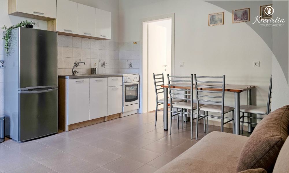 È composto da una camera da letto, un soggiorno con divano letto e una cucina attrezzata con tutto il necessario. Gli ospiti hanno a disposizione un pratico bagno con doccia e WC, nonché una comoda terrazza attrezzata con tavolo e sedie, ideale per rilassarsi all'aperto.