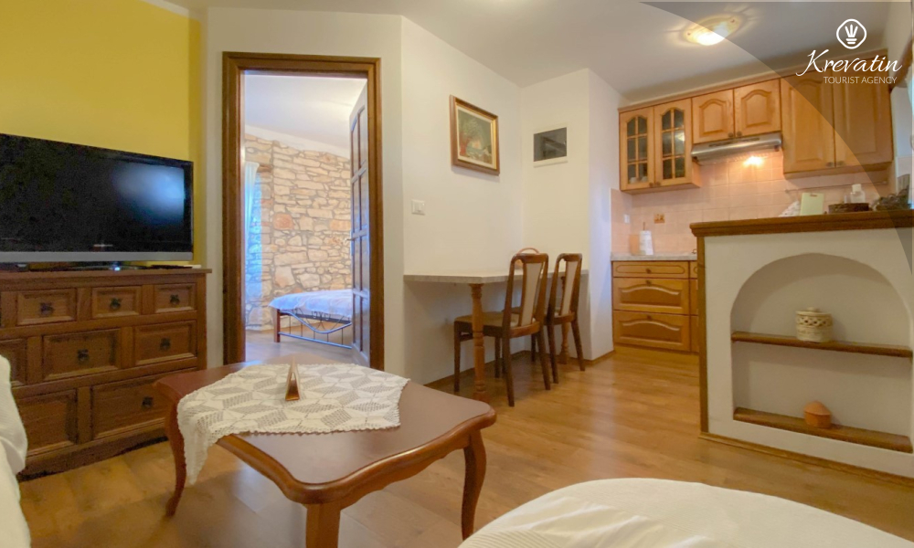 L'appartamento è composto da una camera da letto, una cucina con zona pranzo dotata di comfort di base e un bagno con doccia e WC. Gli ospiti hanno inoltre accesso a un giardino in comune e a una piscina esterna, a disposizione di tutti gli ospiti della casa.