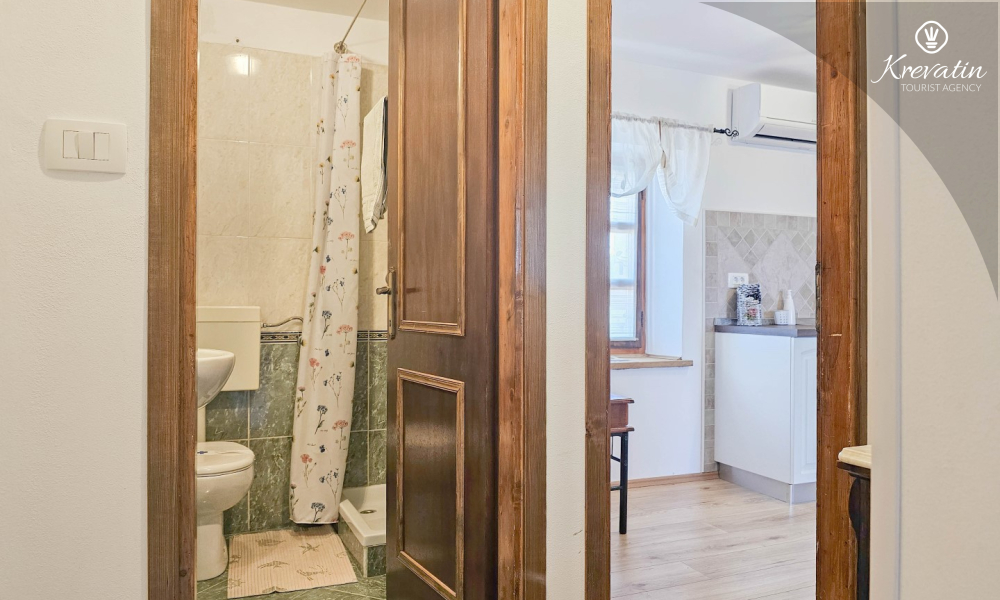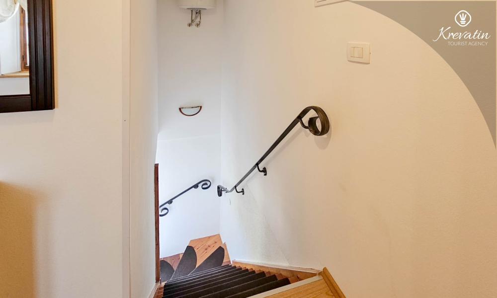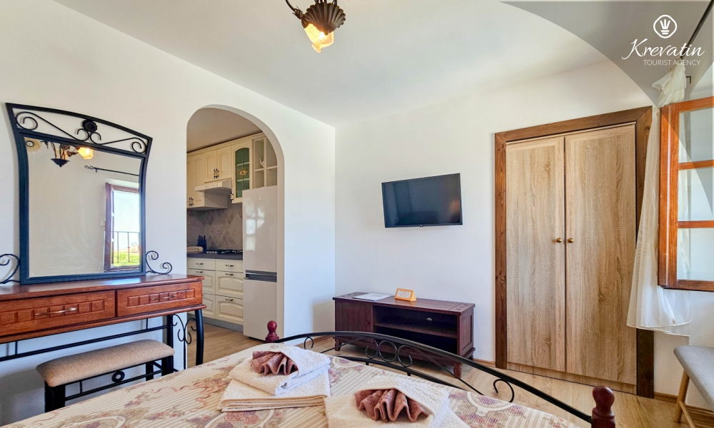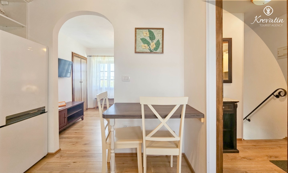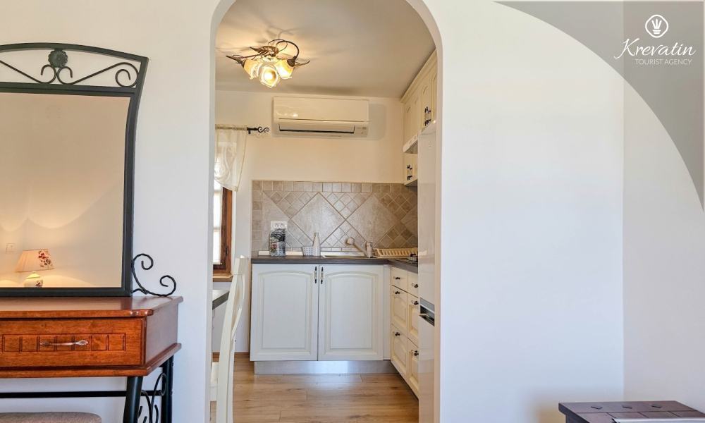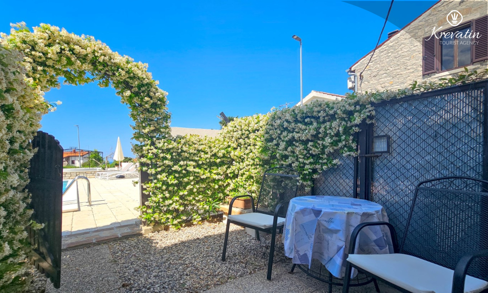 L'appartamento dispone di un letto matrimoniale, una cucina attrezzata con utensili essenziali per la preparazione dei pasti e un bagno con doccia e WC. Al piano terra si trova una terrazza privata con vista sulla piscina, a disposizione di tutti gli ospiti della casa.