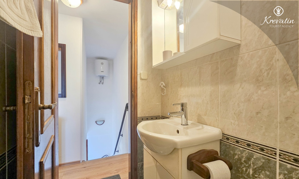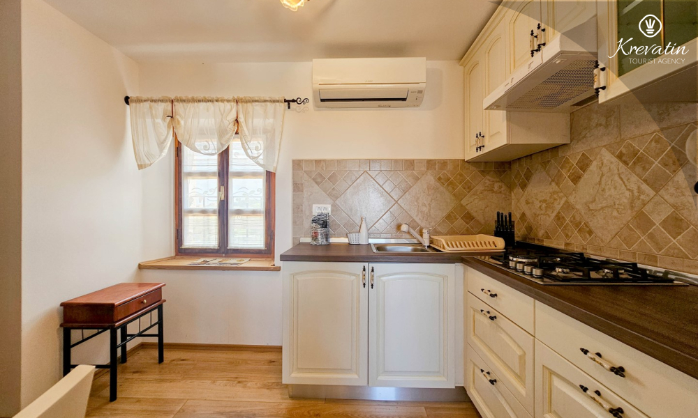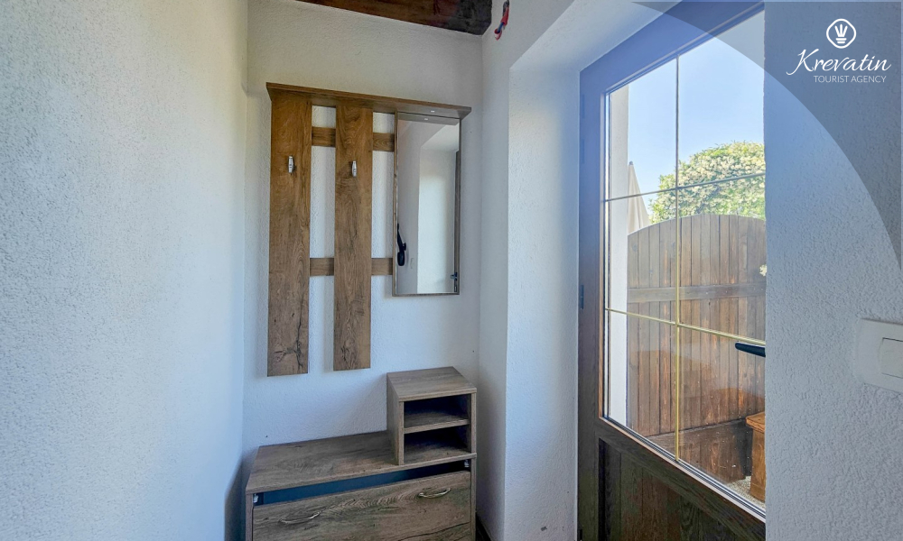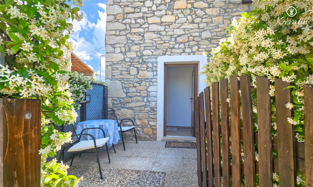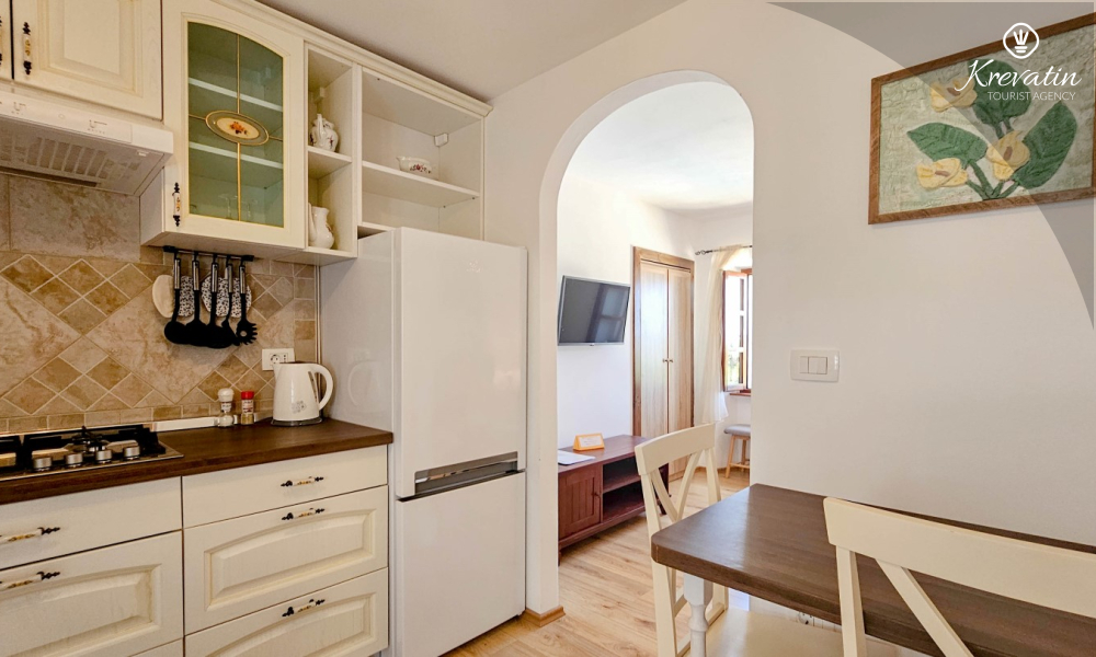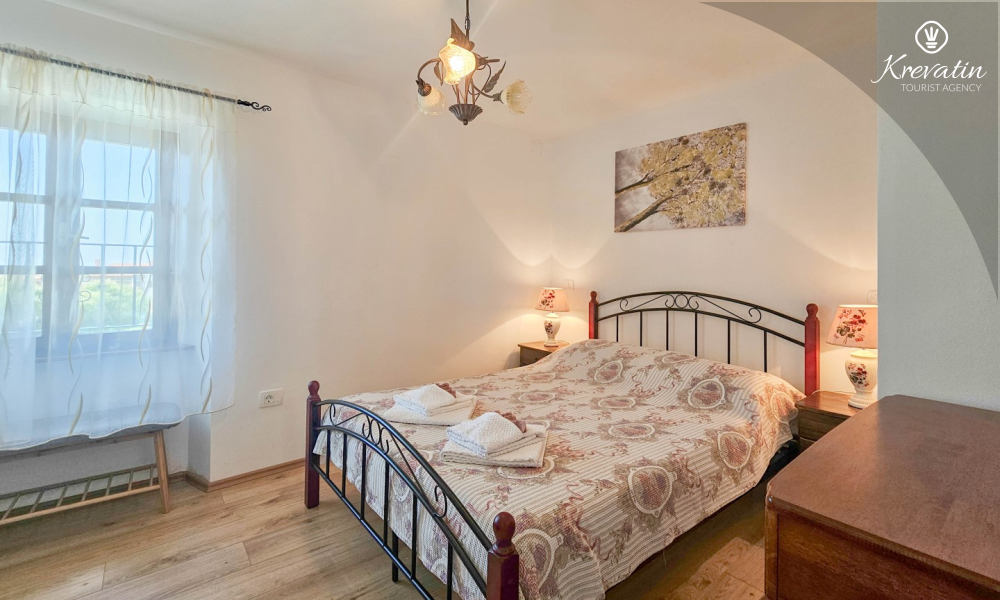 L'appartamento dispone di un letto matrimoniale, una cucina attrezzata con utensili essenziali per la preparazione dei pasti e un bagno con doccia e WC. Al piano terra si trova una terrazza privata con vista sulla piscina, a disposizione di tutti gli ospiti della casa.