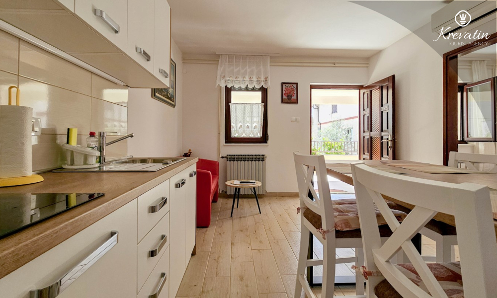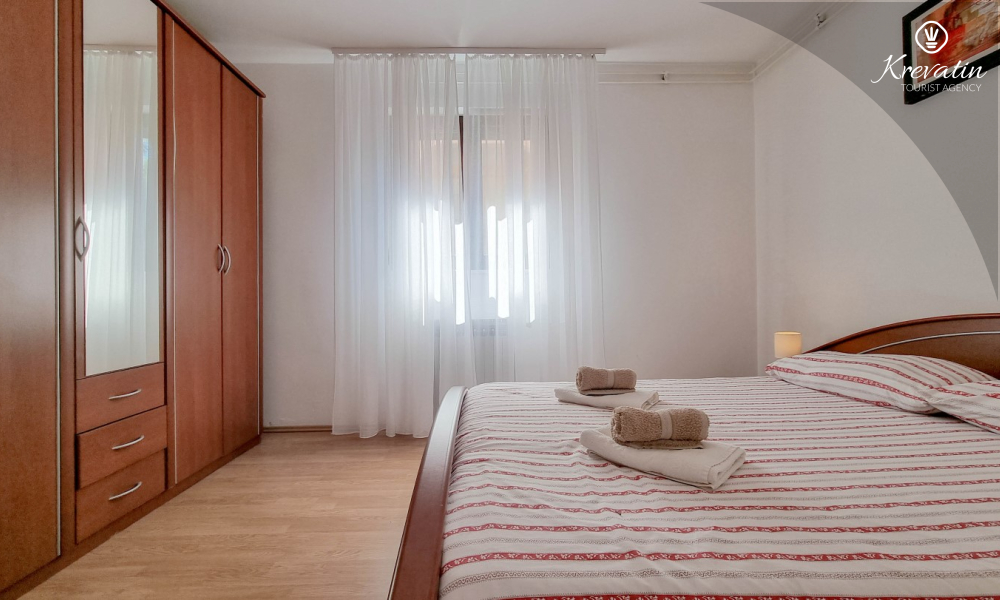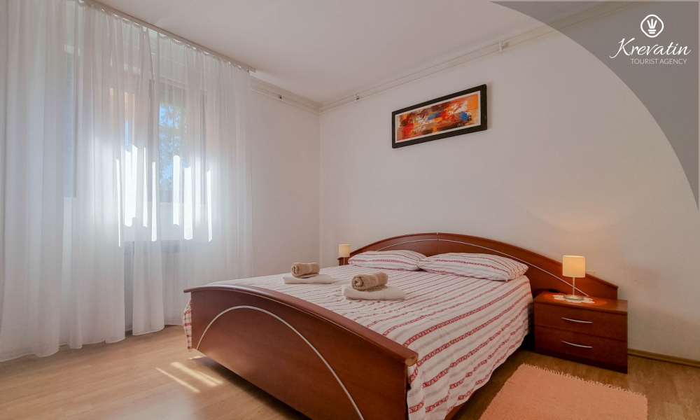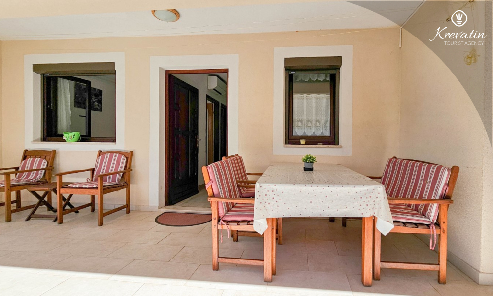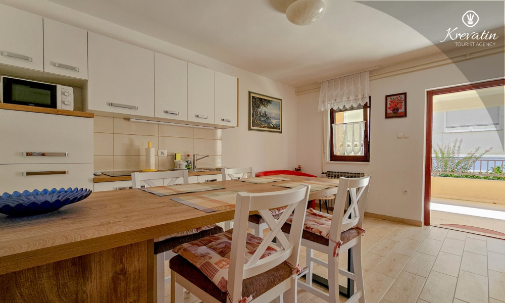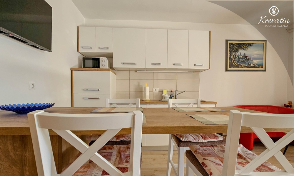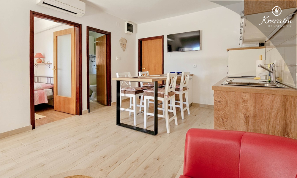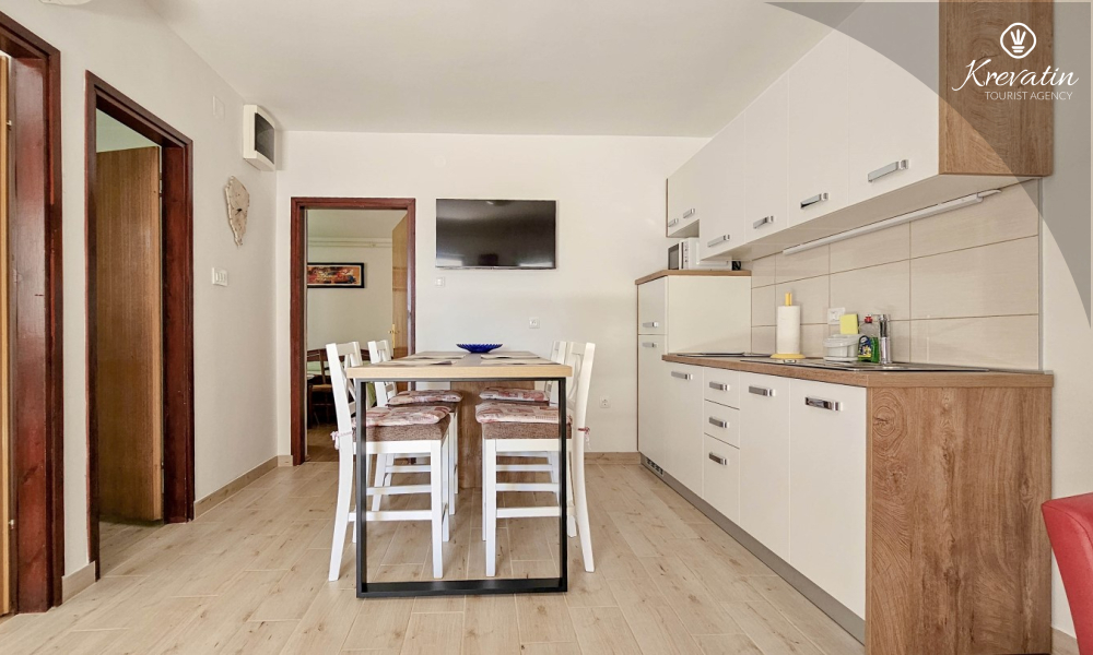 È composto da due camere da letto, una cucina funzionale attrezzata con utensili di base per la preparazione dei pasti e un bagno con doccia e WC. L'appartamento dispone di un'ampia terrazza con tavolo e sedie, oltre a un'ulteriore terrazza con barbecue in comune con gli ospiti di un altro appartamento.