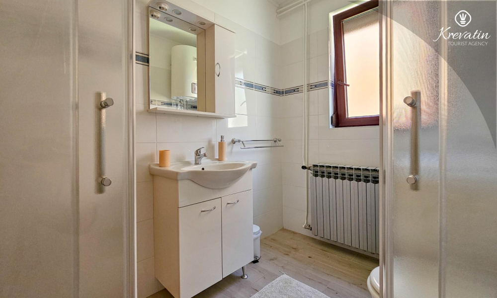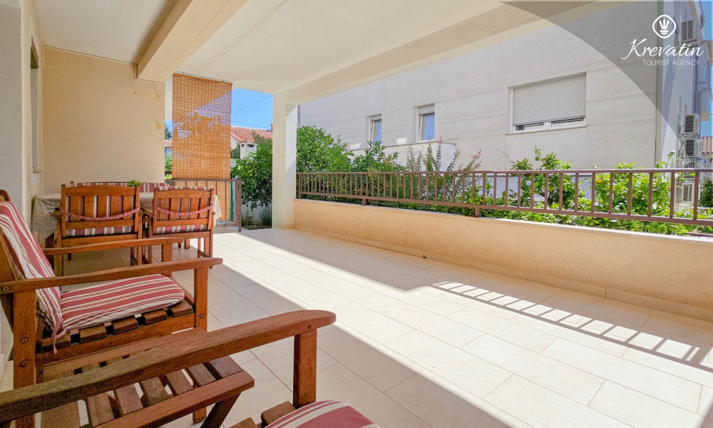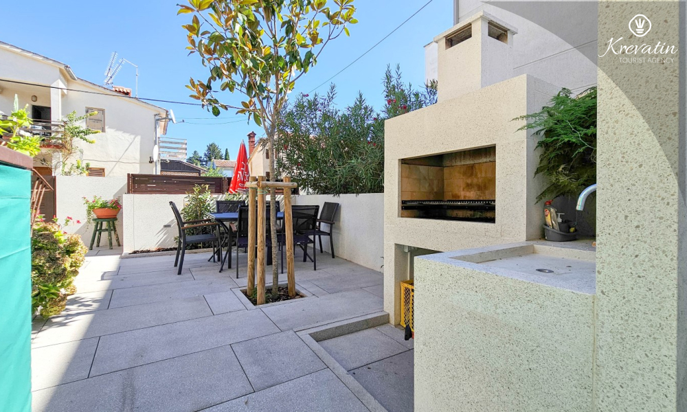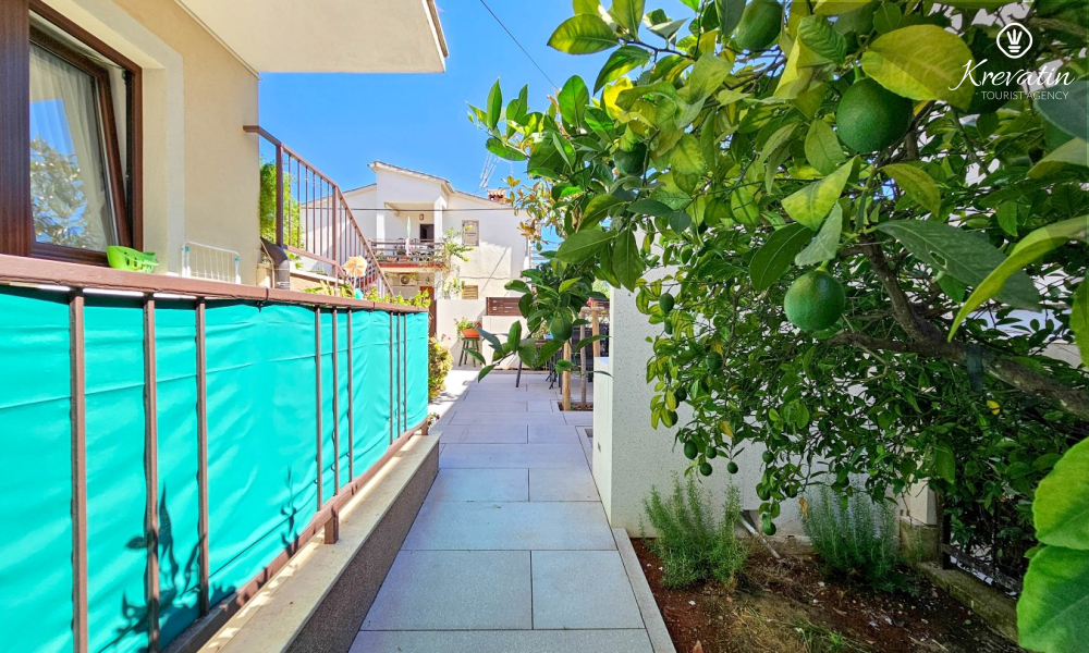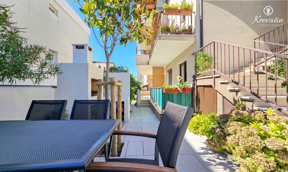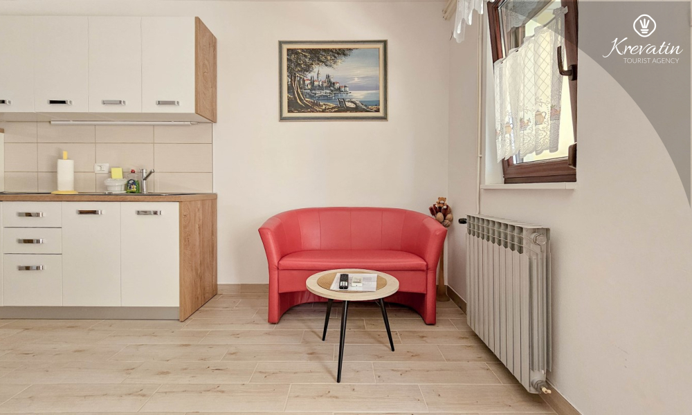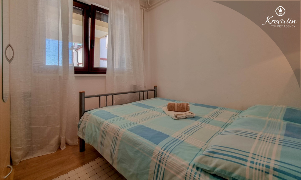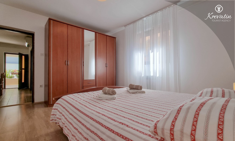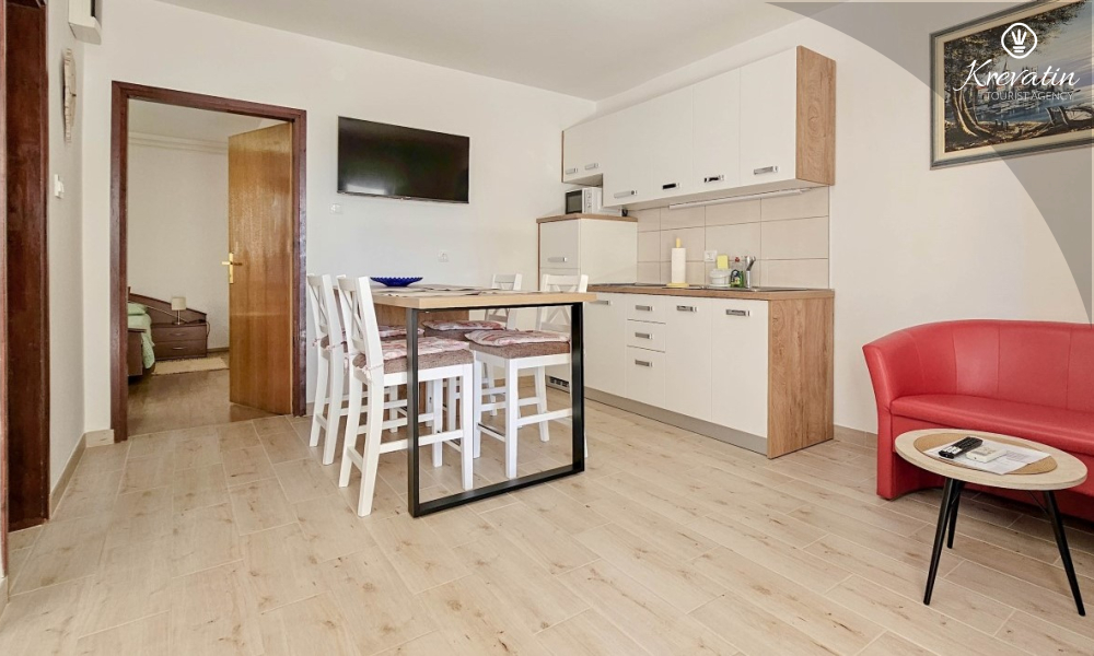 È composto da due camere da letto, una cucina funzionale attrezzata con utensili di base per la preparazione dei pasti e un bagno con doccia e WC. L'appartamento dispone di un'ampia terrazza con tavolo e sedie, oltre a un'ulteriore terrazza con barbecue in comune con gli ospiti di un altro appartamento.