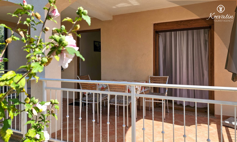 L'appartamento offre due camere da letto, un soggiorno con divano letto, una cucina completamente attrezzata con zona pranzo e un bagno con doccia e WC. Dispone di una terrazza con tavolo e sedie dove potrete gustare il caffè del mattino o socializzare la sera all'aperto.