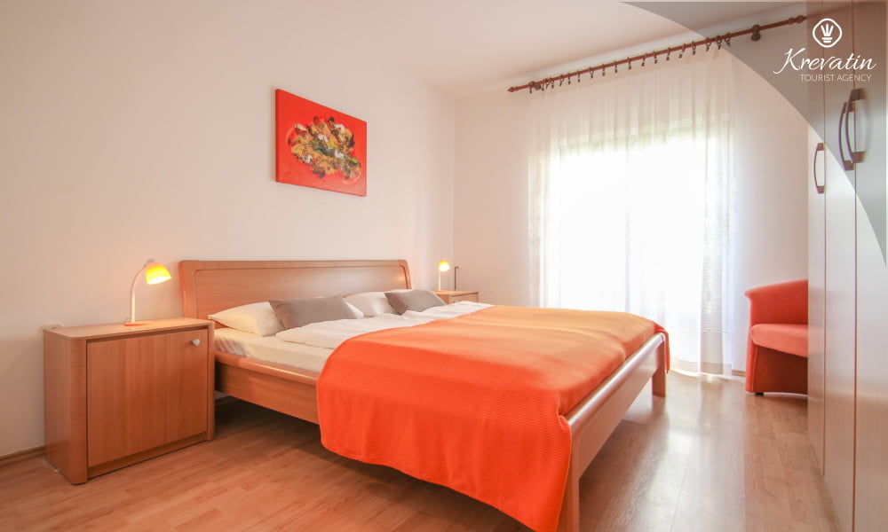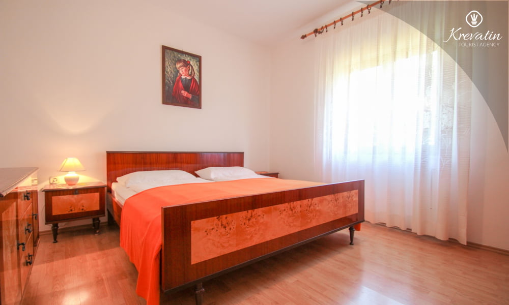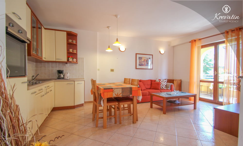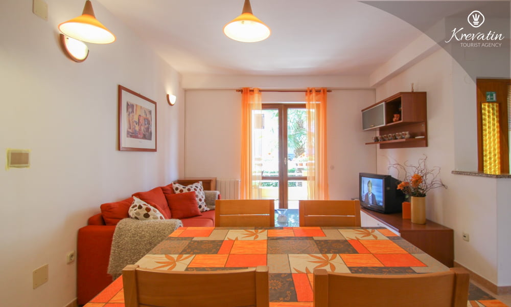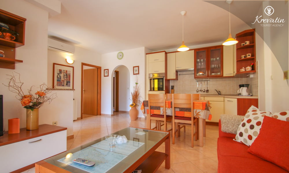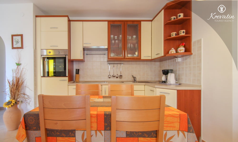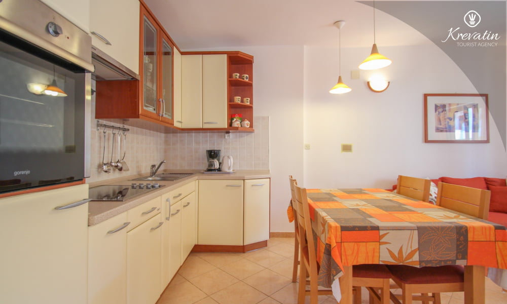 È composto da due camere da letto, un soggiorno e una cucina ben attrezzata con zona pranzo. La cucina è dotata di tutto il necessario per preparare pasti semplici. L'appartamento dispone inoltre di un bagno con doccia e WC e di una terrazza con tavolo e sedie, ideale per rilassarsi e gustare i pasti all'aperto. Il giardino e la terrazza con barbecue sono in comune con gli altri ospiti degli altri appartamenti, offrendo così l'opportunità di socializzare.