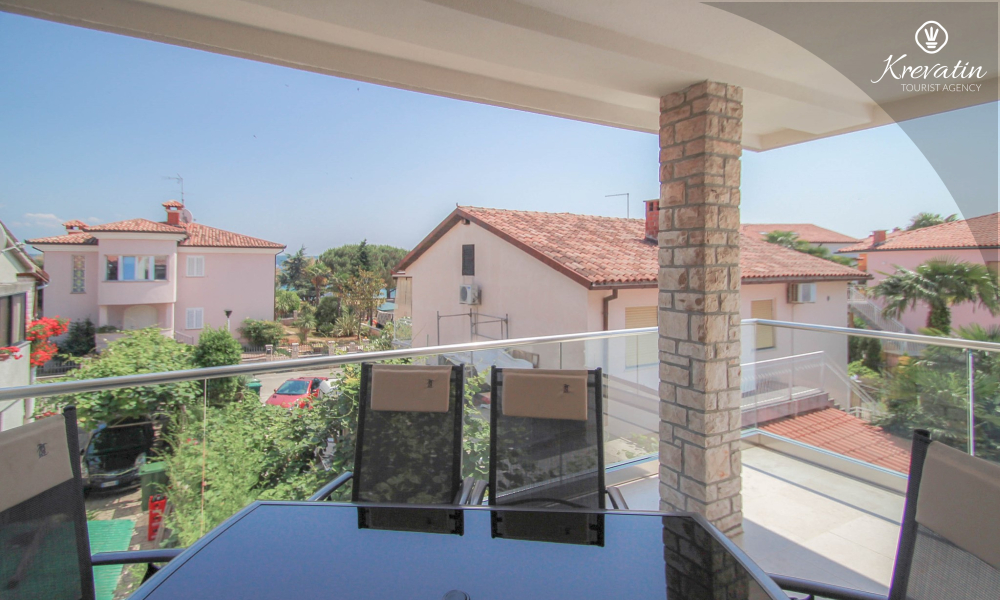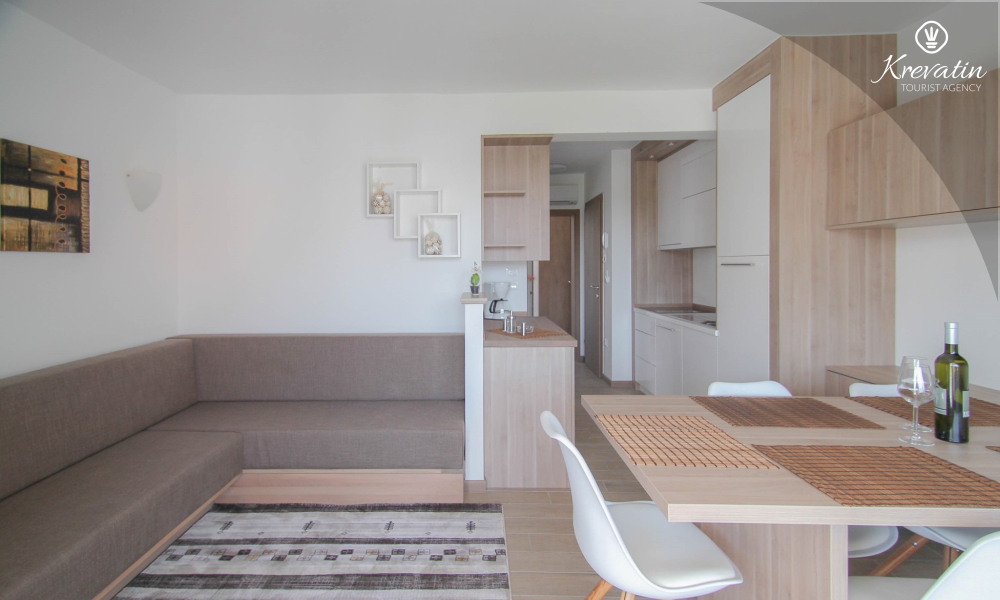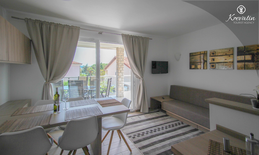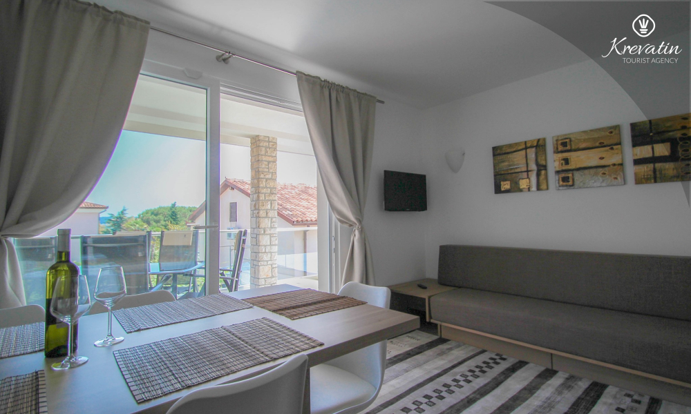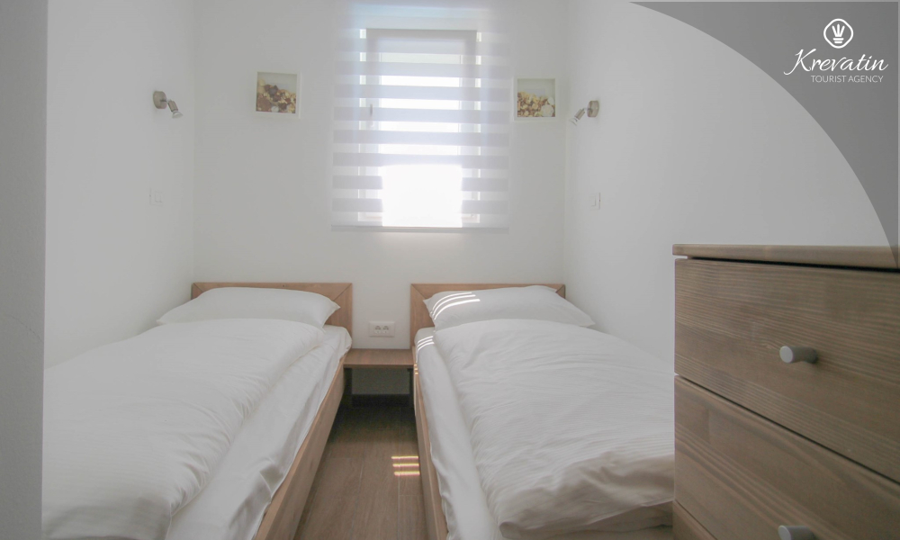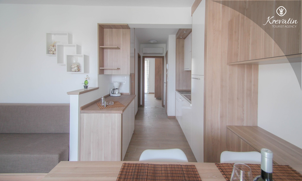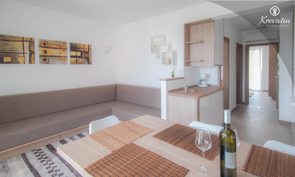 Questo appartamento per 4 fino a 6 persone si trova al primo piano ed è composto da due camere da letto (una con un letto matrimoniale e una con due letti singoli) e un soggiorno con un divano letto e con la cucina. La cucina è attrezzata con piano cottura elettrico, frigorifero, lavastoviglie e macchina per il caffè. C'è anche unbagno con la doccia e un balcone con mobili. Inoltre c'è una piscina pre uso in comune. SAT-TV, aria condizionata, WiFi, lenzuola e asciugamani sono inclusi nel prezzo. Animali domestici sono ammessi e a pagamento.