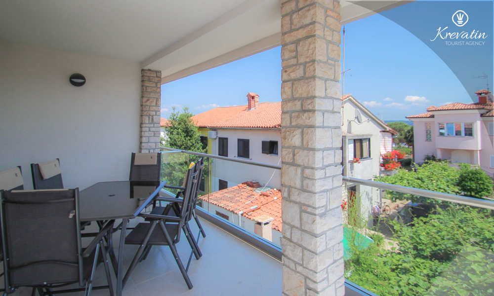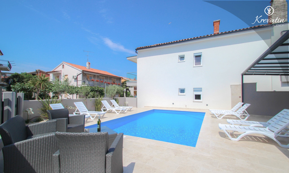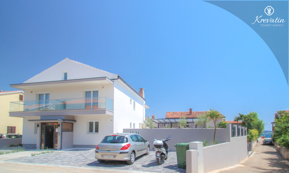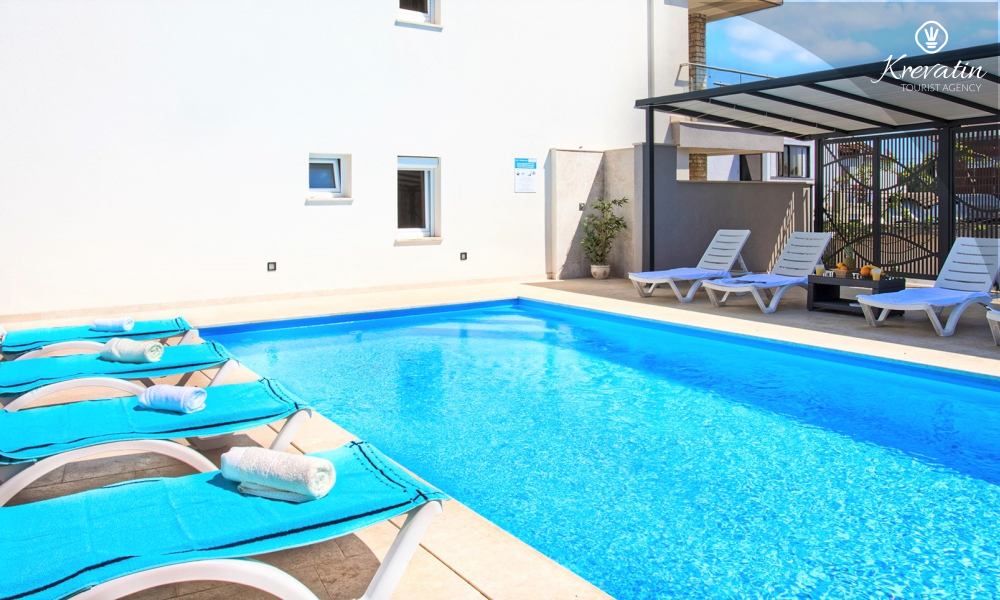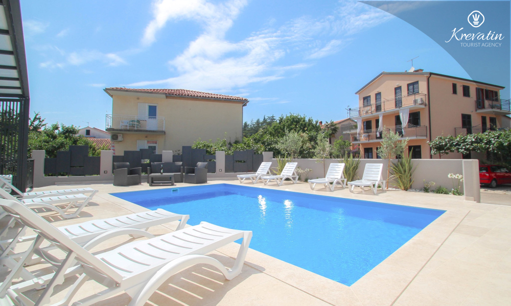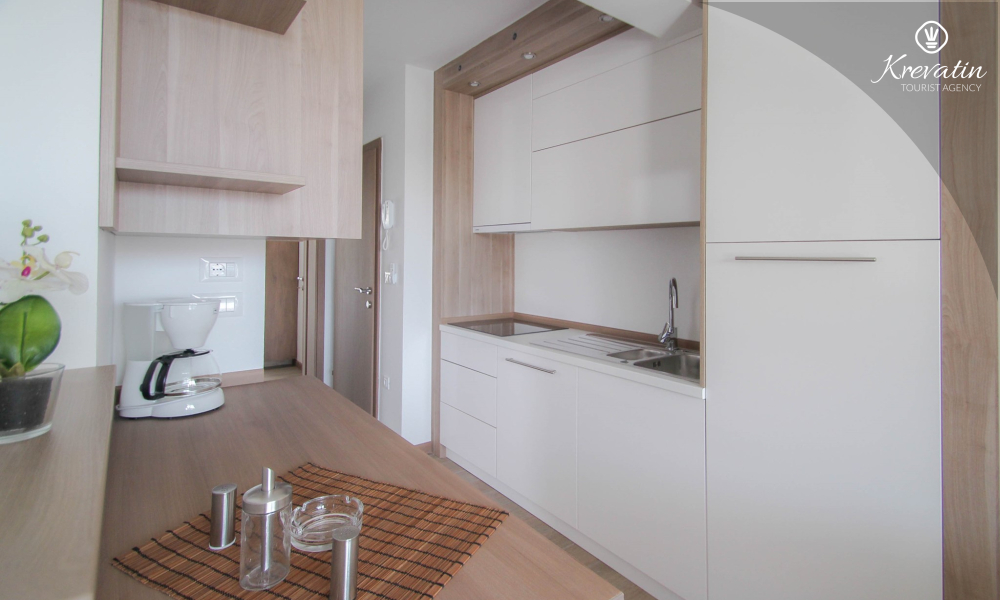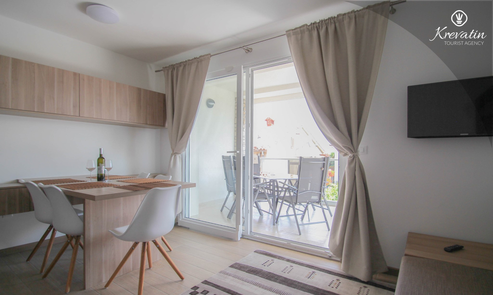Questo appartamento per 4 fino a 6 persone si trova al primo piano ed è composto da due camere da letto (una con un letto matrimoniale e una con due letti singoli) e un soggiorno con un divano letto e con la cucina. La cucina è attrezzata con piano cottura elettrico, frigorifero, lavastoviglie e macchina per il caffè. C'è anche unbagno con la doccia e un balcone con mobili. Inoltre c'è una piscina pre uso in comune. SAT-TV, aria condizionata, WiFi, lenzuola e asciugamani sono inclusi nel prezzo. Animali domestici sono ammessi e a pagamento.