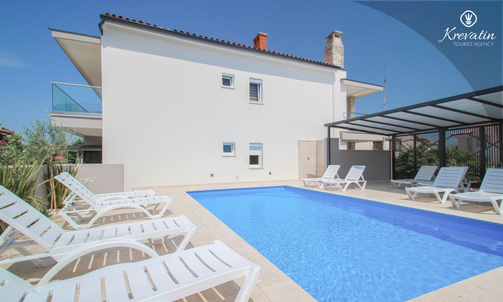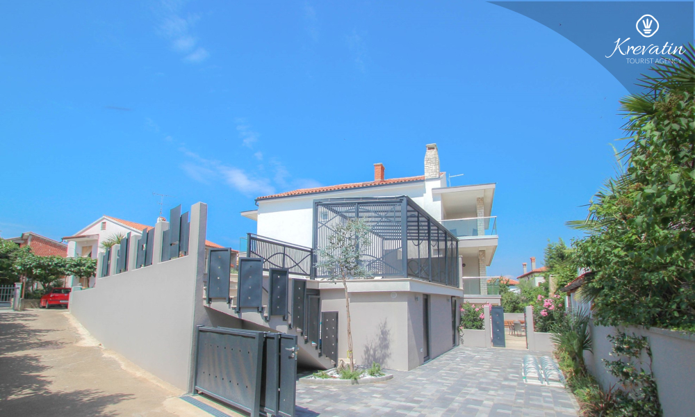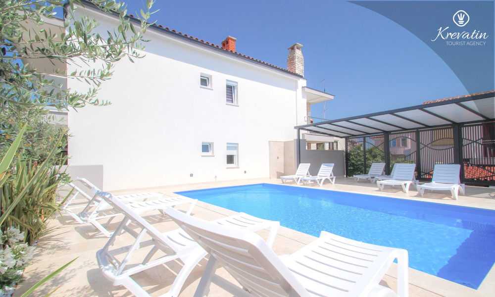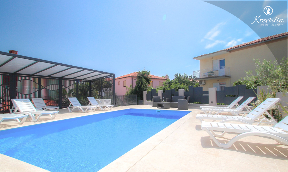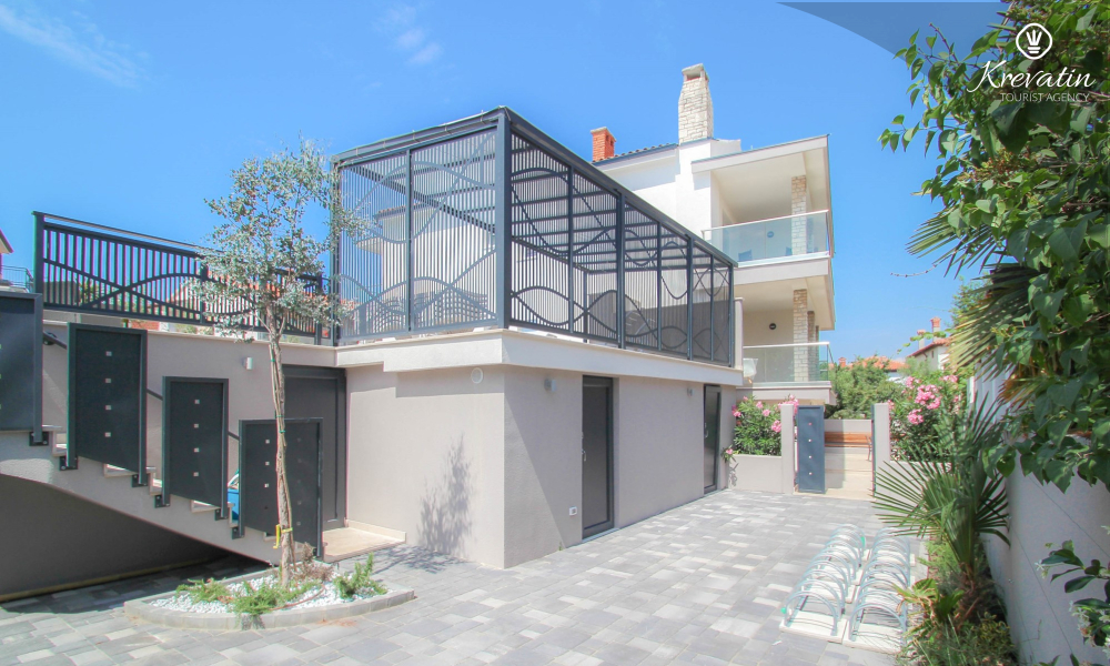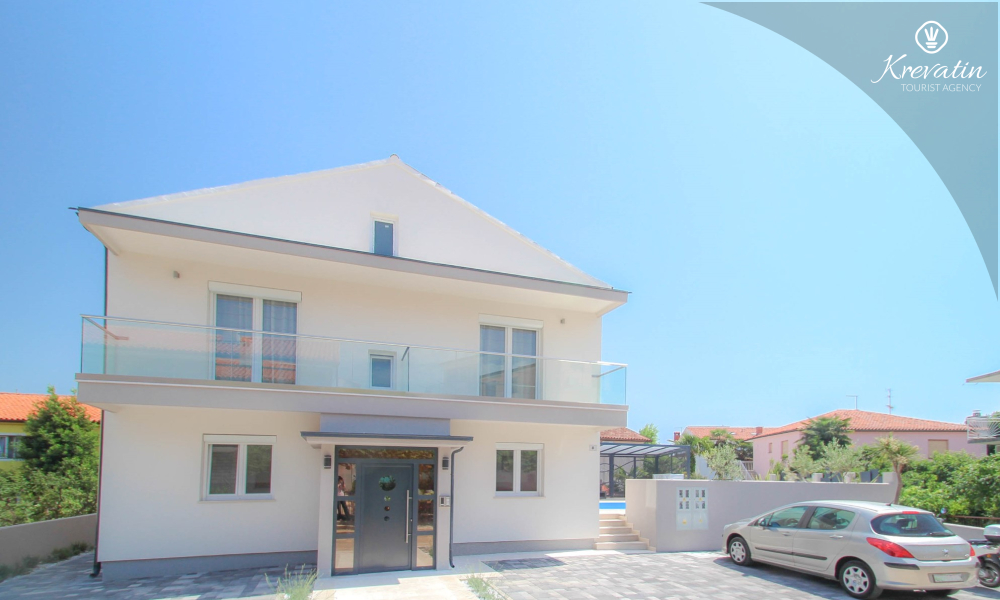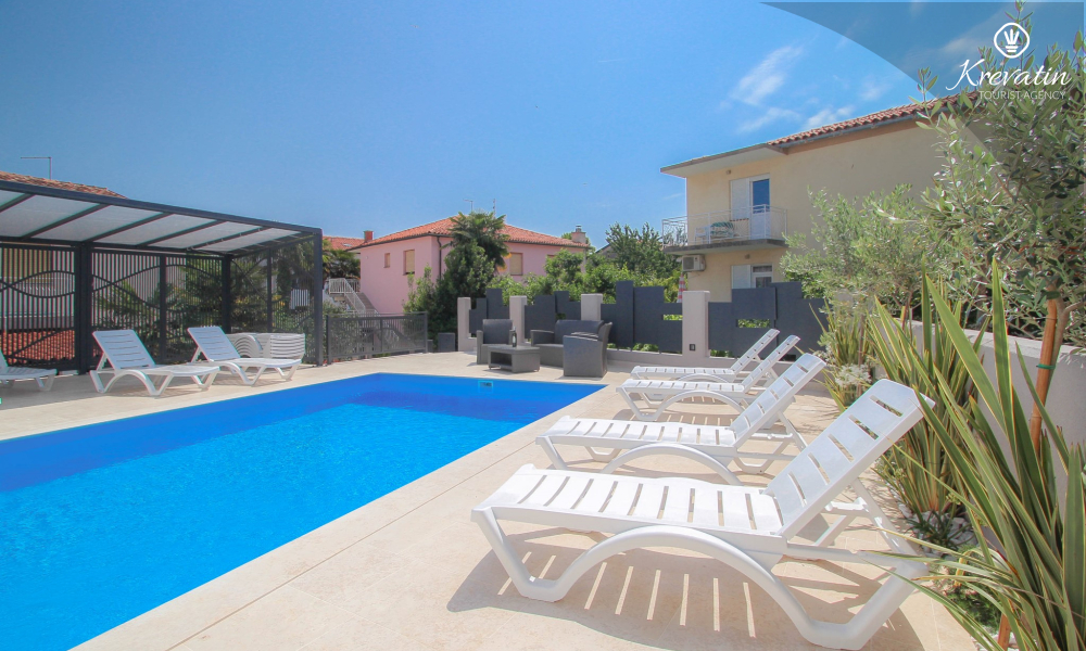 Questo appartamento per 4 fino a 6 persone si trova al primo piano ed è composto da due camere da letto (una con un letto matrimoniale e una con due letti singoli) e un soggiorno con un divano letto e con la cucina. La cucina è attrezzata con piano cottura elettrico, frigorifero, lavastoviglie e macchina per il caffè. C'è anche unbagno con la doccia e un balcone con mobili. Inoltre c'è una piscina pre uso in comune. SAT-TV, aria condizionata, WiFi, lenzuola e asciugamani sono inclusi nel prezzo. Animali domestici sono ammessi e a pagamento.