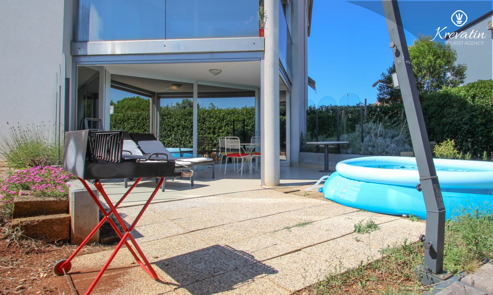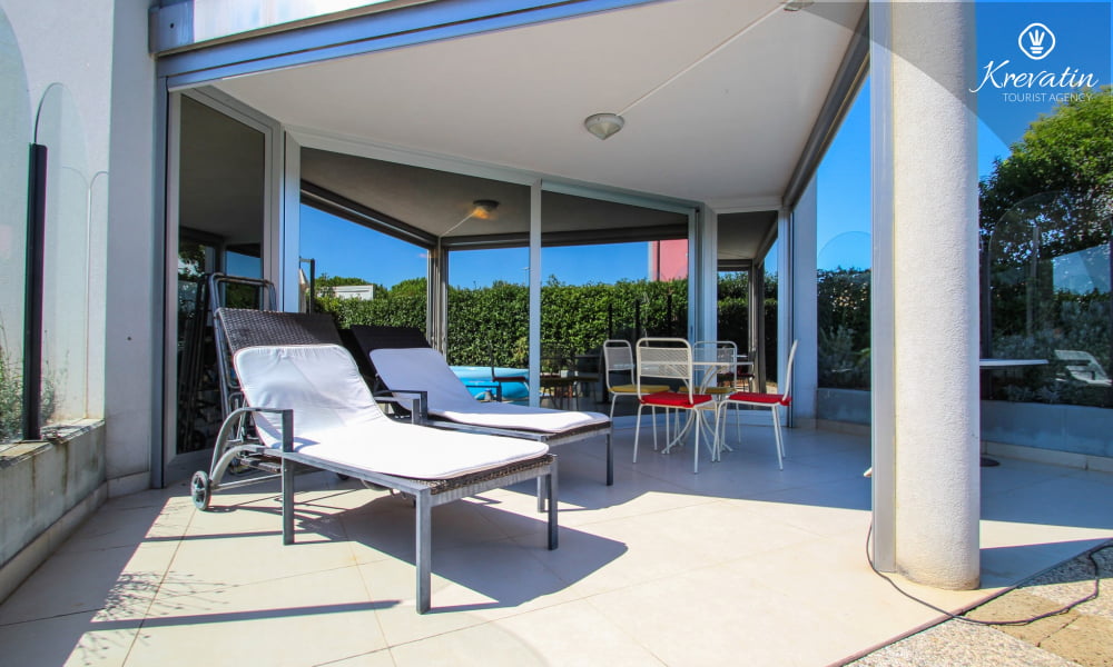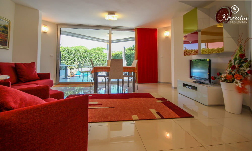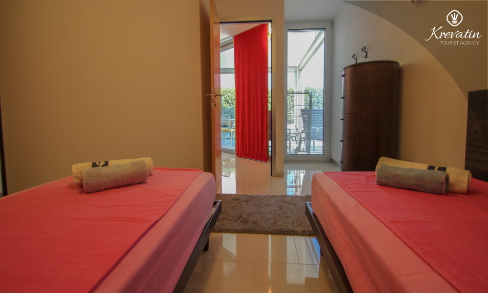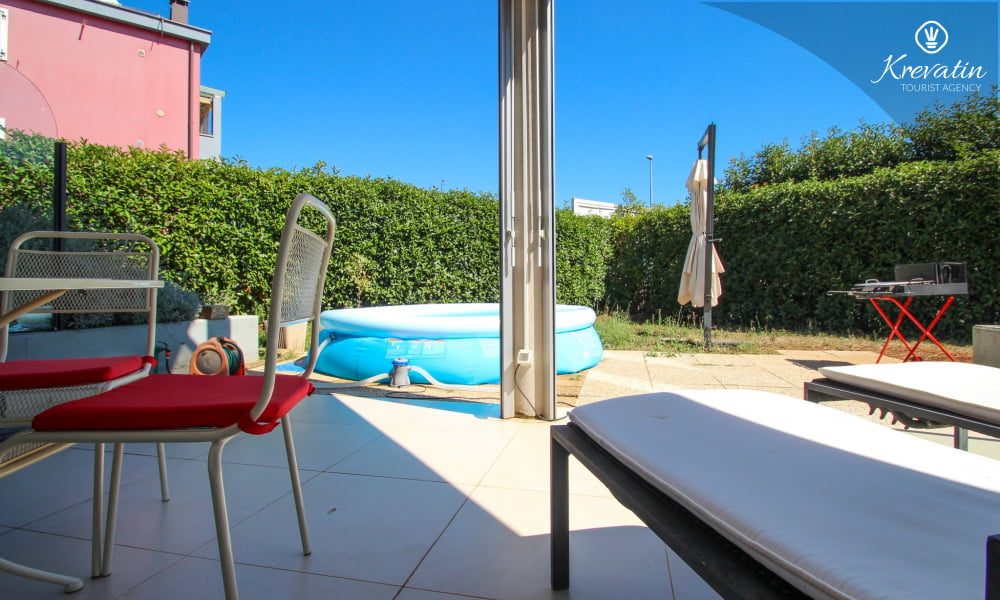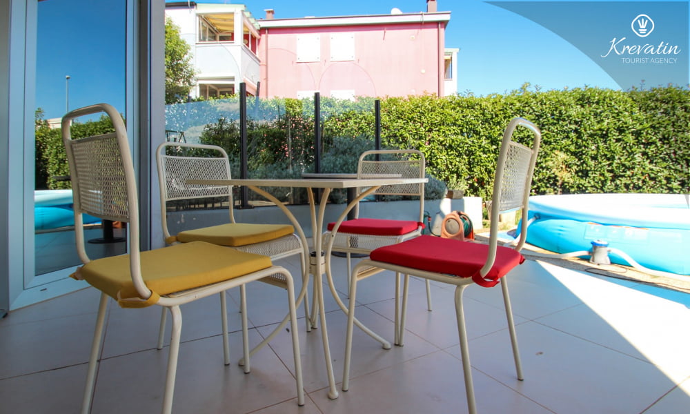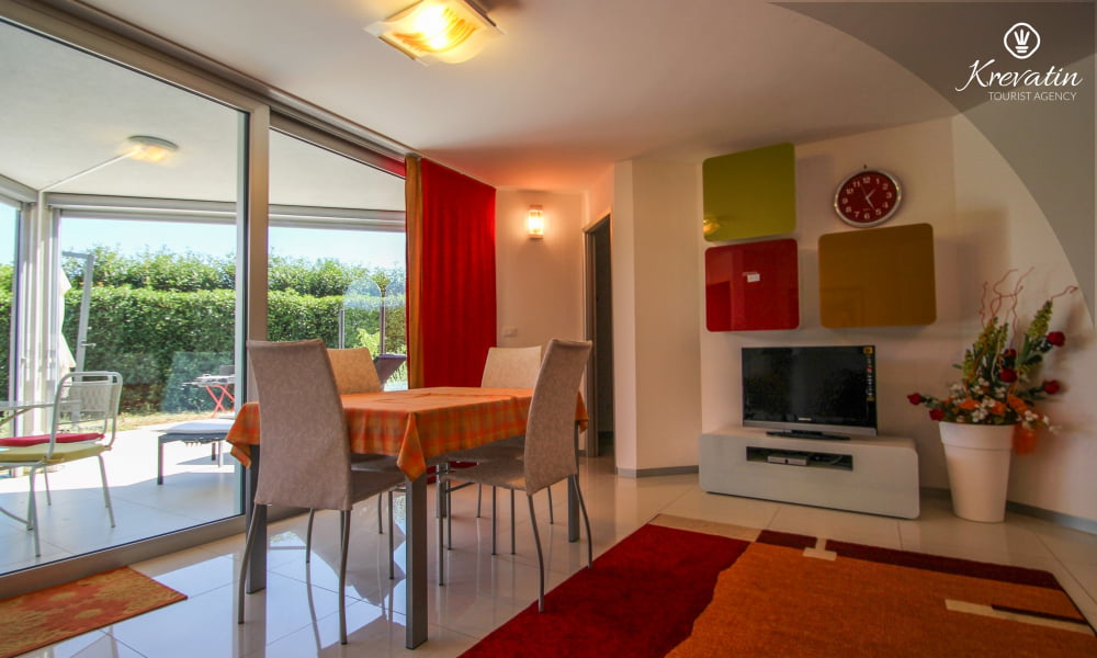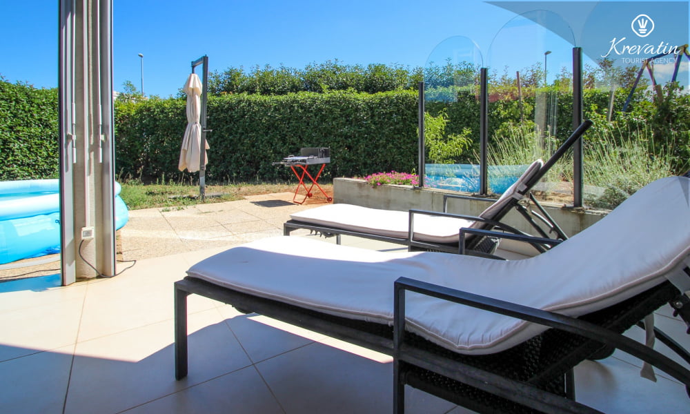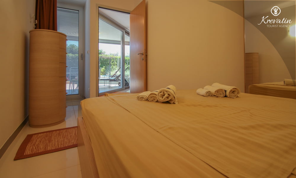Questo appartamento per 4 persone, situato al piano terra, è composto da due camere da letto, un soggiorno e una cucina. La cucina è attrezzata con piano cottura elettrico, forno, lavastoviglie, frigorifero e macchina per il caffè. C'è anche un bagno con doccia, un terrazzo con mobili e giradino. SAT-TV, aria condizionata, WLAN e lenzuola sono inclusi nel prezzo. Animali domestici sono ammessi e a pagamento.