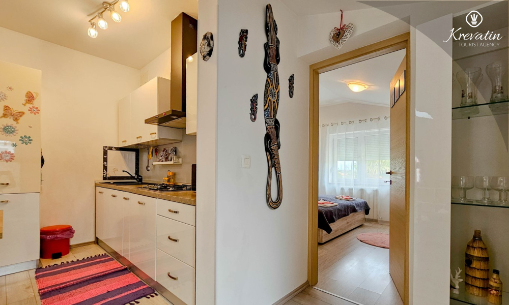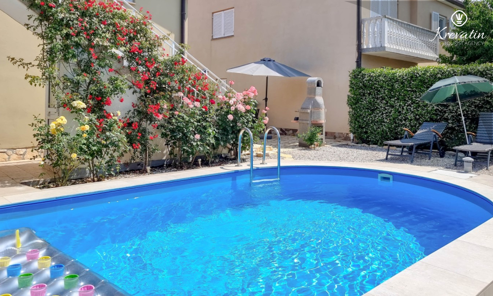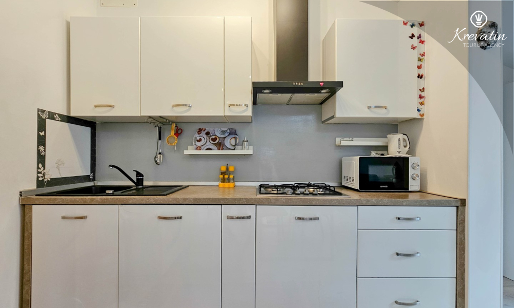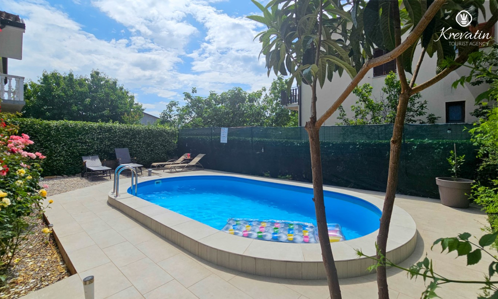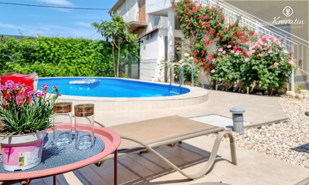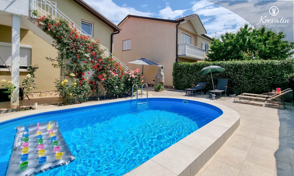 L'appartamento è composto da due comode camere da letto, un ampio soggiorno, un balcone con una bellissima vista e una cucina moderna dotata di tutti gli elettrodomestici necessari, tra cui fornello a gas/elettrico, forno, lavastoviglie, frigorifero, forno a microonde e macchina per il caffè. Nel nostro cortile recintato troverete una piscina privata con sedie a sdraio, doccia esterna e barbecue, il luogo perfetto per godersi le giornate soleggiate e le calde serate.