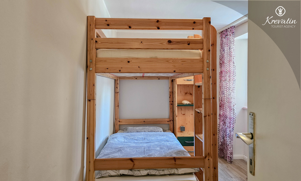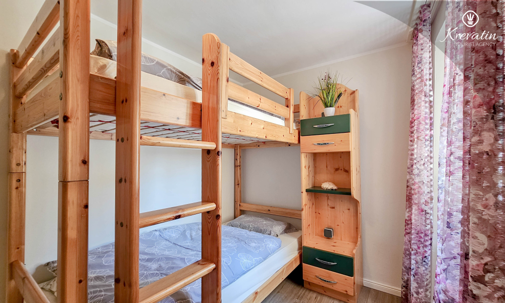 L'appartamento ha due camere da letto. La prima camera ha un comodo letto matrimoniale, ideale per un tranquillo riposo notturno. La seconda camera è dotata di un letto a castello, ideale per famiglie o amici che viaggiano insieme. Il bagno è ben arredato e dispone di una lavatrice per la vostra comodità.