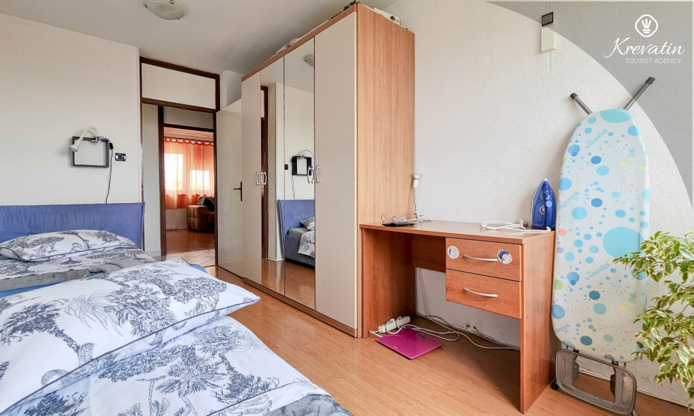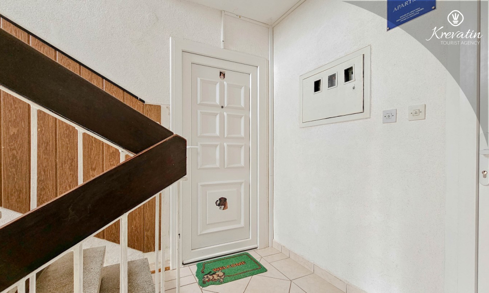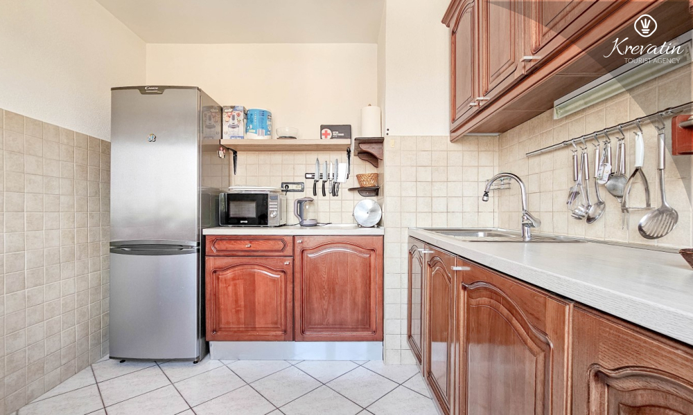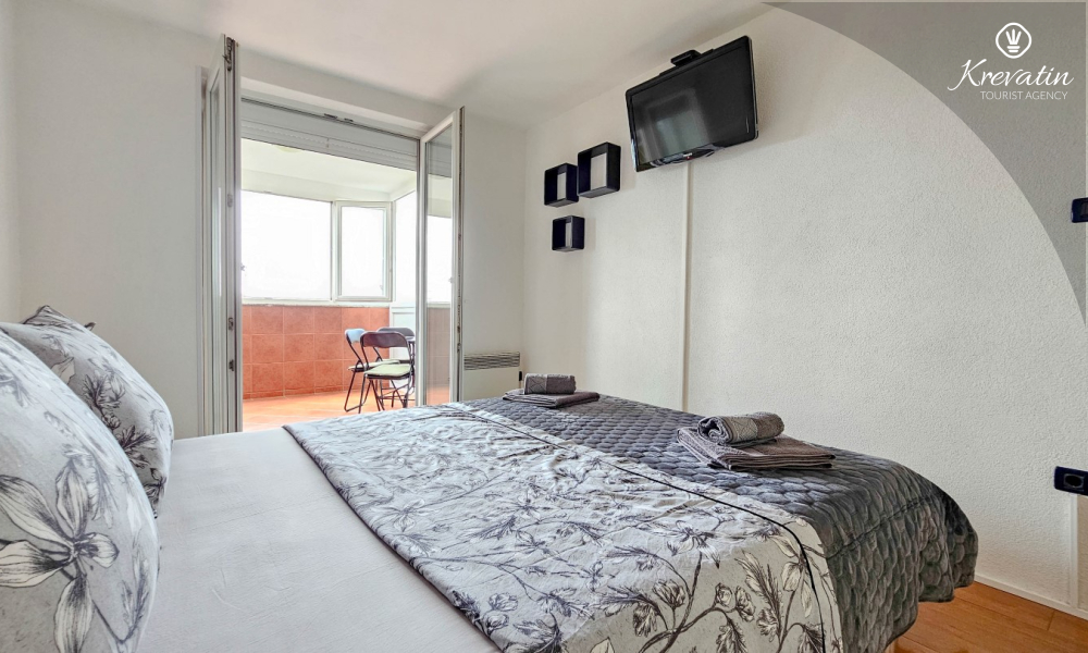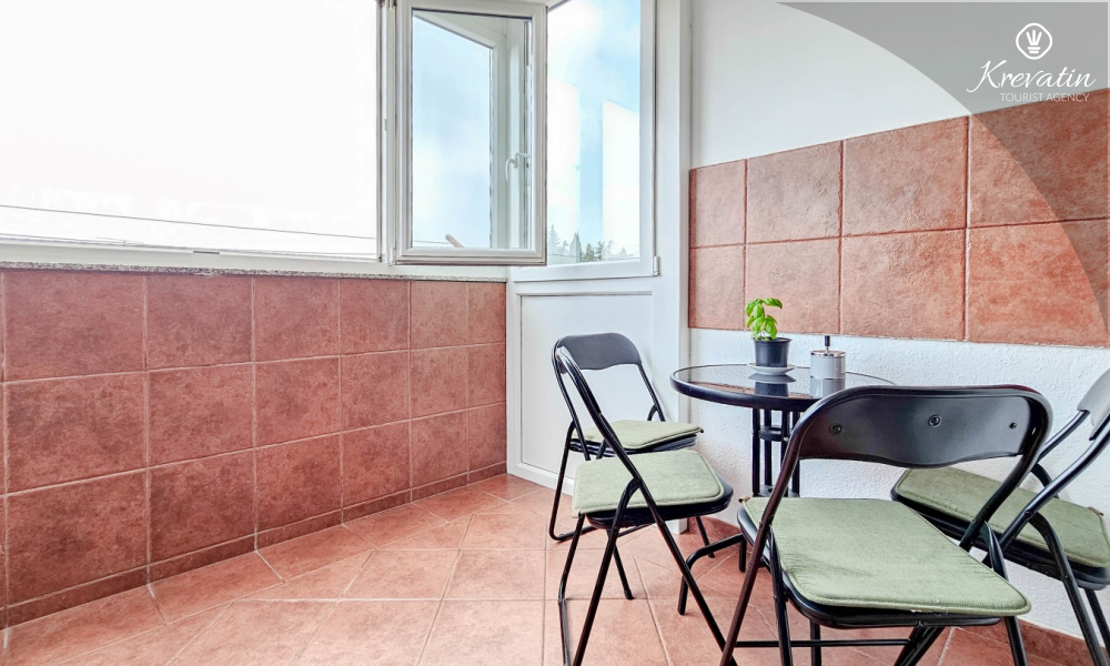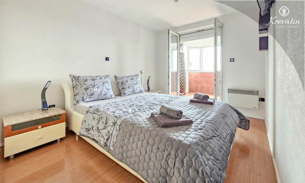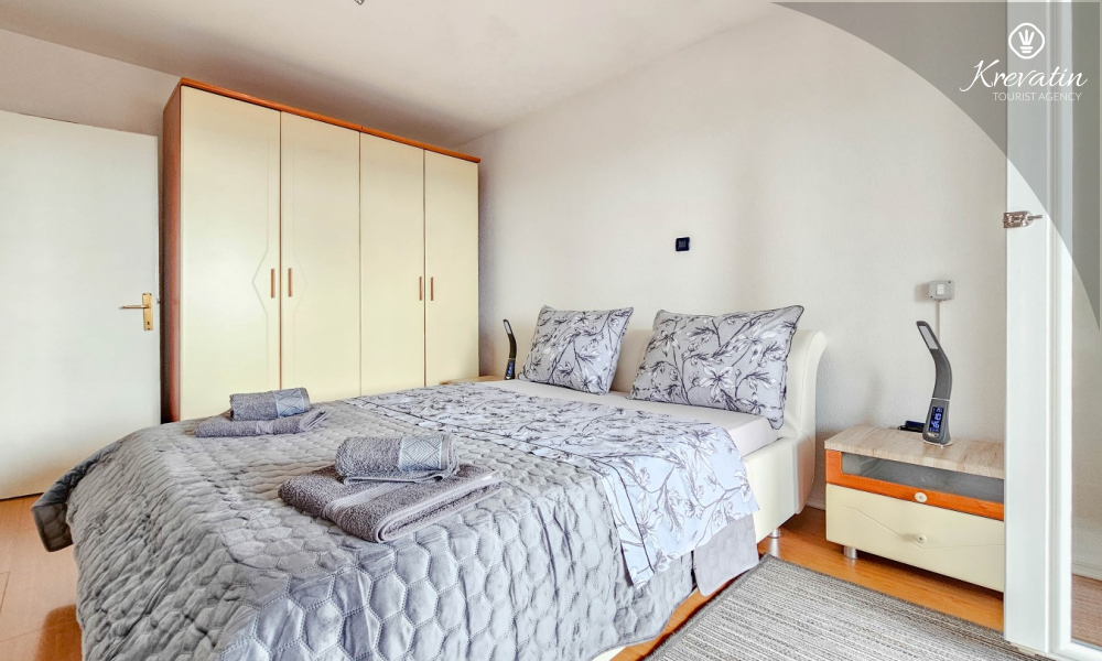 L'appartamento è composto da due camere da letto, una con letto matrimoniale e l'altra con due letti singoli, e da un ampio soggiorno con cucina attrezzata con i comfort di base. Il bagno è dotato di vasca, doccia e WC, mentre la camera da letto principale si apre su un balcone con mobili da giardino, il luogo ideale per un caffè mattutino o per rilassarsi la sera.