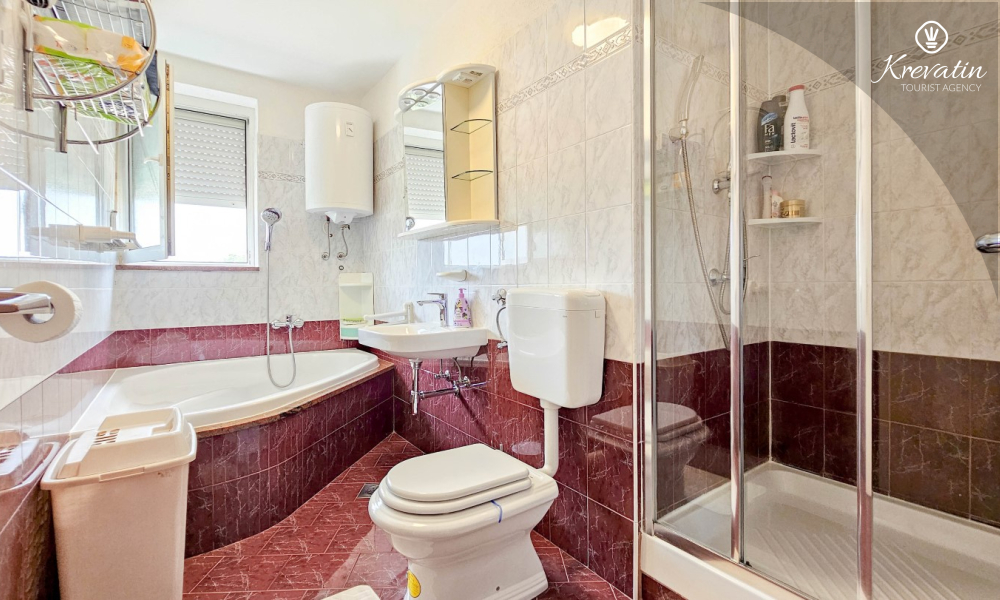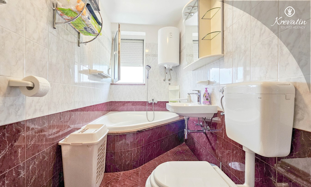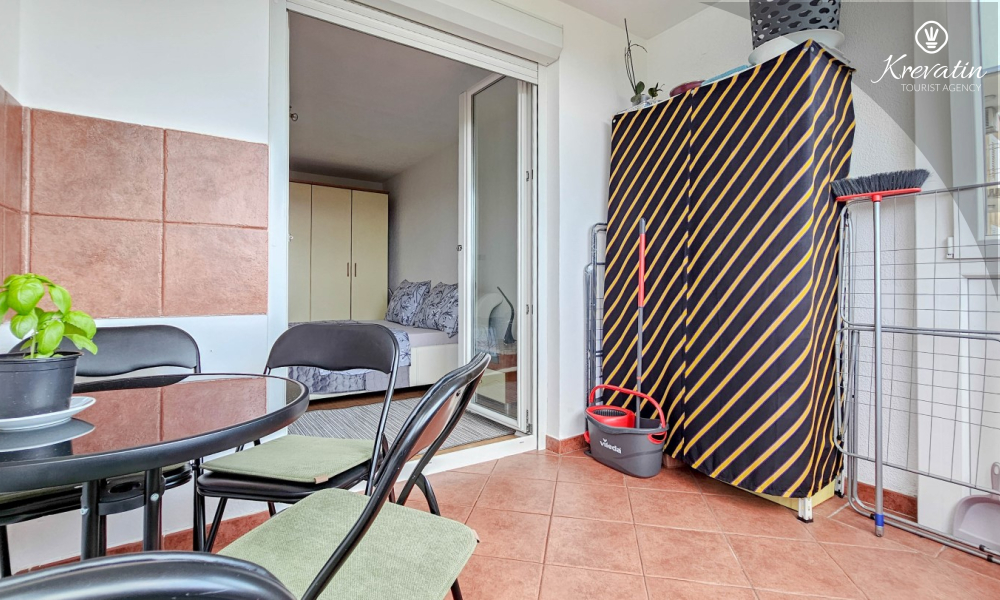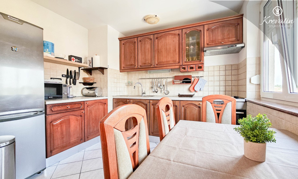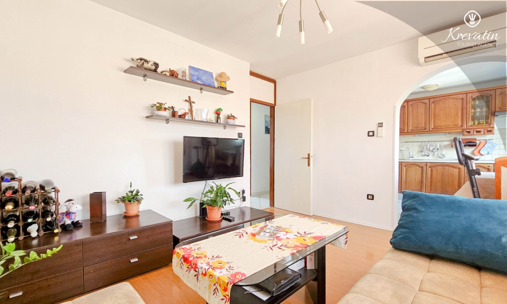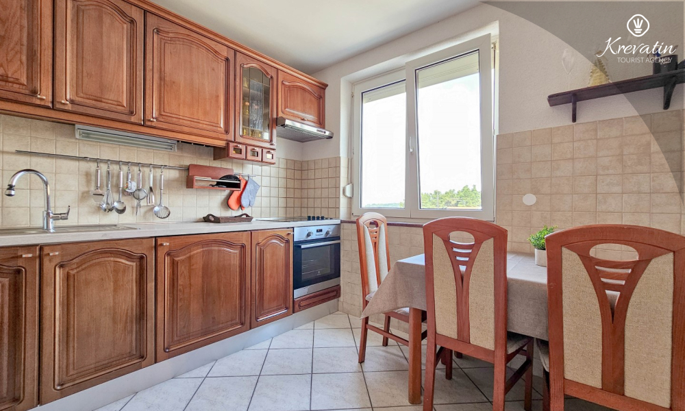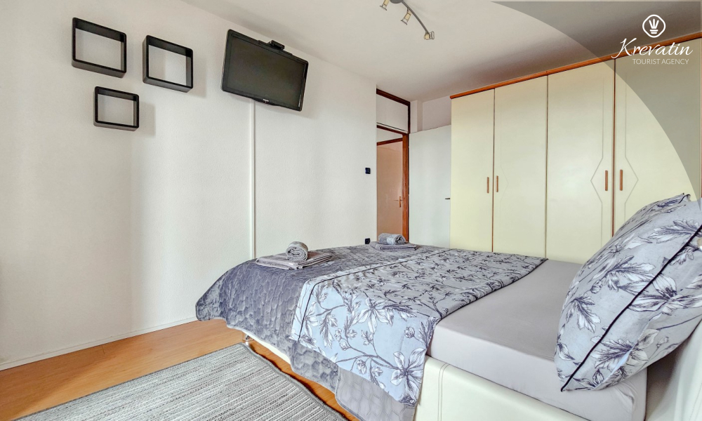 L'appartamento è composto da due camere da letto, una con letto matrimoniale e l'altra con due letti singoli, e da un ampio soggiorno con cucina attrezzata con i comfort di base. Il bagno è dotato di vasca, doccia e WC, mentre la camera da letto principale si apre su un balcone con mobili da giardino, il luogo ideale per un caffè mattutino o per rilassarsi la sera.