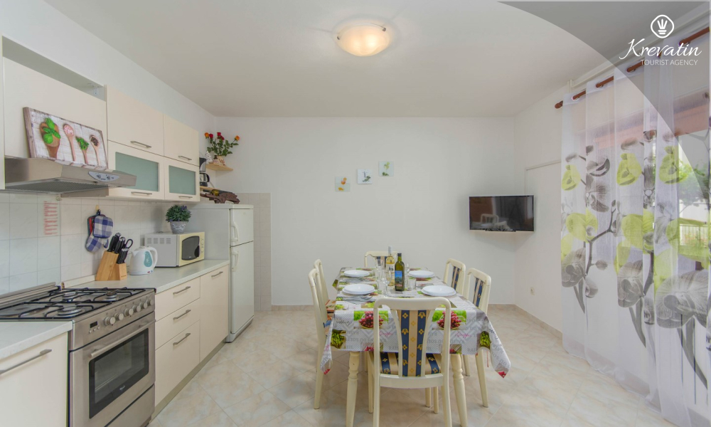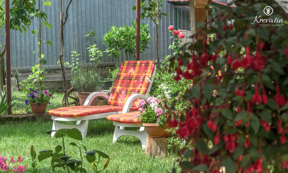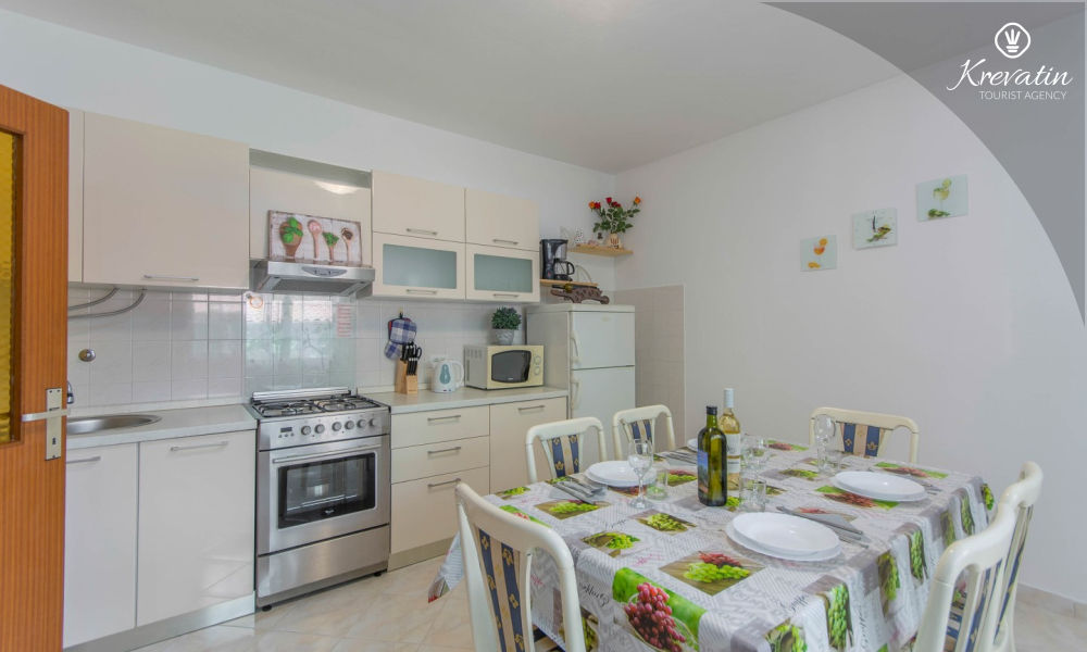 L'appartamento può ospitare da 4 a 5 persone e si trova al piano terra di una casa familiare. È composto da due camere da letto, una cucina attrezzata con servizi di base, un bagno con doccia e WC e una terrazza con vista sul giardino, ideale per il caffè del mattino o per il relax serale.