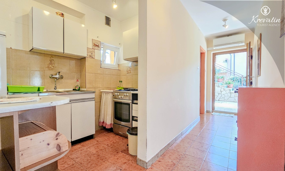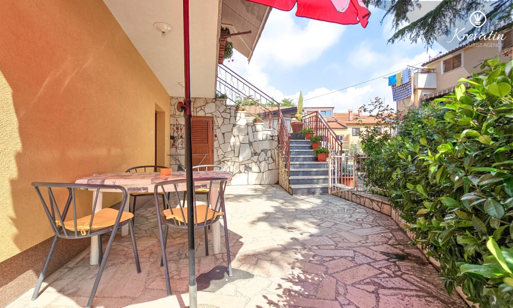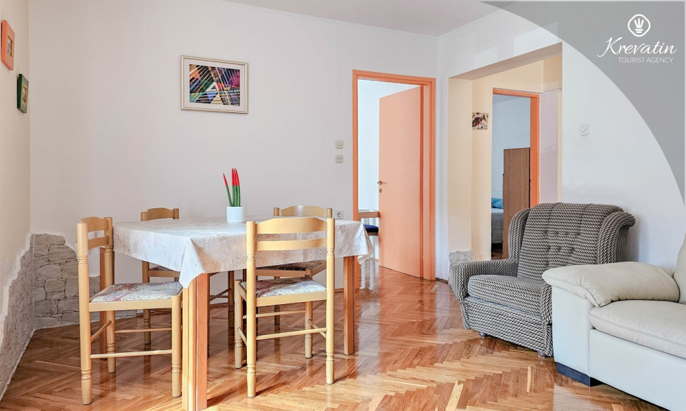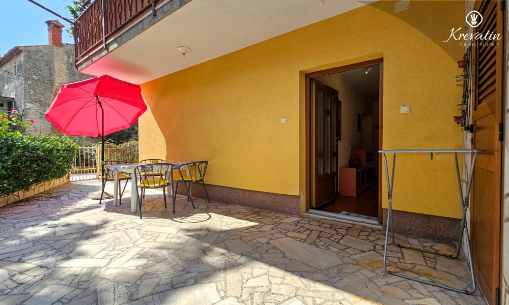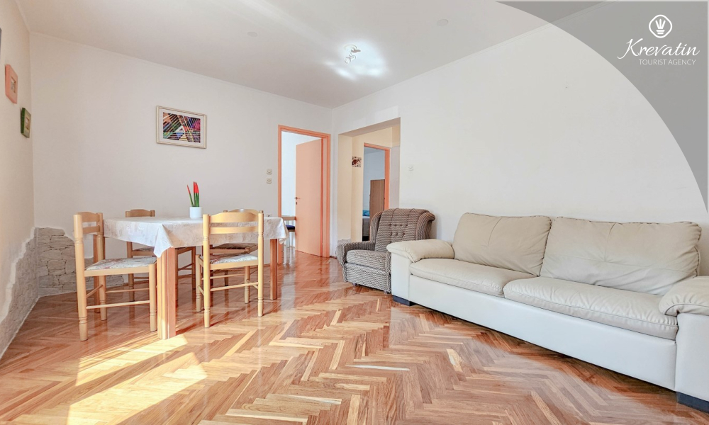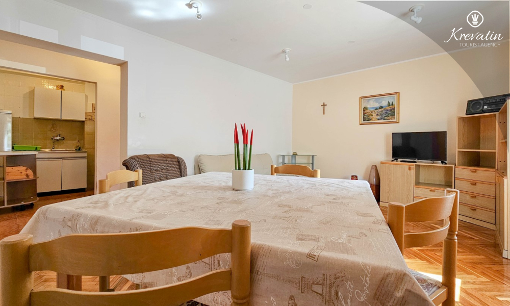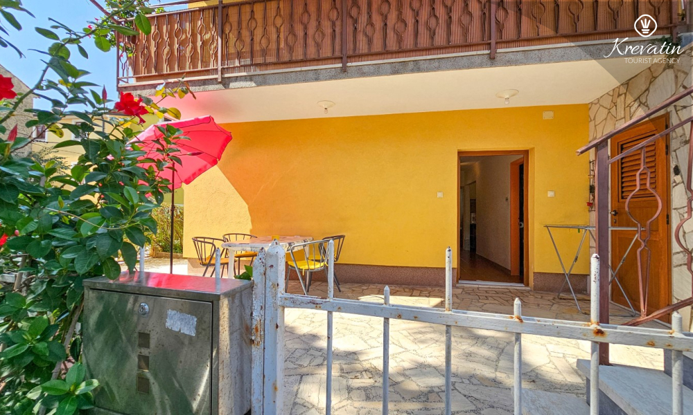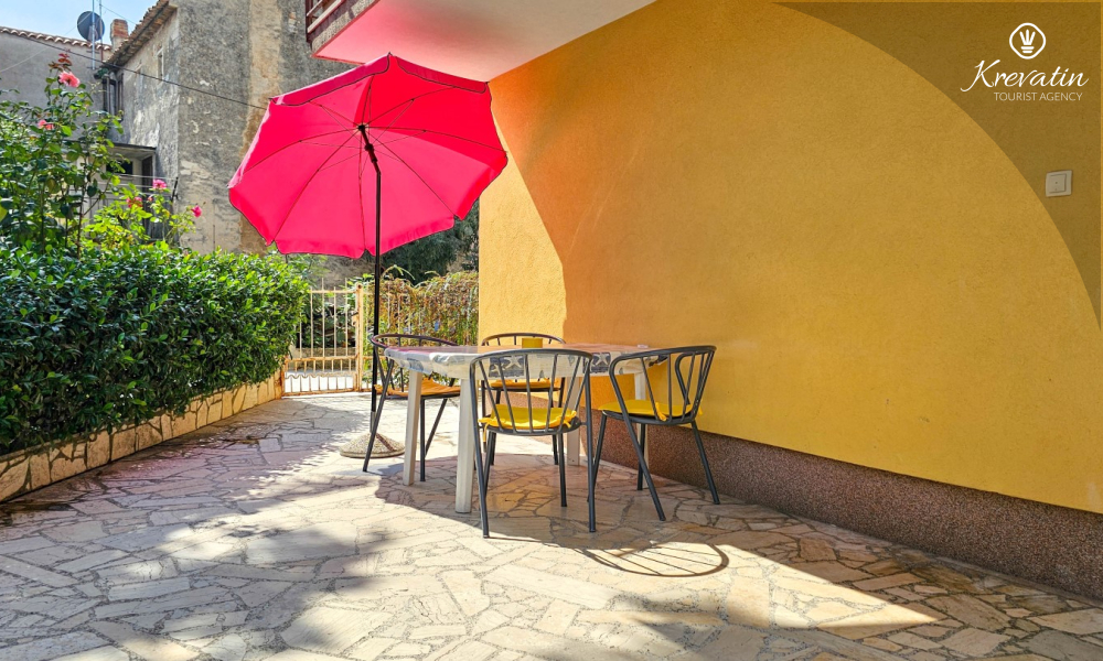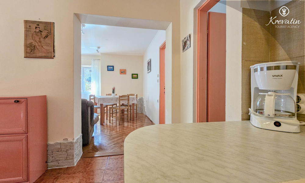 L'appartamento si trova al piano terra di una casa familiare e dispone di 2 camere da letto con letti matrimoniali, un soggiorno con zona pranzo, una cucina attrezzata con servizi di base e un bagno con doccia e WC. C'è anche un'ampia terrazza con tavolo e sedie, il luogo perfetto per il caffè del mattino o per il relax serale.