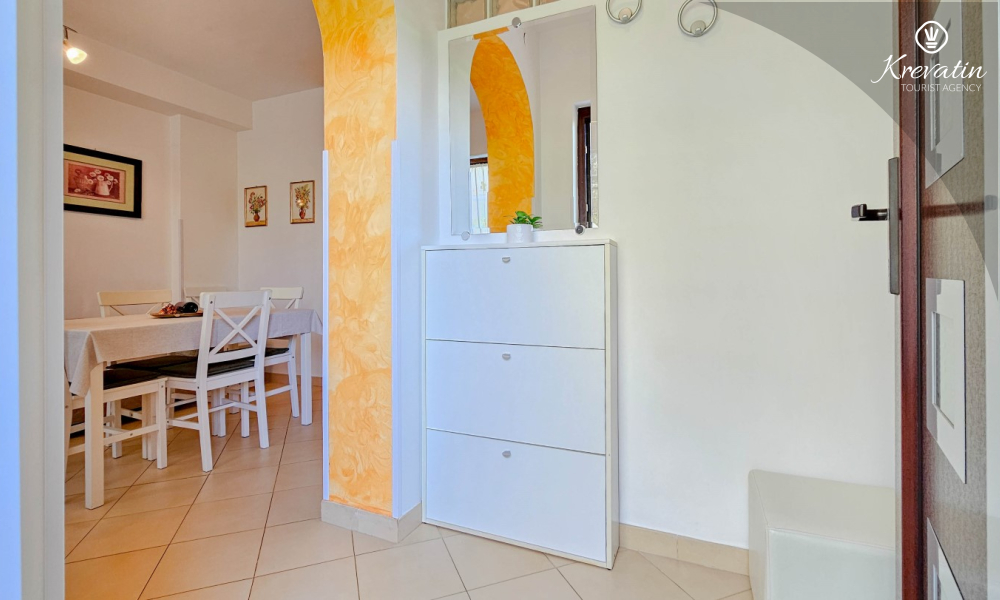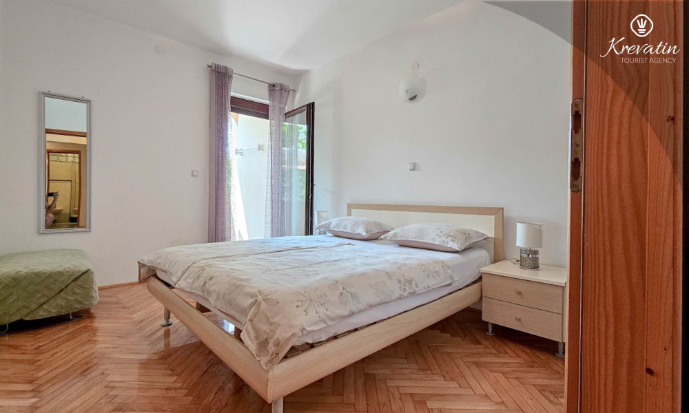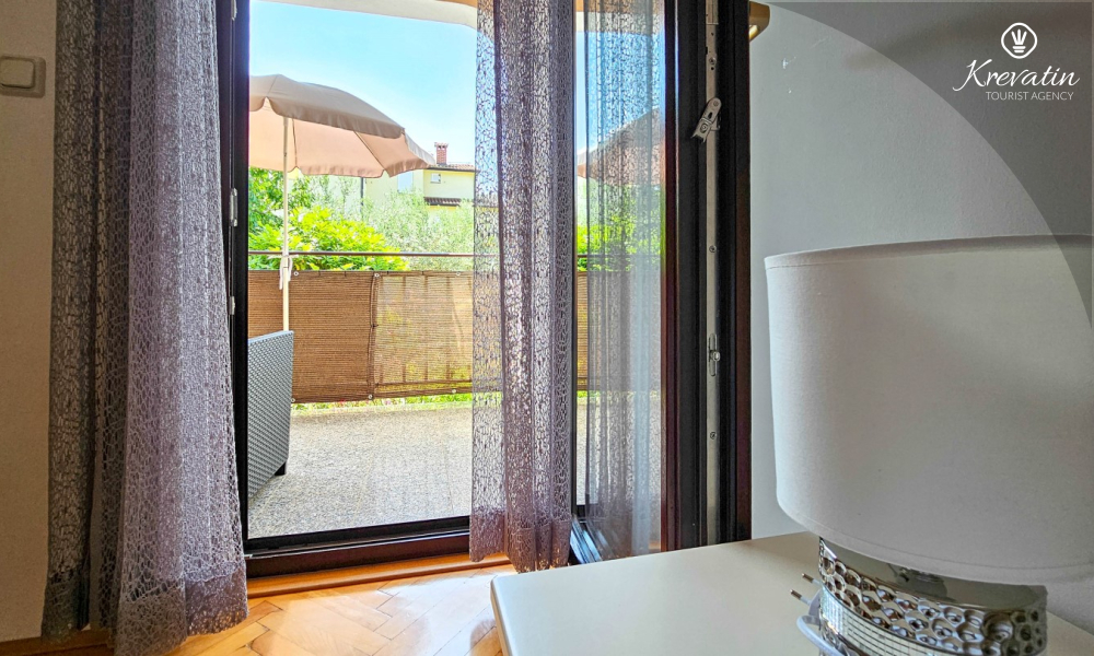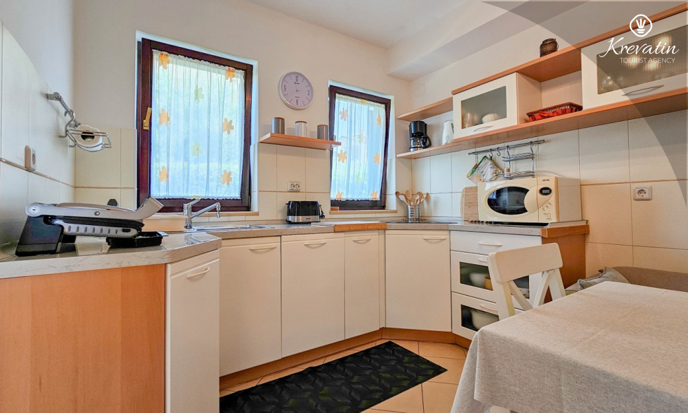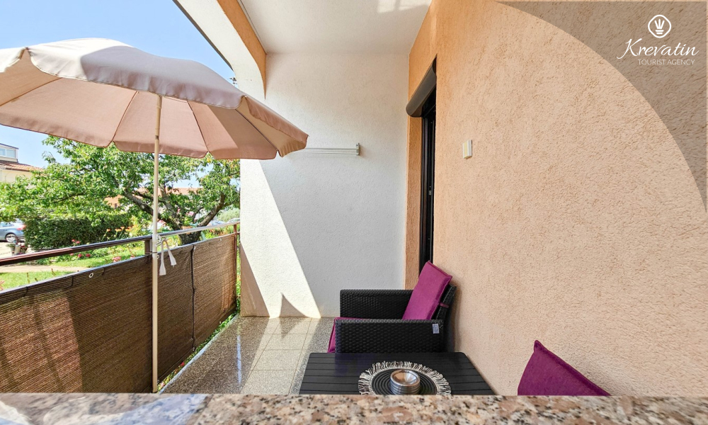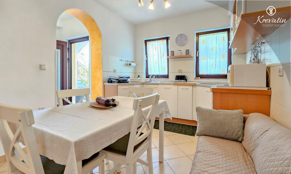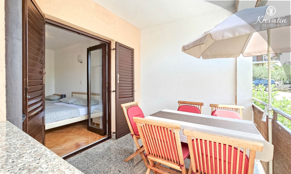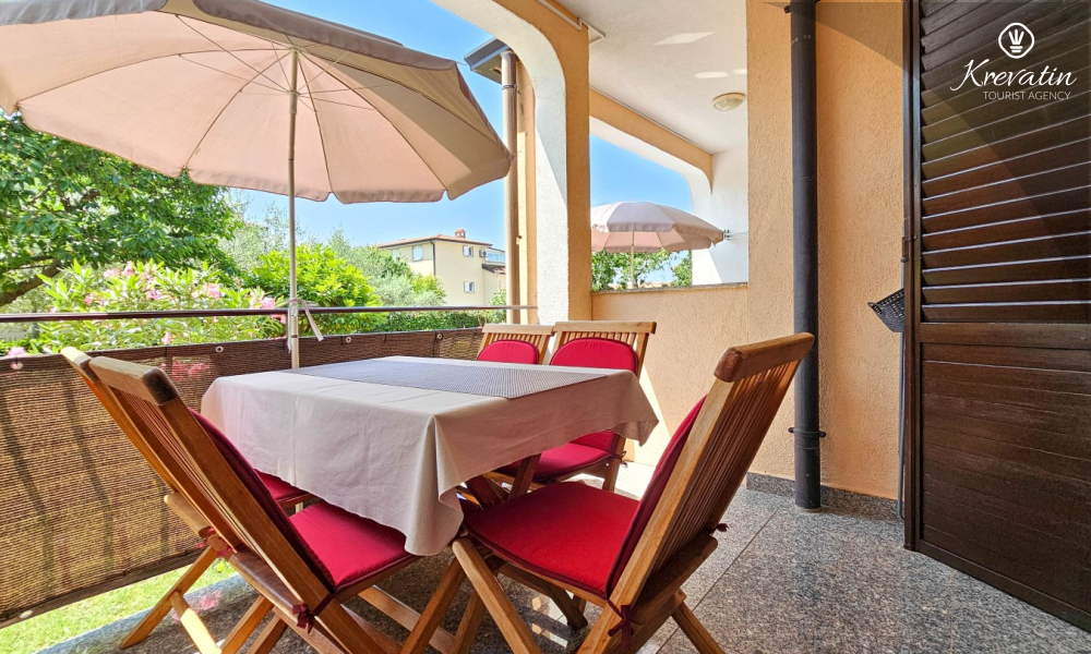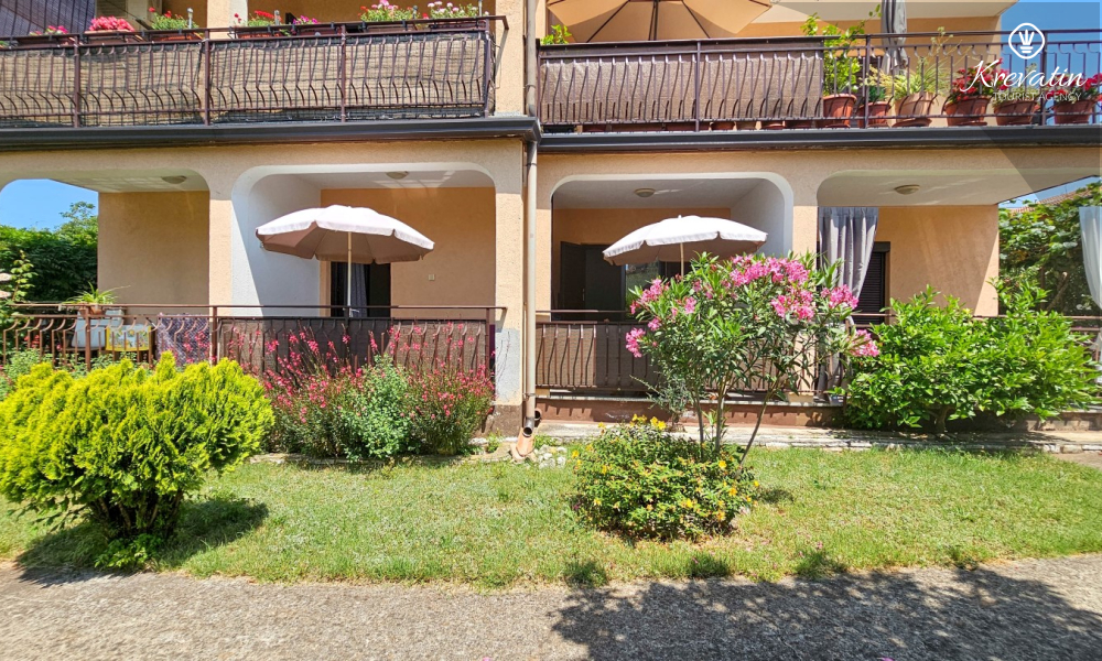 L'appartamento offre due camere da letto, una cucina attrezzata con utensili di base per la preparazione dei pasti, un bagno con doccia e WC e due terrazze coperte con tavolo e sedie, perfette per rilassarsi all'aria aperta. A disposizione anche un giardino in comune con barbecue.