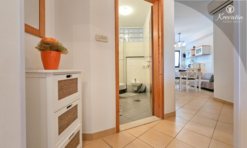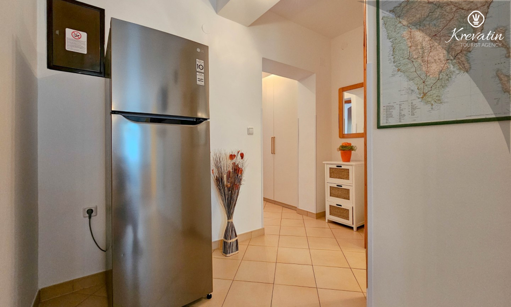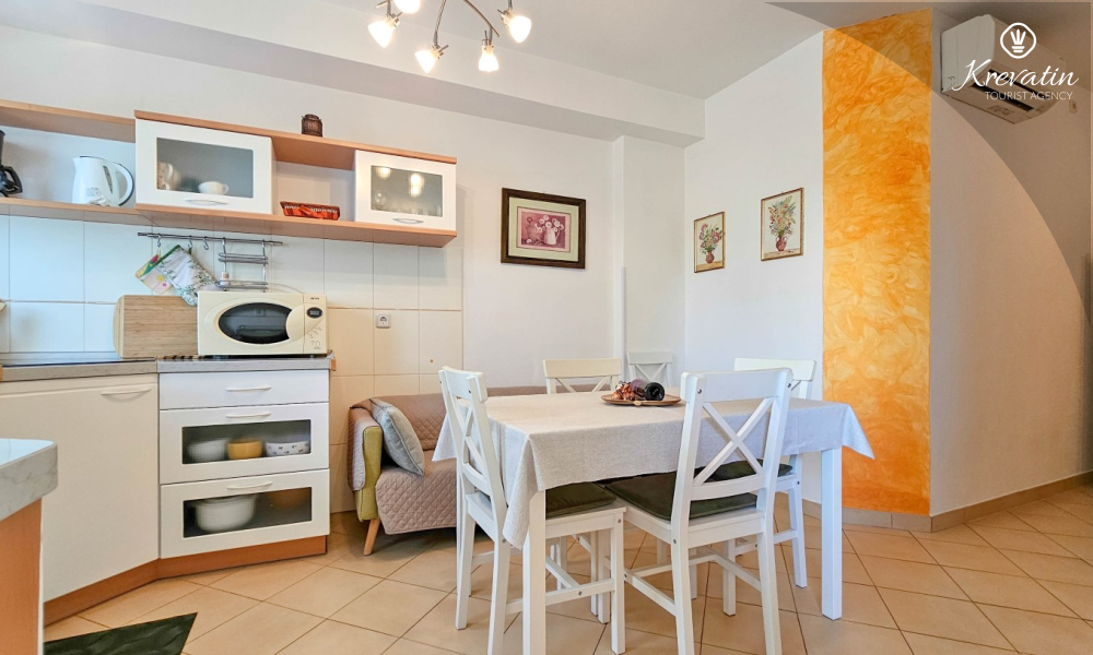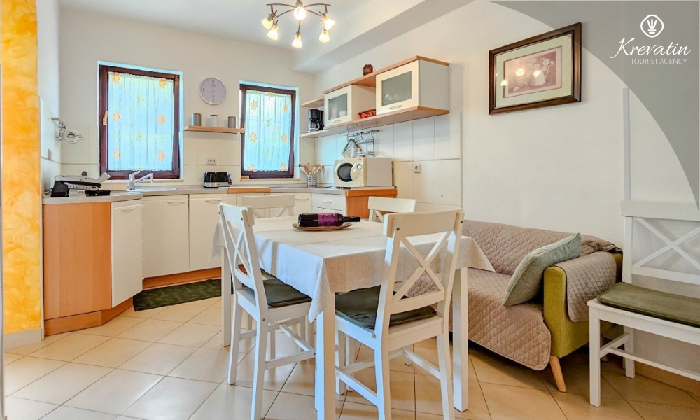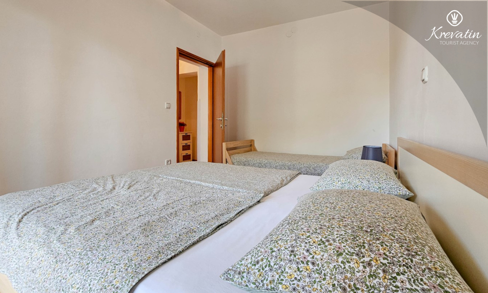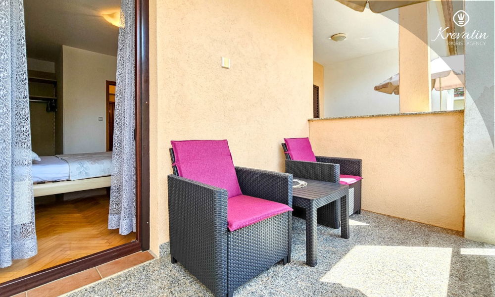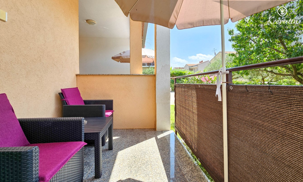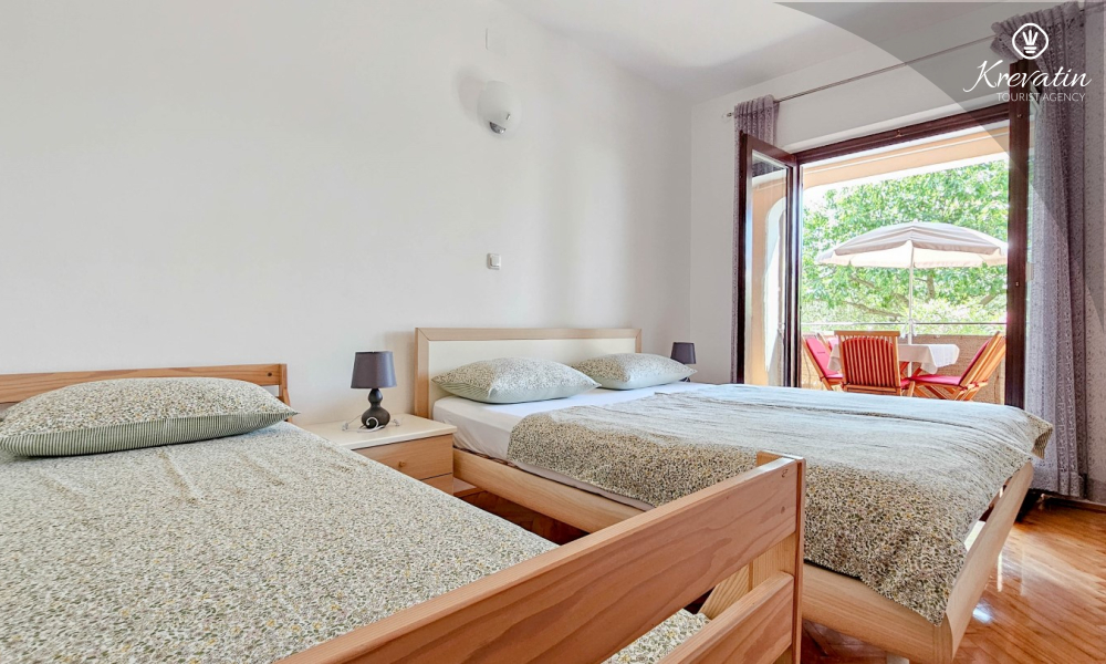 L'appartamento offre due camere da letto, una cucina attrezzata con utensili di base per la preparazione dei pasti, un bagno con doccia e WC e due terrazze coperte con tavolo e sedie, perfette per rilassarsi all'aria aperta. A disposizione anche un giardino in comune con barbecue.