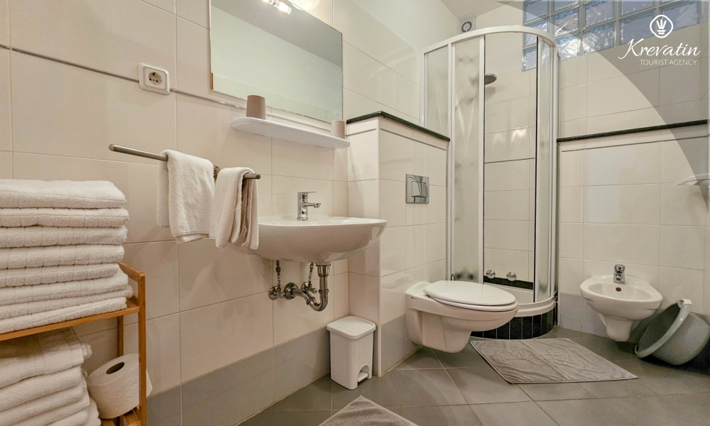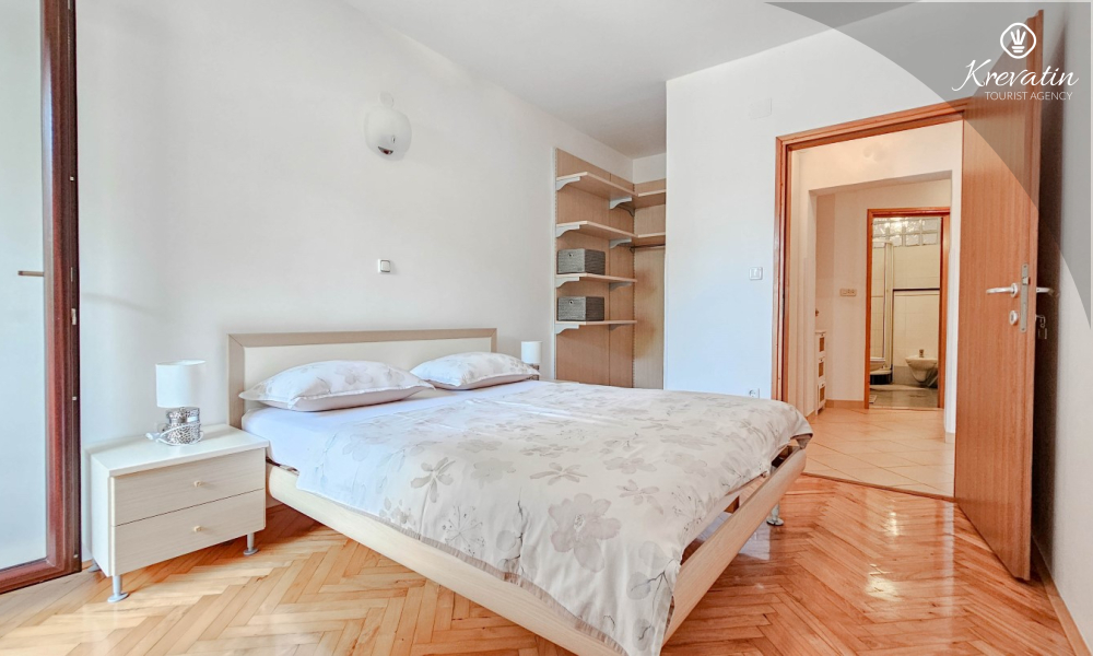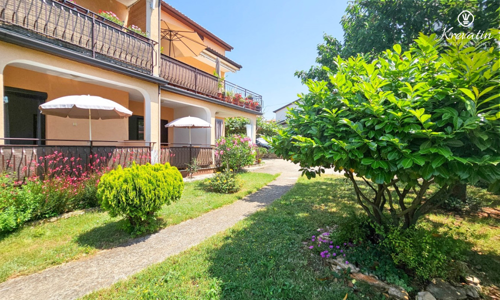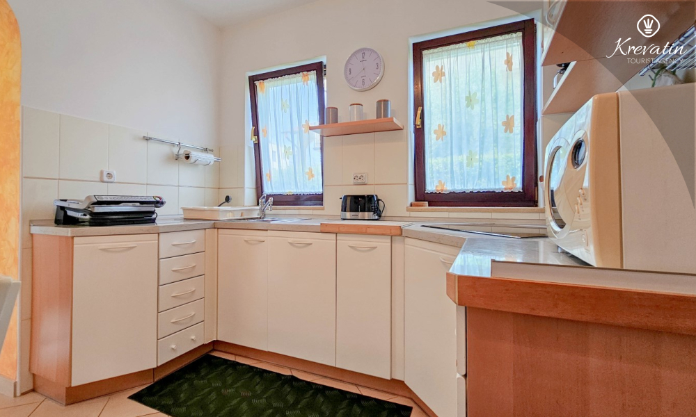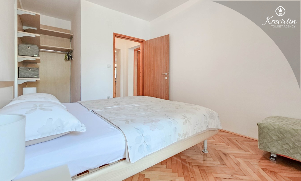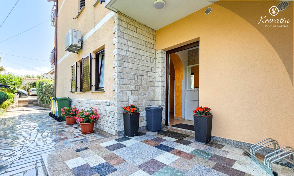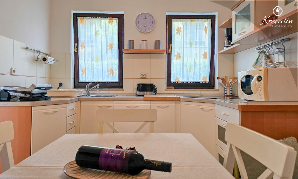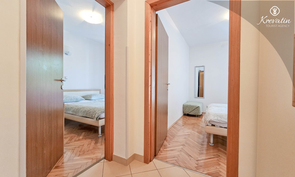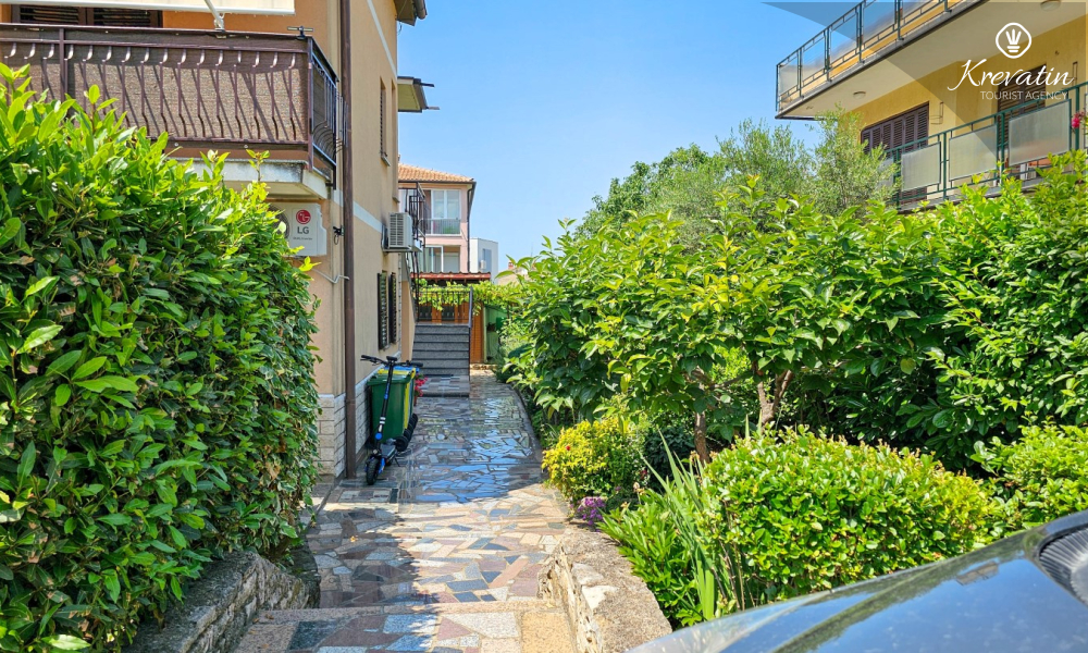 L'appartamento offre due camere da letto, una cucina attrezzata con utensili di base per la preparazione dei pasti, un bagno con doccia e WC e due terrazze coperte con tavolo e sedie, perfette per rilassarsi all'aria aperta. A disposizione anche un giardino in comune con barbecue.