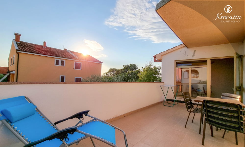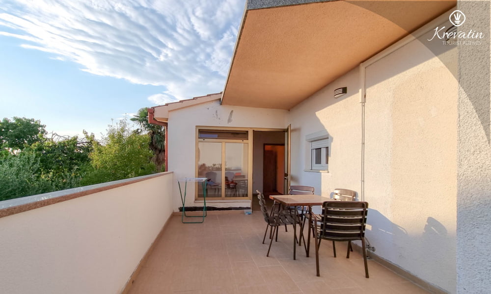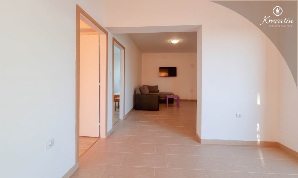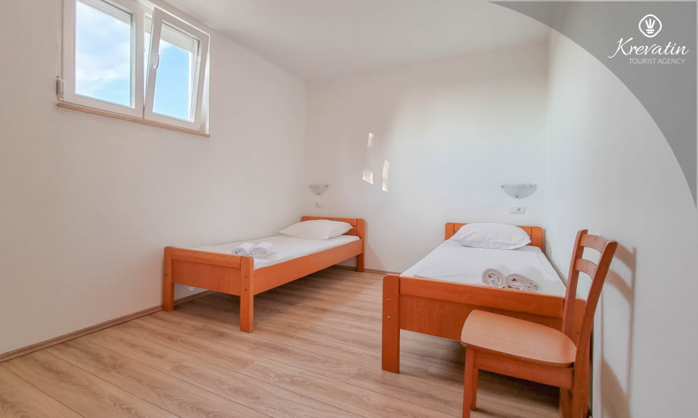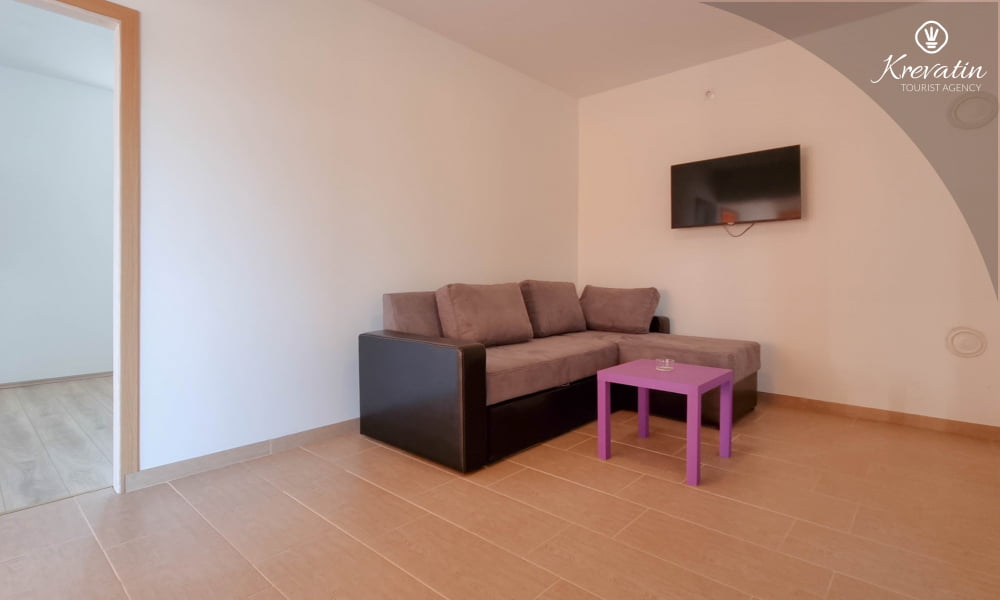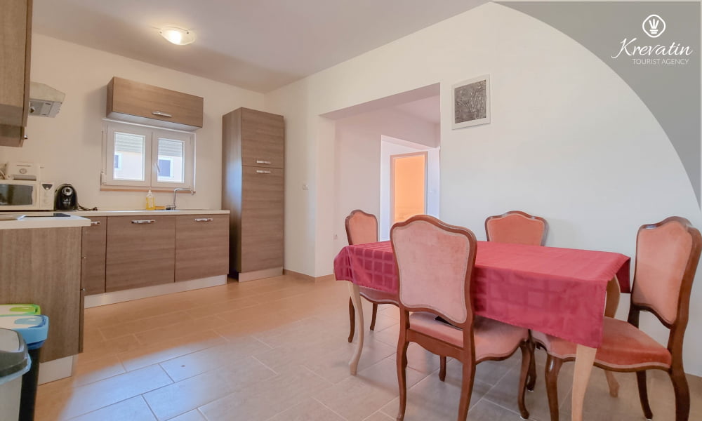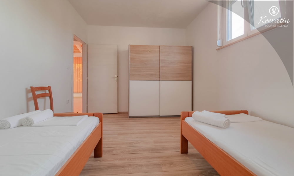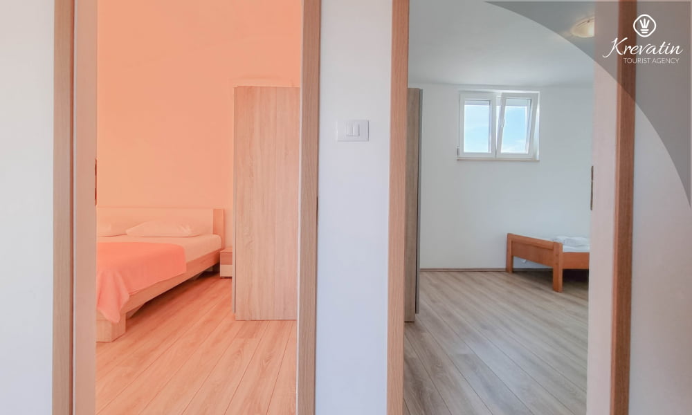 Situato al primo piano, può ospitare fino a 5 persone. Dispone di due camere da letto, un soggiorno con divano letto, una cucina attrezzata con servizi di base e un bagno con doccia e WC. Il balcone con mobili da giardino è il luogo ideale per un caffè mattutino o per rilassarsi la sera.