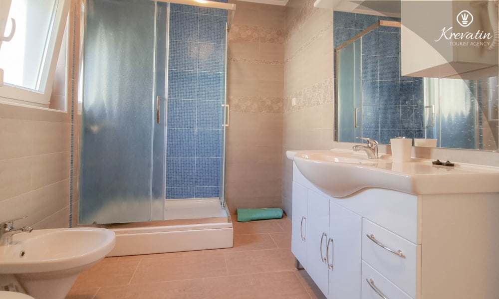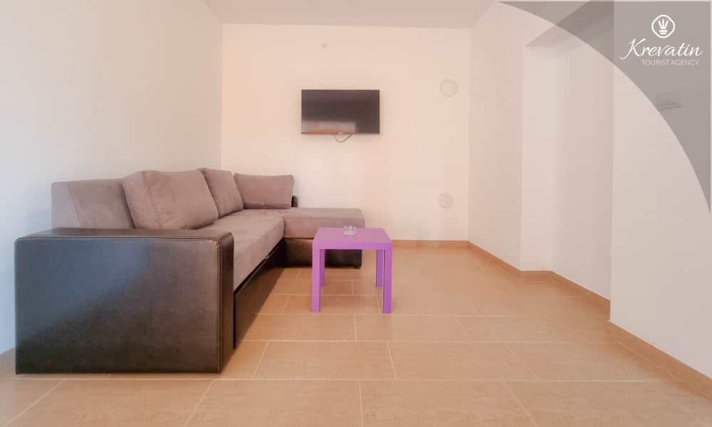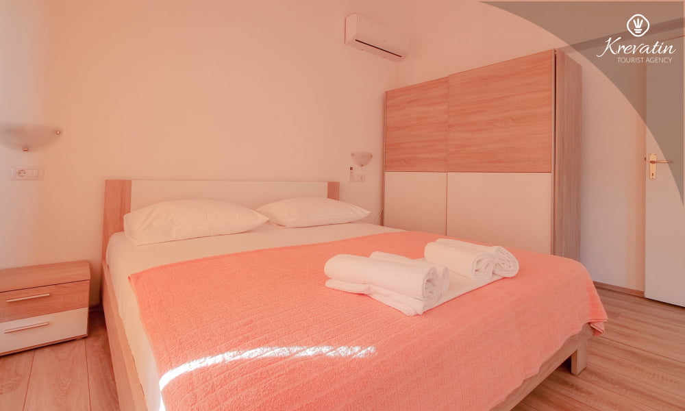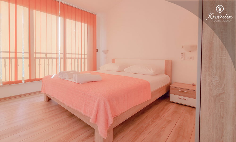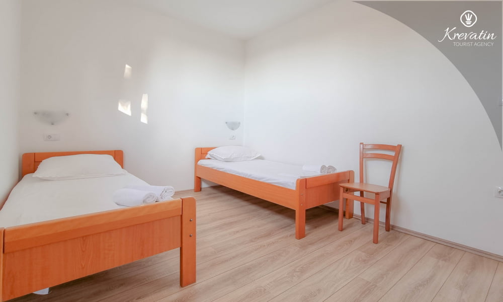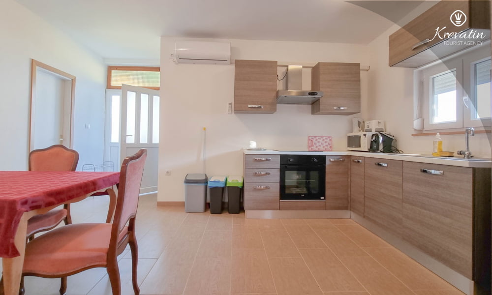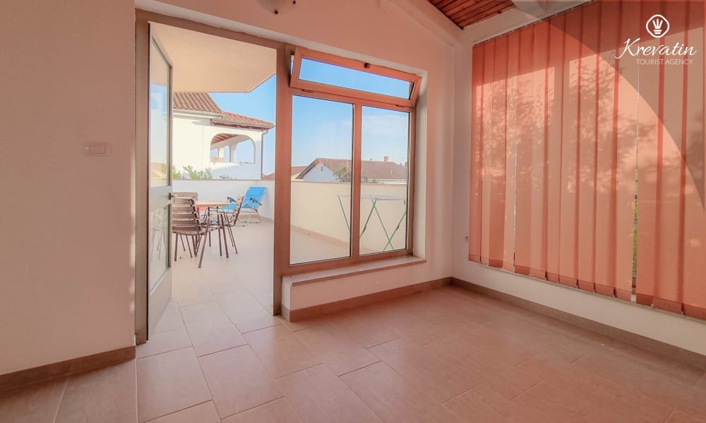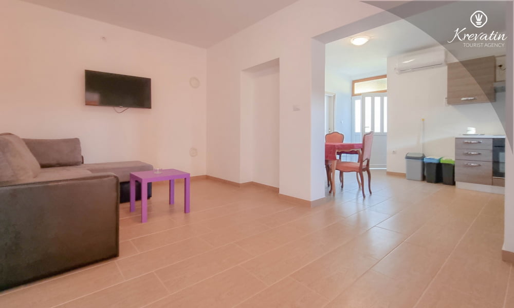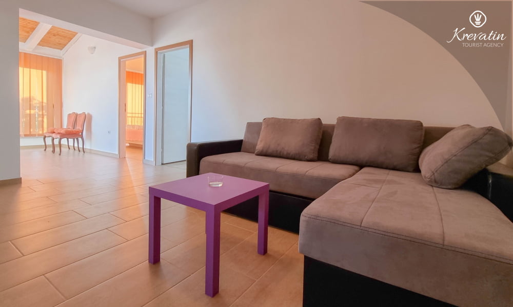 Situato al primo piano, può ospitare fino a 5 persone. Dispone di due camere da letto, un soggiorno con divano letto, una cucina attrezzata con servizi di base e un bagno con doccia e WC. Il balcone con mobili da giardino è il luogo ideale per un caffè mattutino o per rilassarsi la sera.