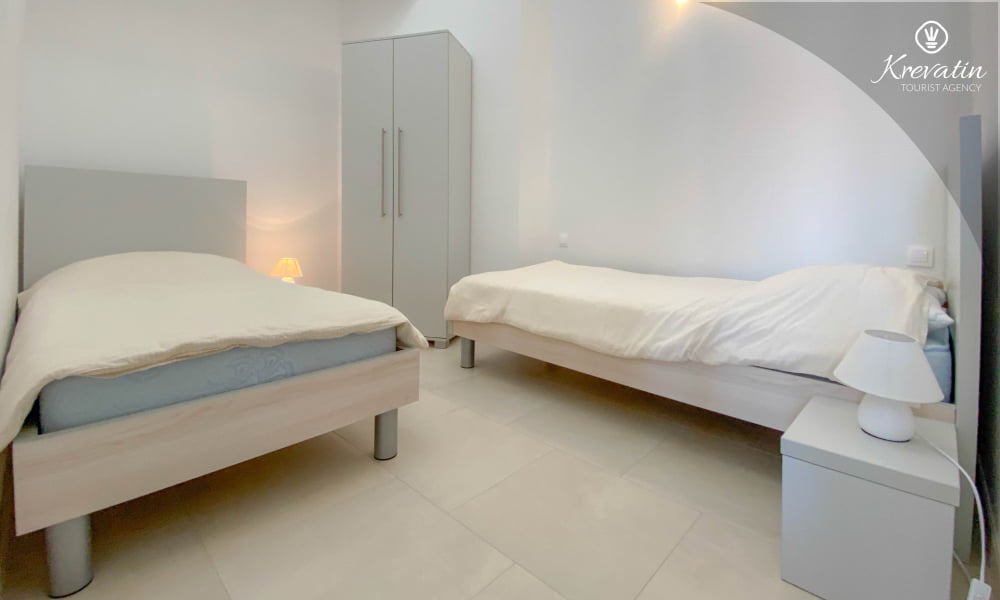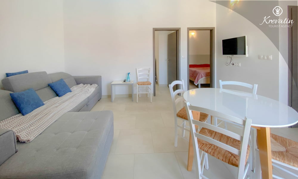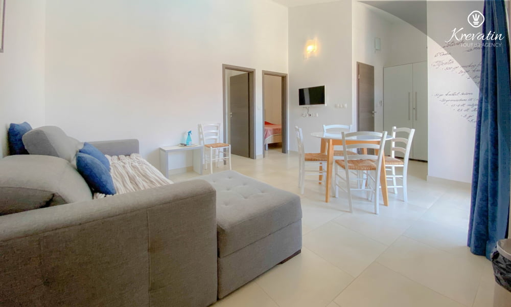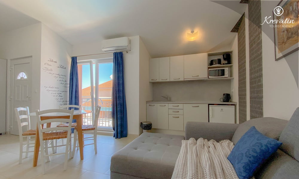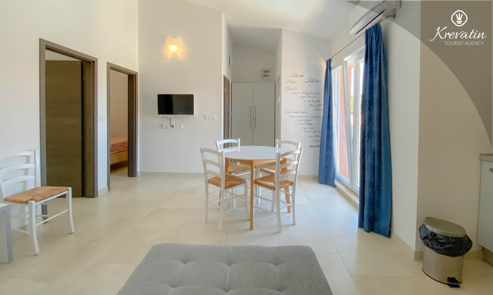 Questo appartamento per fino 4 persone è situato al primo piano e consiste da due camere da letto, un soggiorno e una cucina con zona pranzo. La cucina è dotata di piano cottura elettrico, forno a microonde, frigorifero e macchina per il caffè. C'è un bagno con doccia e wc ed un terrazzo con mobili. Inoltre c'è una piscina pre uso in comune. SAT-TV, aria condizionata, WLAN, lenzuola e asciugamani sono inclusi nel prezzo. Animali domestici non sono ammessi.