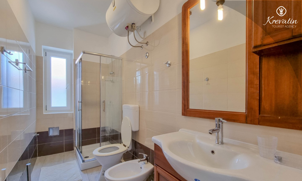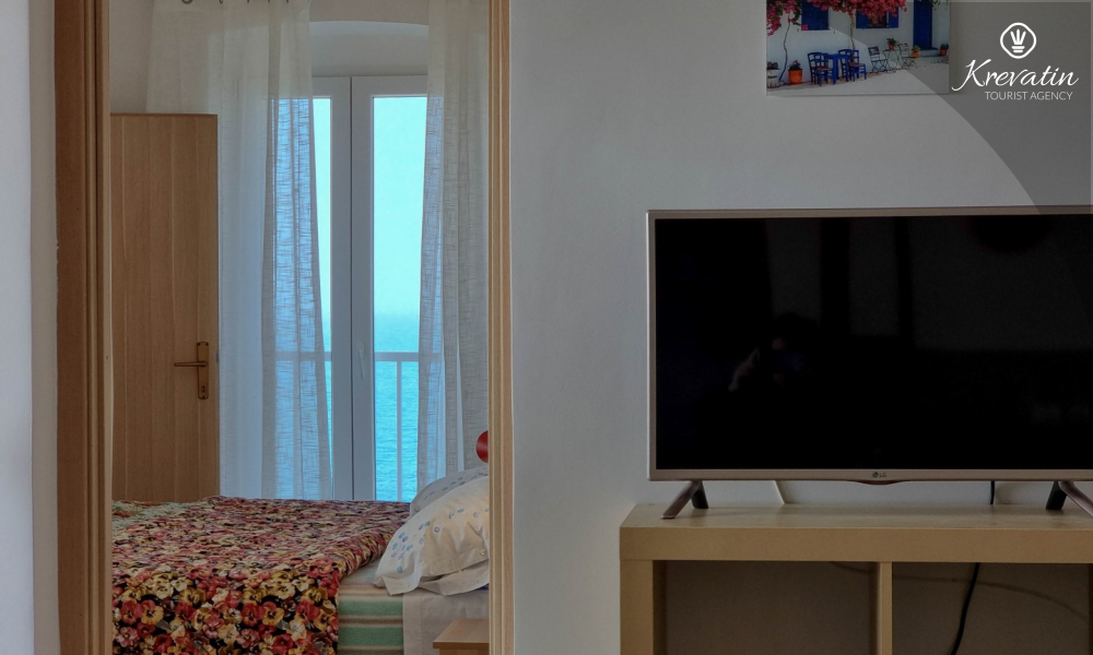L'appartamento dispone di due bagni, ciascuno con doccia e WC, che facilitano ulteriormente il soggiorno di tutti gli ospiti. C'è un balcone con una splendida vista mare, ideale per rilassarsi e godersi l'aria aperta.