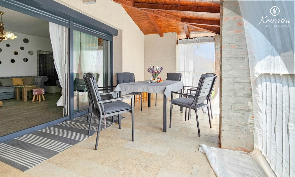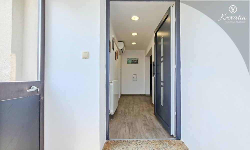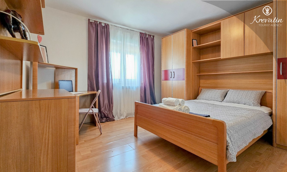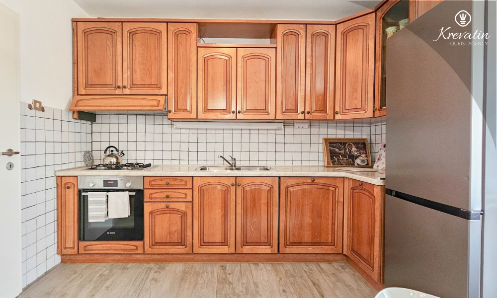 È composto da una cucina con sala da pranzo, un ampio soggiorno con accesso a un balcone coperto, tre camere da letto e un bagno. Il balcone è attrezzato con tavolo e sedie e offre una vista panoramica sulla città e sulla natura.