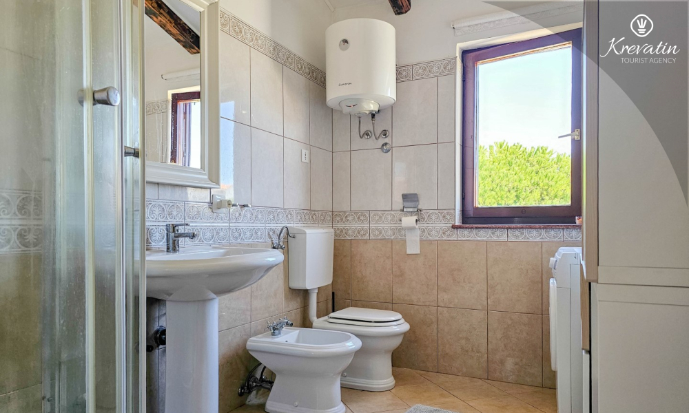 Il bagno è pratico e funzionale, dotato di doccia per un rinfrescante inizio di giornata e lavatrice che permette di rimanere pratici anche in vacanza.