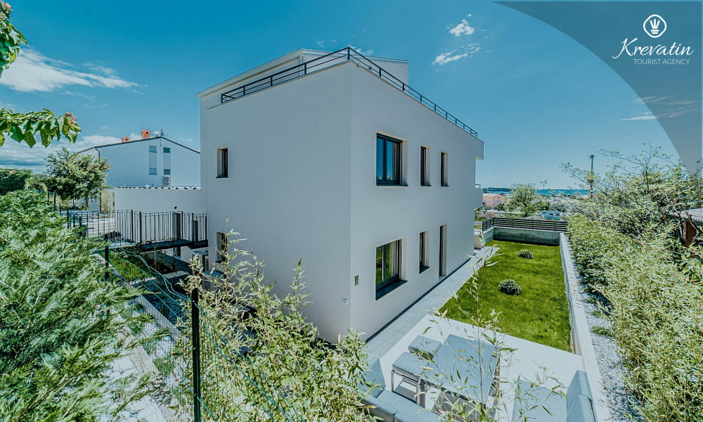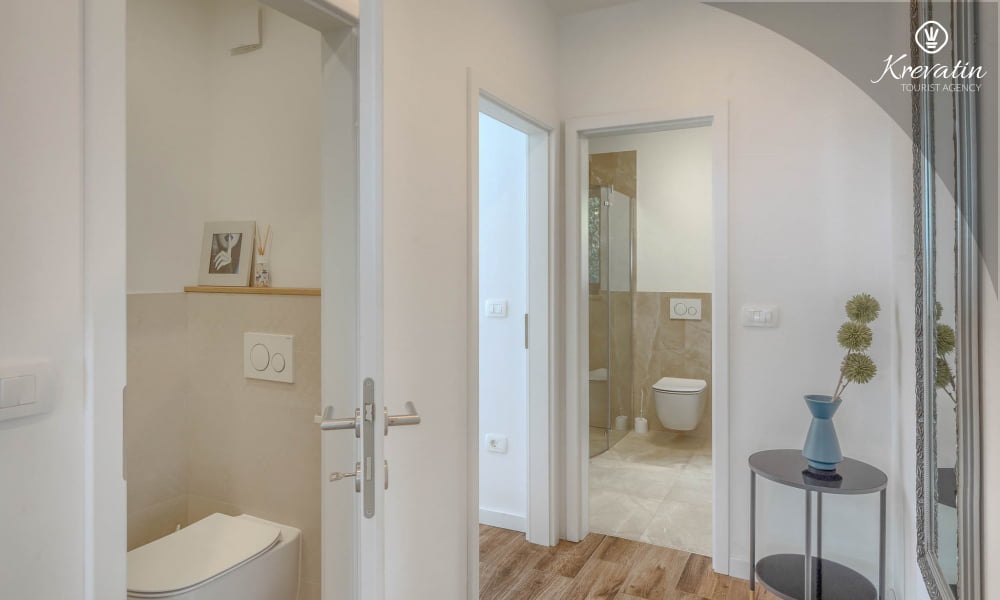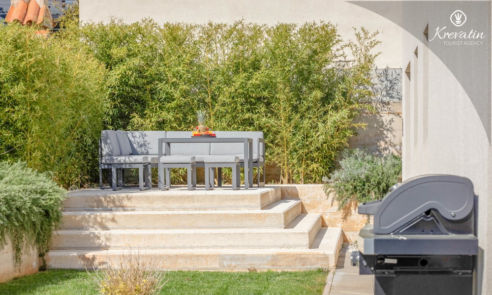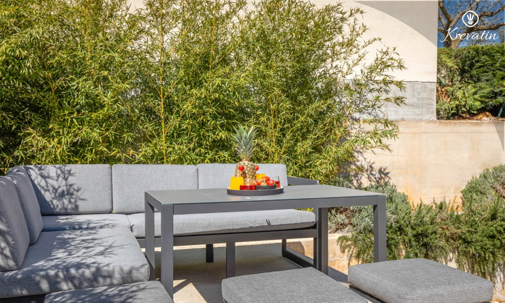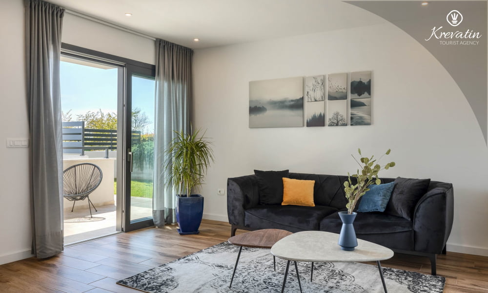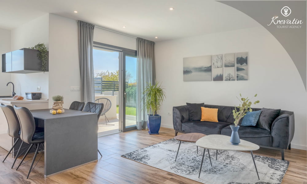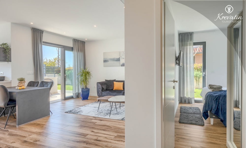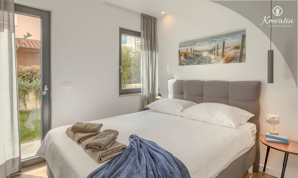 Questo appartamento per 4 persone, situato al piano terra, è composto da due camere da letto, un soggiorno e una cucina. La cucina è attrezzata con piano cottura elettrico, frigorifero e macchina per il caffè. Ci sono due bagni, uno con doccia e uno senza. La terrazza e atrezzata con mobili e un piccolo giradino. SAT-TV, aria condizionata, WLAN, lenzuola e asciugamani sono inclusi nel prezzo. Animali domestici non sono ammessi. C'è anche una terrazza sul tetto della casa con una vista bellisima su tutta la Cittanova e il mare, ed è disponibile in uso comune.