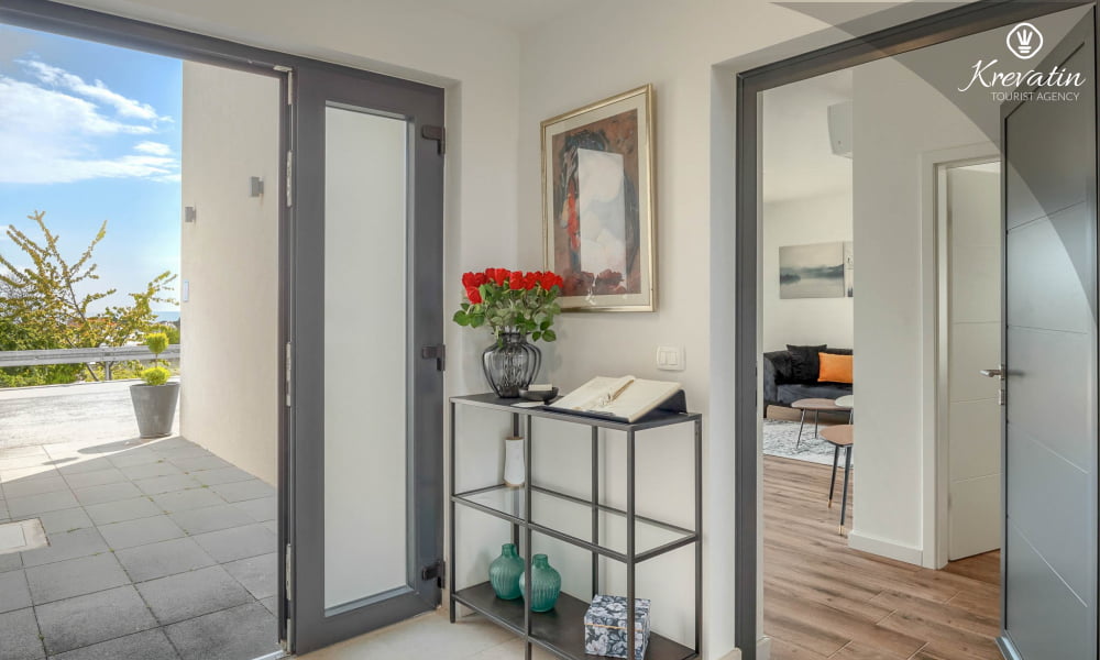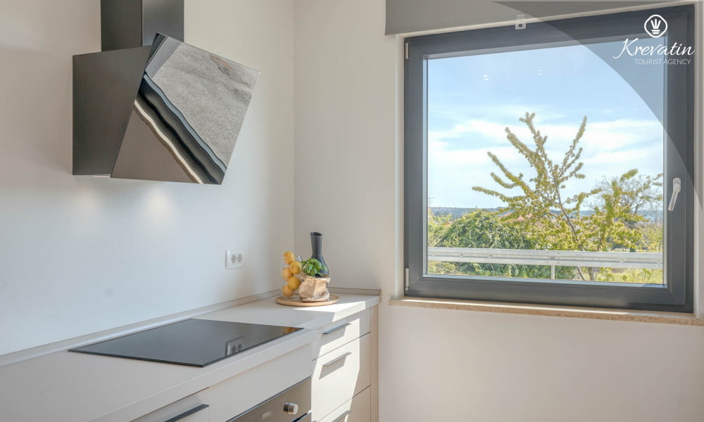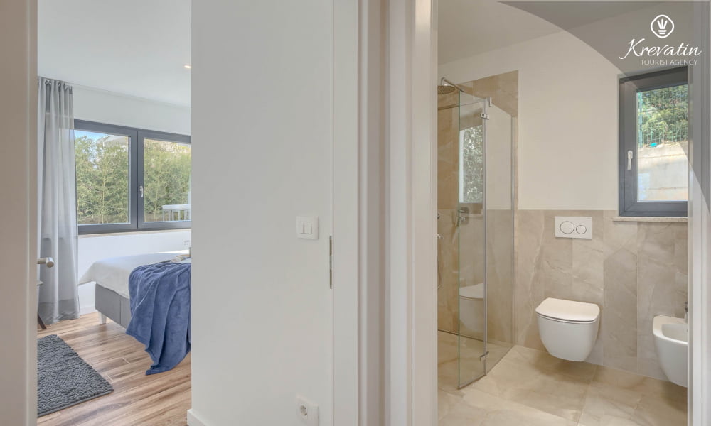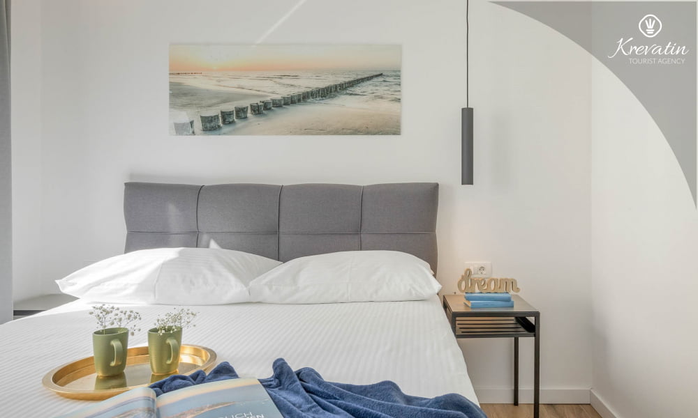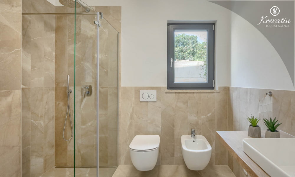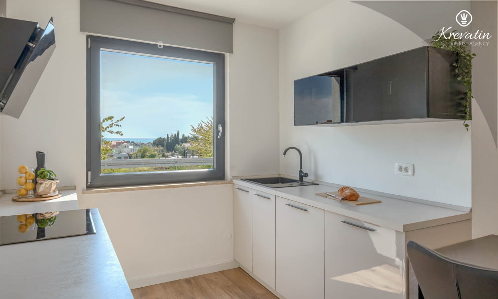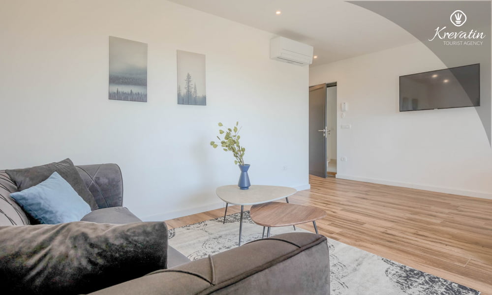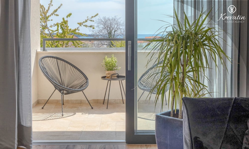 Questo appartamento per 4 persone, situato al piano terra, è composto da due camere da letto, un soggiorno e una cucina. La cucina è attrezzata con piano cottura elettrico, frigorifero e macchina per il caffè. Ci sono due bagni, uno con doccia e uno senza. La terrazza e atrezzata con mobili e un piccolo giradino. SAT-TV, aria condizionata, WLAN, lenzuola e asciugamani sono inclusi nel prezzo. Animali domestici non sono ammessi. C'è anche una terrazza sul tetto della casa con una vista bellisima su tutta la Cittanova e il mare, ed è disponibile in uso comune.