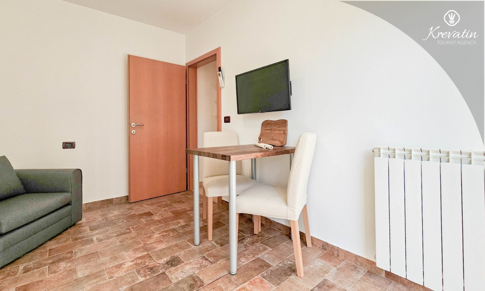 Situato al piano terra di una casa familiare, è composto da una camera da letto, una cucina attrezzata con utensili di base per preparare pasti semplici e un pratico bagno con doccia e WC. Di fronte all'appartamento si trova una piccola terrazza privata per il caffè del mattino o un bicchiere di vino la sera. C'è anche un'ampia terrazza in comune per socializzare piacevolmente con gli altri ospiti.