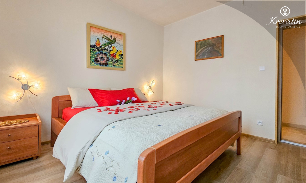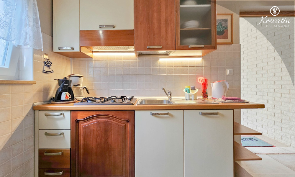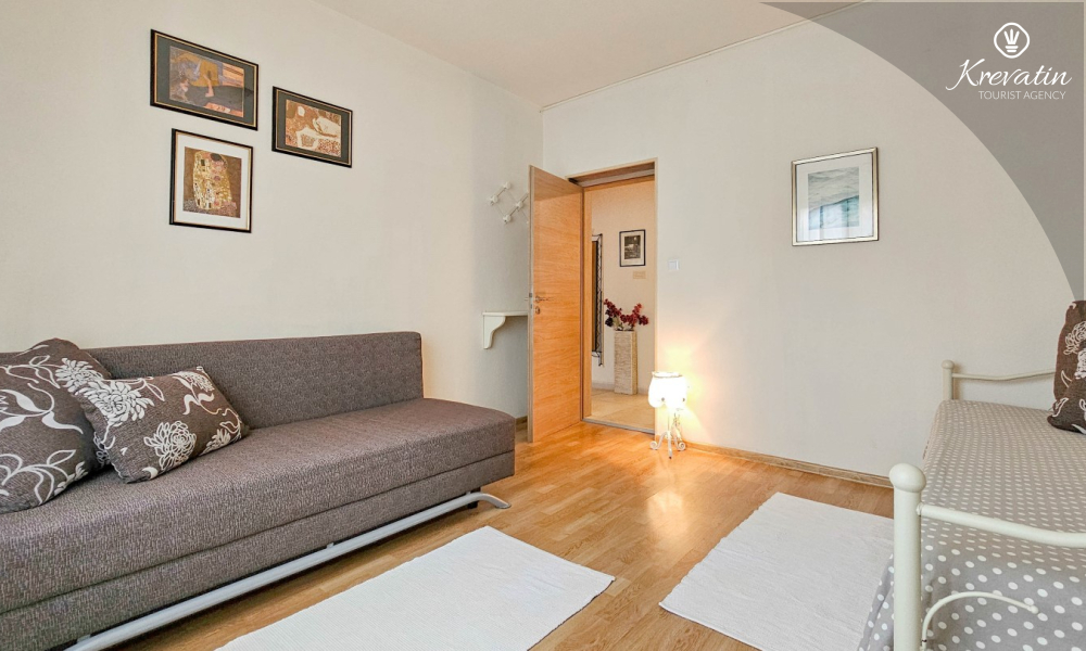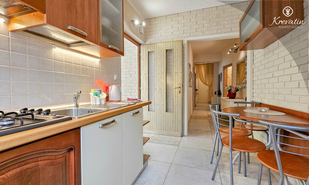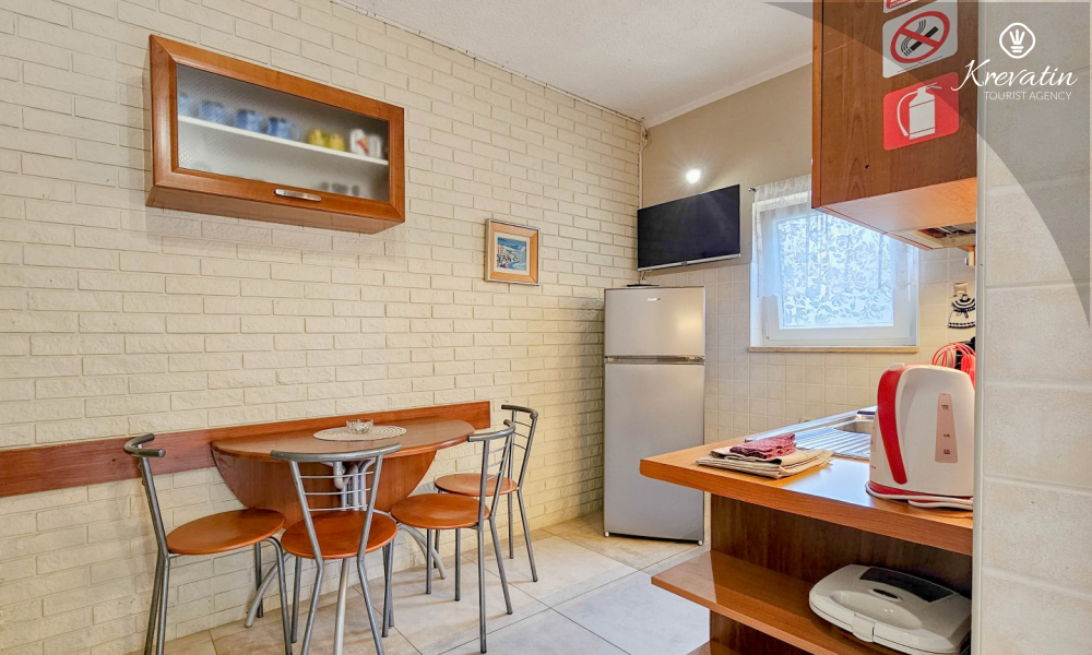 L'appartamento offre una camera da letto con letto matrimoniale, un confortevole soggiorno con letti aggiuntivi e una cucina completamente attrezzata con tutto il necessario per preparare pasti semplici. Il bagno è dotato di doccia e WC, e la terrazza con mobili da giardino vi invita a gustare il caffè del mattino o a rilassarvi all'aria aperta la sera.