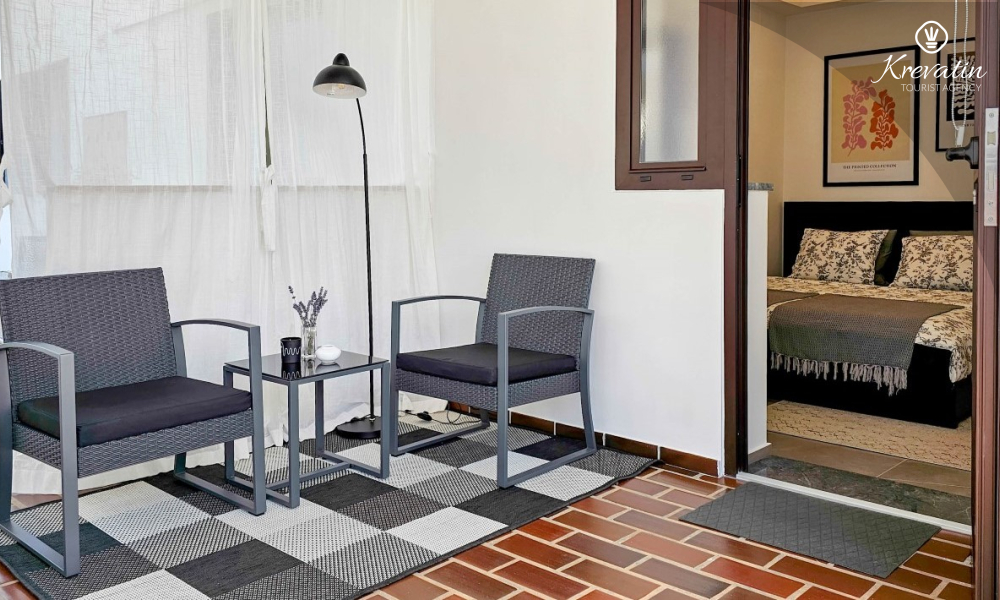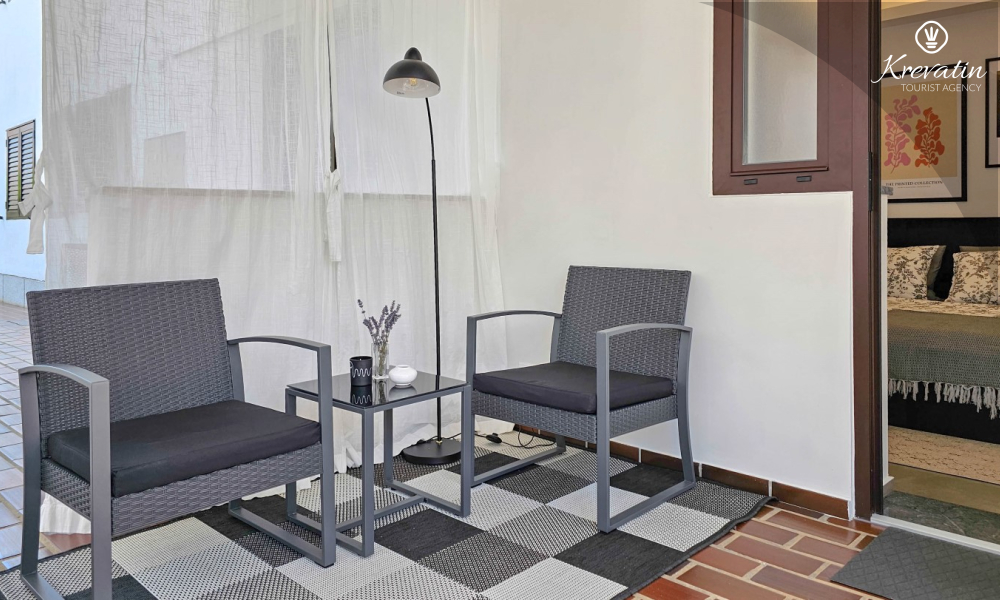 Il monolocale dispone di un comodo letto matrimoniale, un piccolo angolo cottura con attrezzatura di base e un bagno con doccia e WC. Dispone inoltre di una terrazza con tavolo e sedie per trascorrere piacevoli momenti all'aperto.