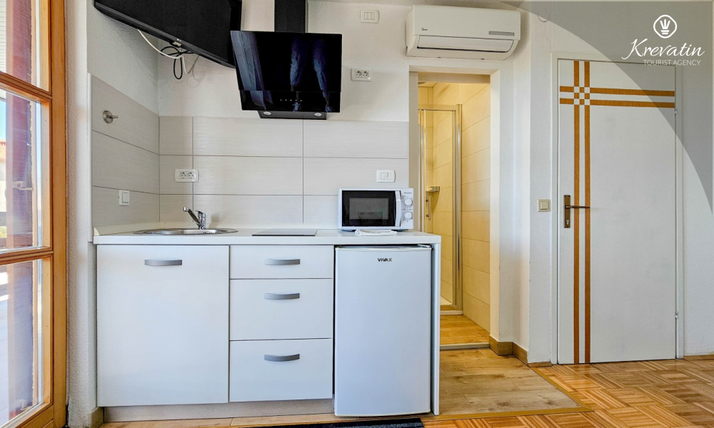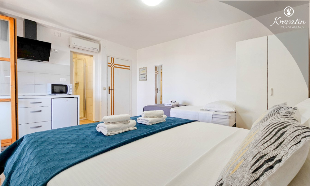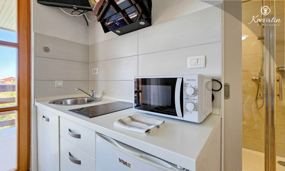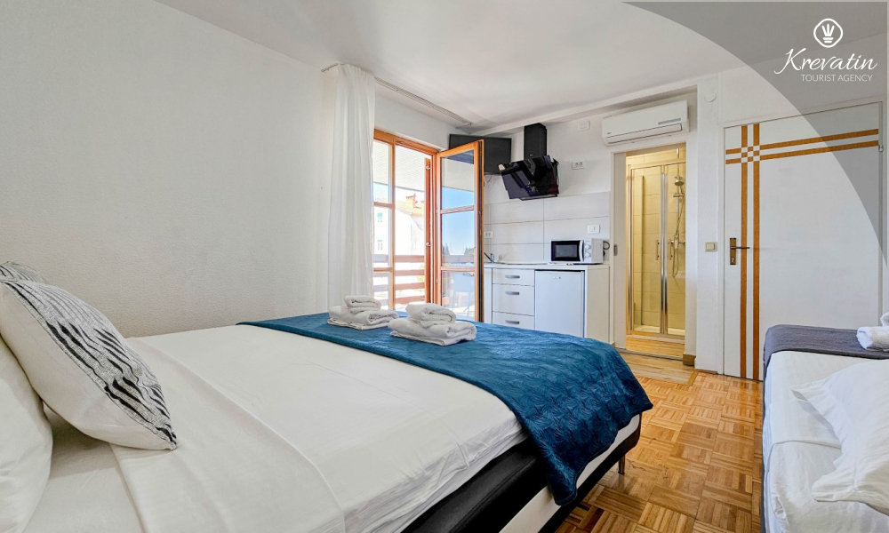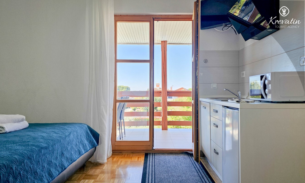Lo spazio è organizzato in un open space: un letto matrimoniale, un letto supplementare per una terza persona e una piccola cucina con attrezzatura di base per preparare pasti semplici. Un bagno con doccia e WC si trova all'interno dell'unità. C'è anche un balcone, ideale per il caffè del mattino o per le riunioni serali.