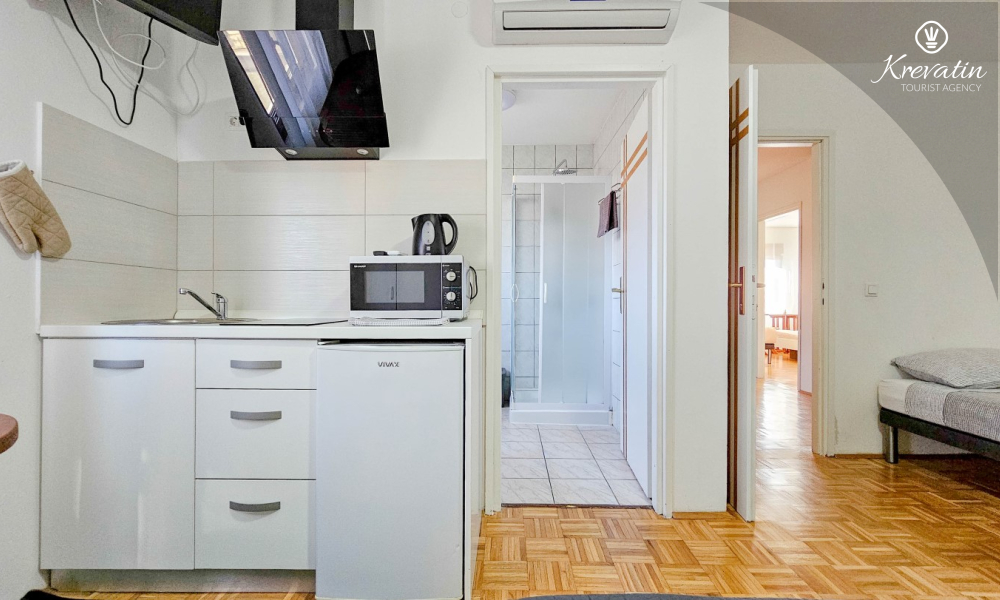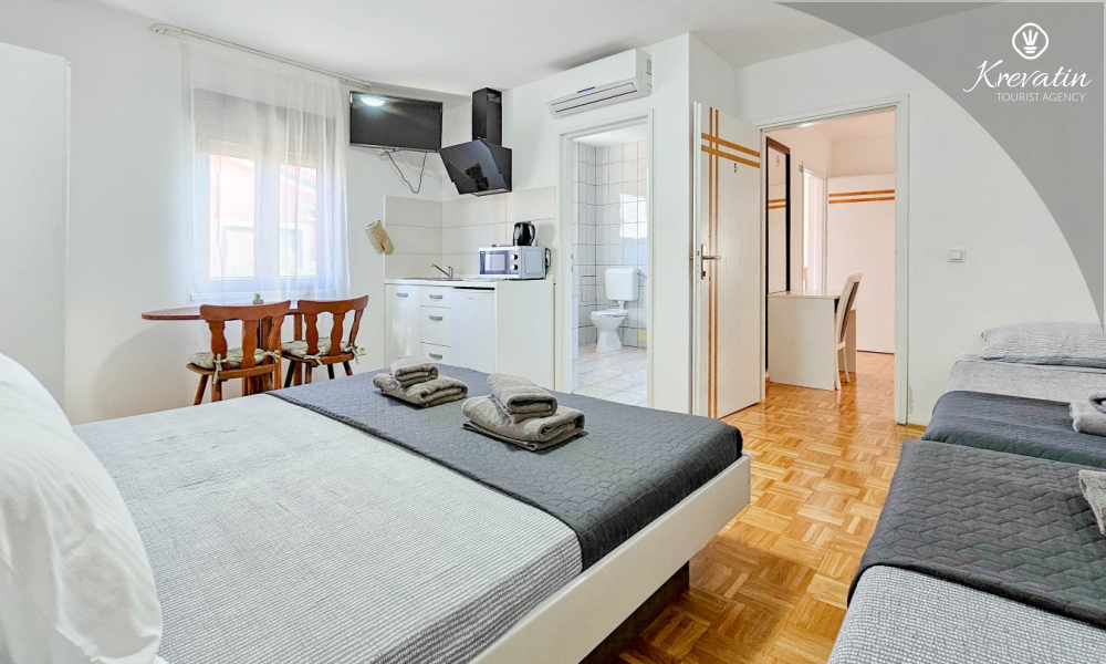 Nella stessa stanza si trovano un letto matrimoniale, un letto aggiuntivo e una piccola cucina attrezzata con utensili di base per preparare pasti semplici. Il bagno con doccia e WC si trova all'interno dell'unità.