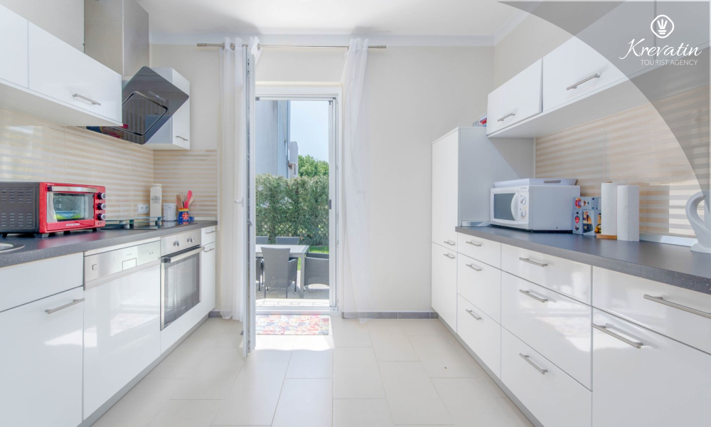 La casa offre spazio a sufficienza per un soggiorno confortevole fino a sei persone. Ci sono tre letti matrimoniali e tre bagni, garantendo comodità e privacy a tutti gli ospiti. Il soggiorno è collegato a una cucina completamente attrezzata e alla sala da pranzo. La cucina ha accesso diretto a una terrazza con vista sul verde circostante, mentre il soggiorno conduce a una terrazza con vista sulla piscina privata.