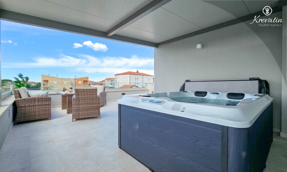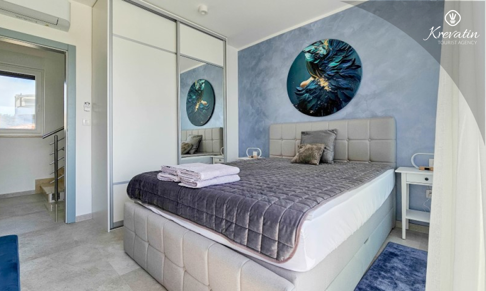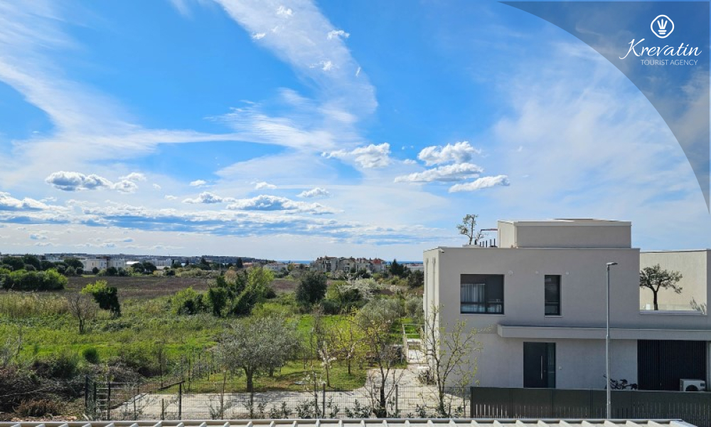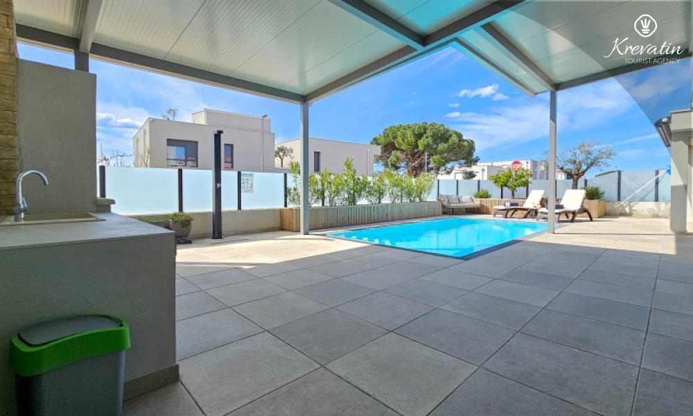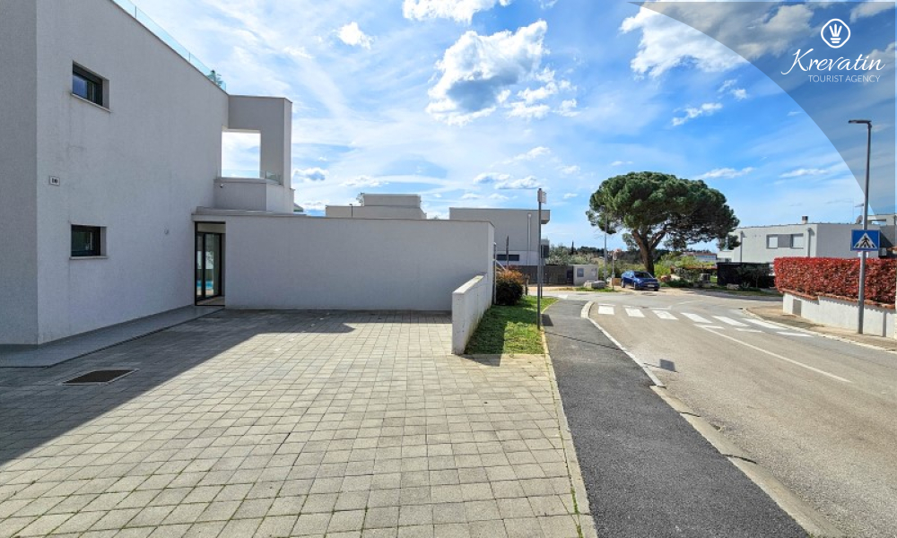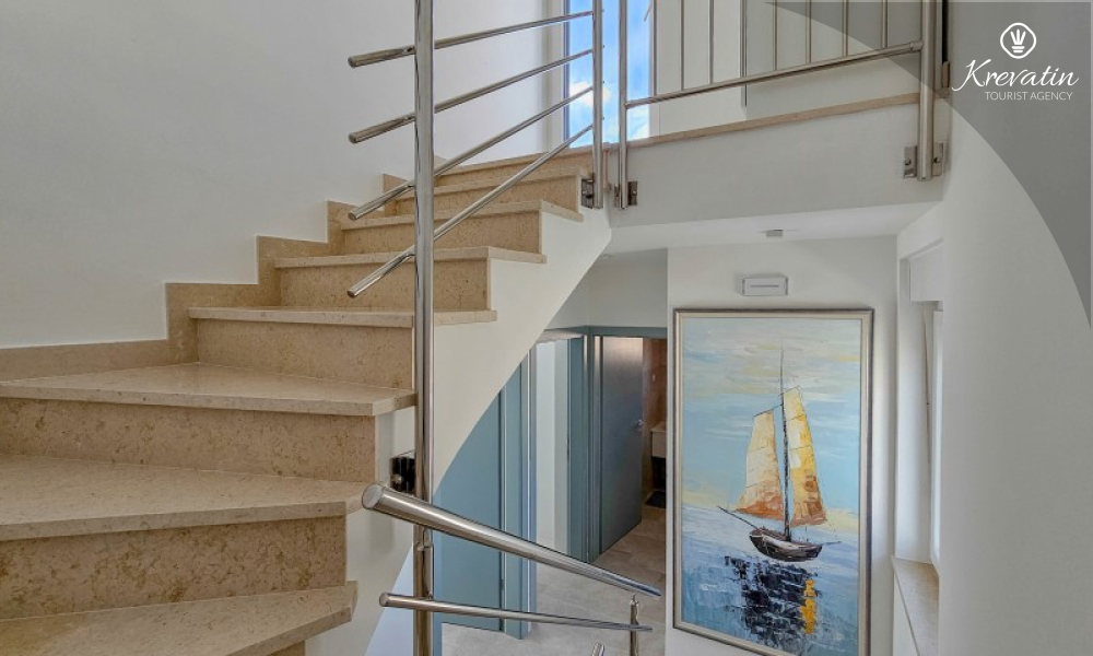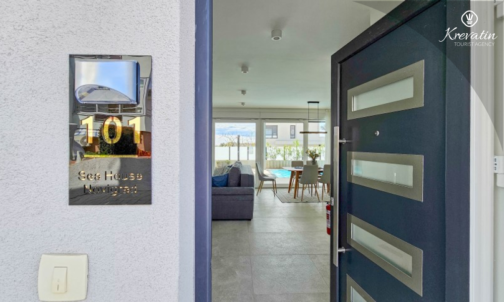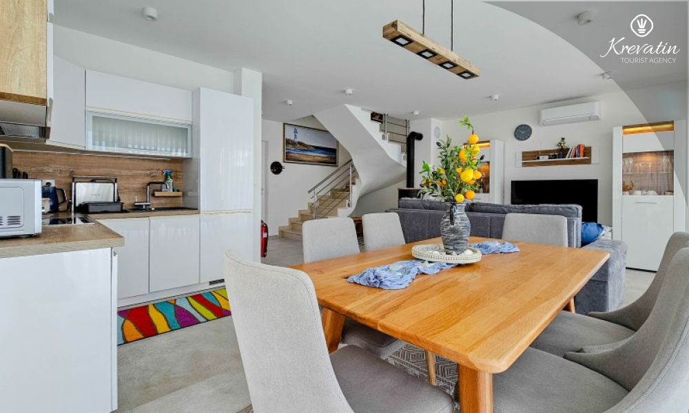 Questa moderna casa a schiera su tre piani si trova in una zona tranquilla di Novigrad, abbastanza vicina al centro e al mare, ed è ideale per 4-6 persone.
