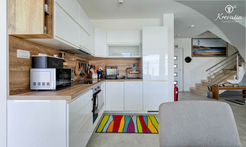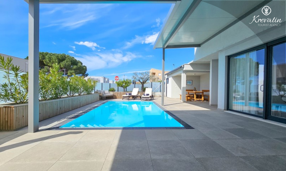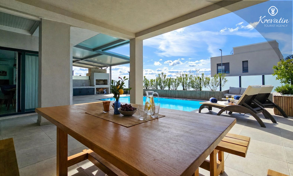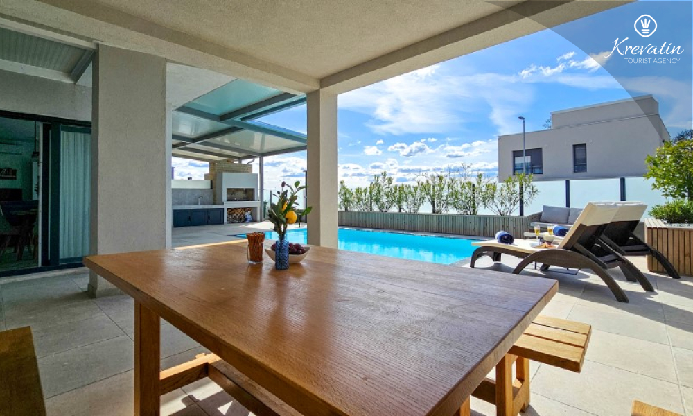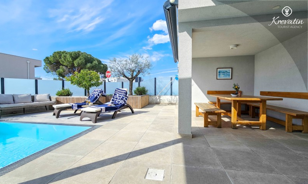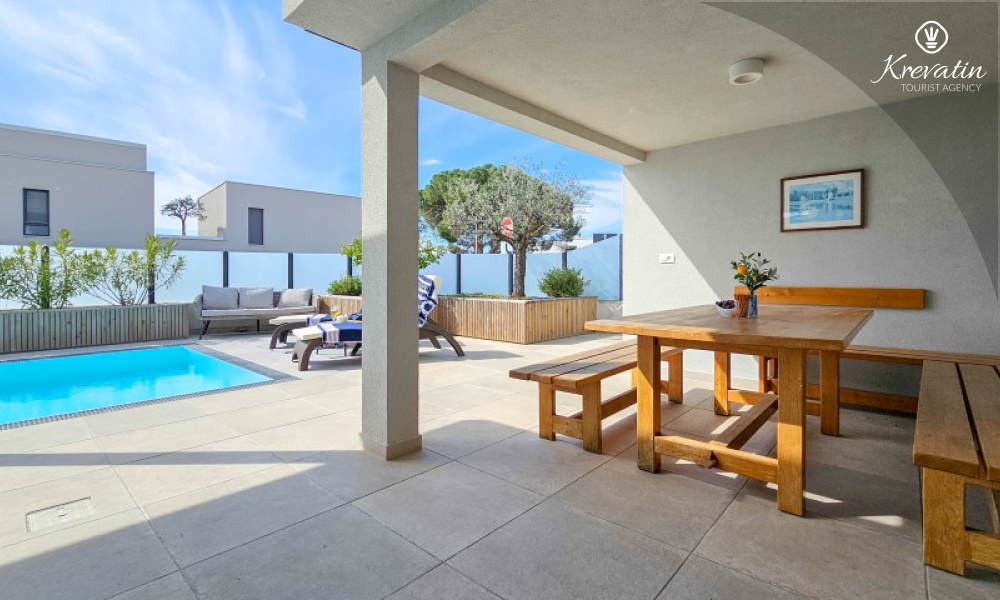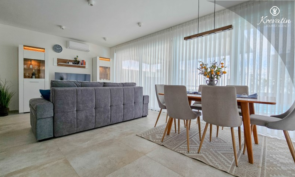 Questa moderna casa a schiera su tre piani si trova in una zona tranquilla di Novigrad, abbastanza vicina al centro e al mare, ed è ideale per 4-6 persone.