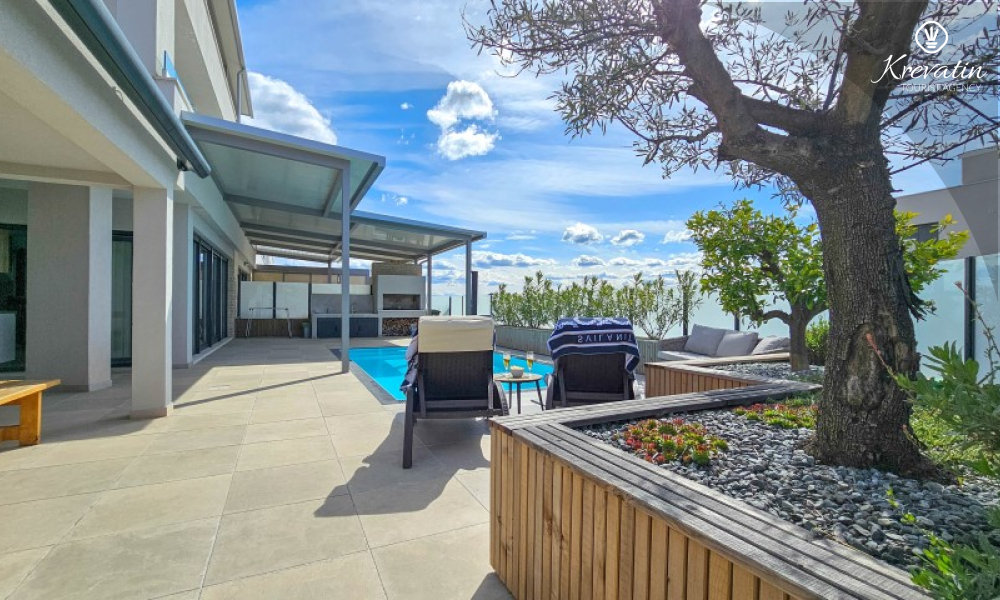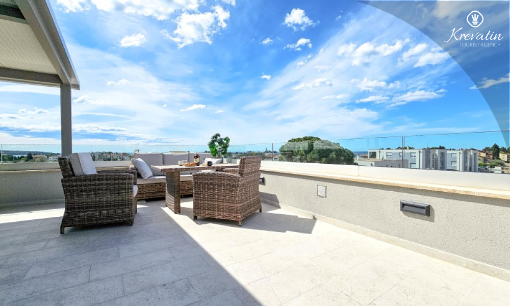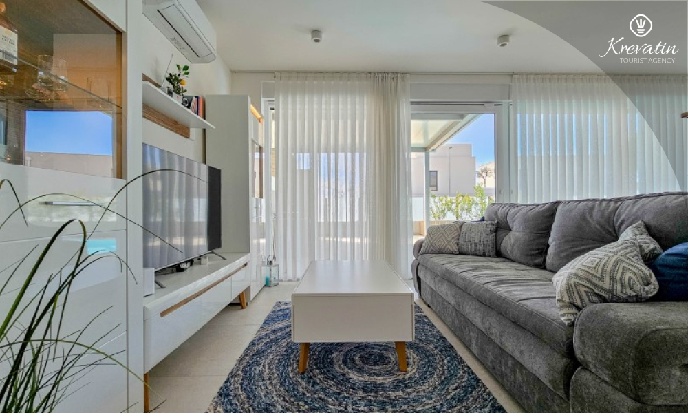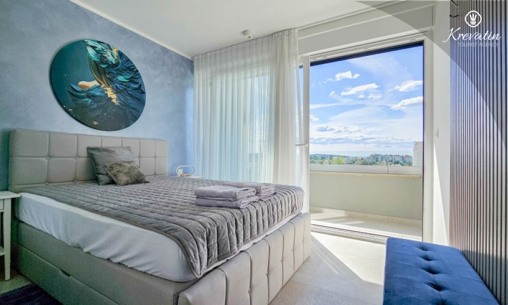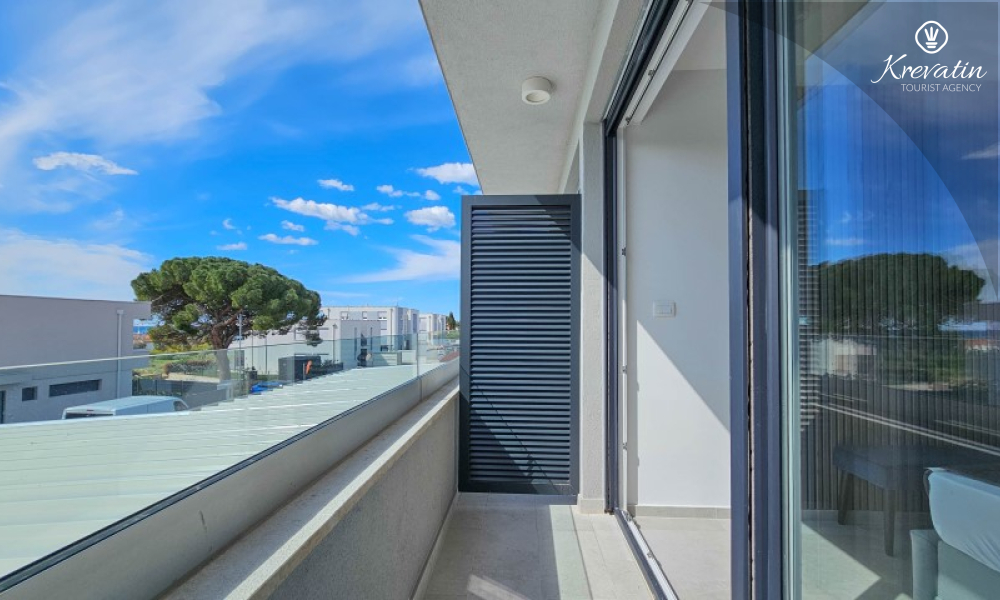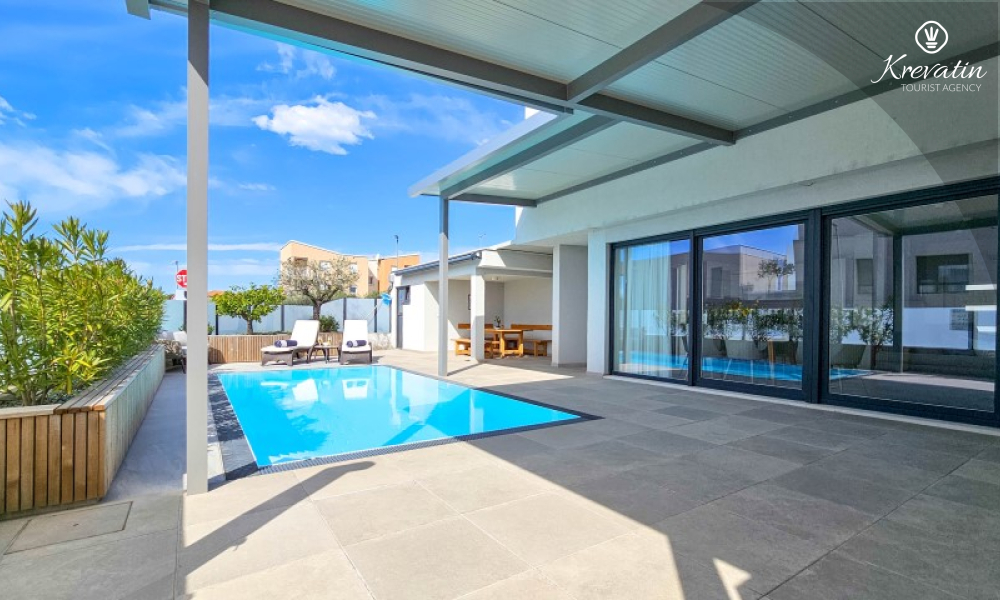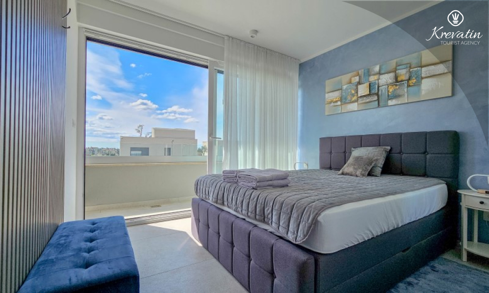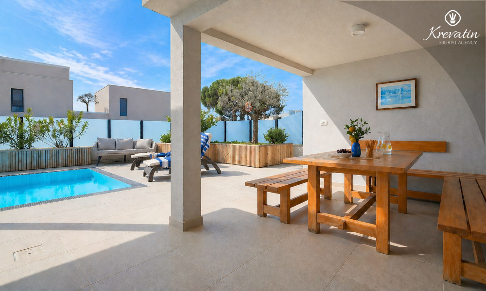 Questa moderna casa a schiera su tre piani si trova in una zona tranquilla di Novigrad, abbastanza vicina al centro e al mare, ed è ideale per 4-6 persone.