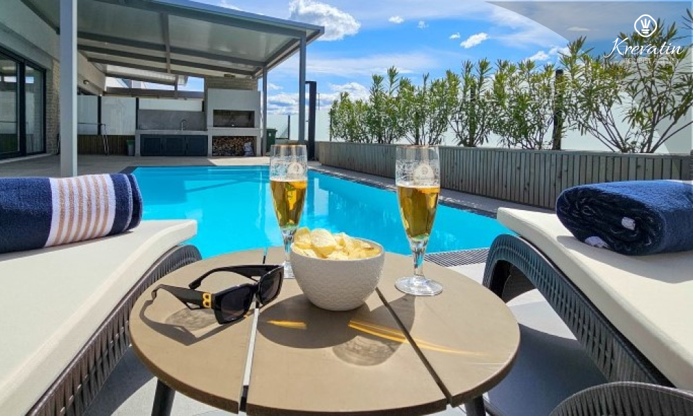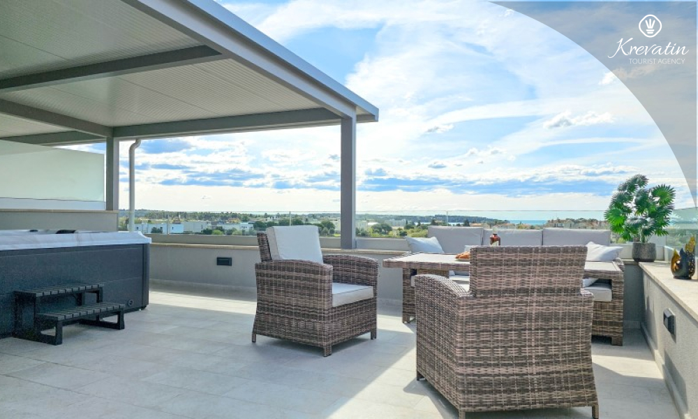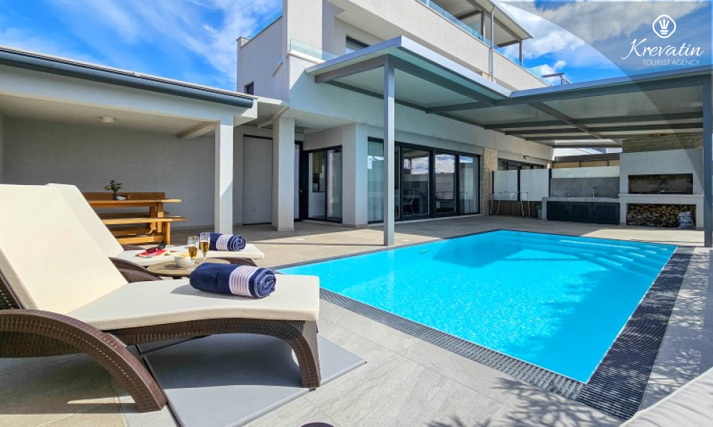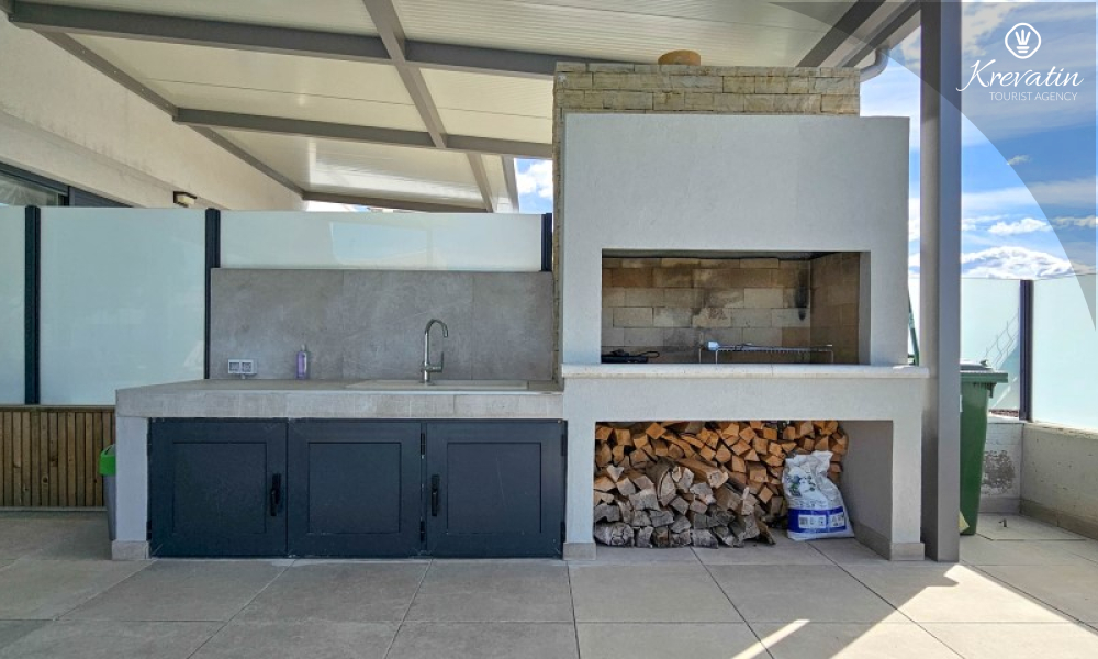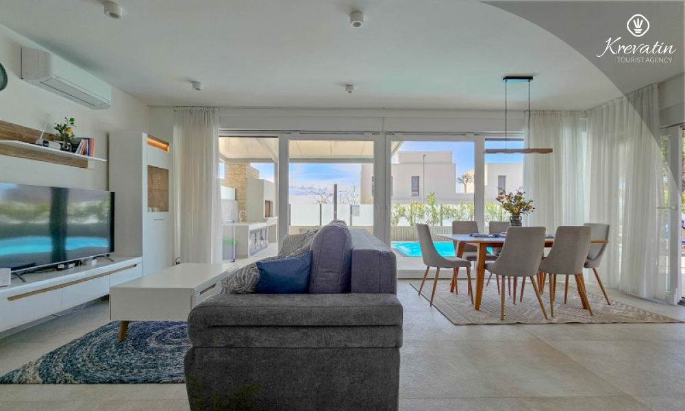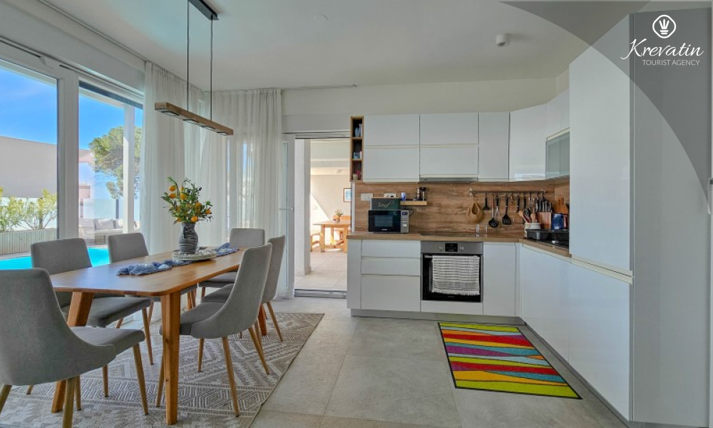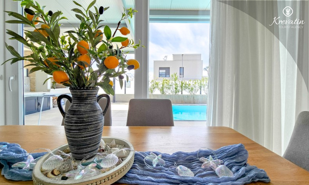Al piano terra si trova un ampio soggiorno collegato alla sala da pranzo e alla cucina, attrezzata con tutto il necessario per preparare i pasti, e un bagno con doccia e WC. Al piano superiore ci sono due camere da letto con letti matrimoniali, ognuna con il proprio balcone, e un ulteriore bagno; inoltre, il soggiorno può ospitare comodamente altre due persone. La terrazza sul tetto dispone di una vasca idromassaggio e mobili da giardino, mentre nel cortile si trovano una piscina, un'ampia terrazza per il relax e un barbecue.