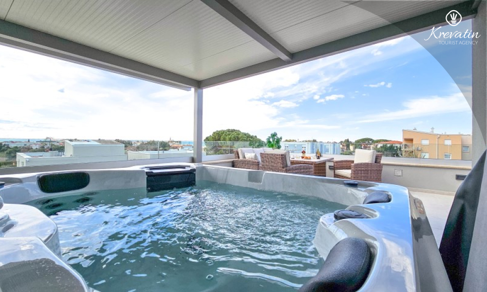 Al piano terra si trova un ampio soggiorno collegato alla sala da pranzo e alla cucina, attrezzata con tutto il necessario per preparare i pasti, e un bagno con WC. Al piano superiore ci sono due camere da letto con letti matrimoniali, ognuna con il proprio balcone, e un bagno con doccia e WC; inoltre, il soggiorno può ospitare comodamente altre due persone. La terrazza sul tetto dispone di una vasca idromassaggio e mobili da giardino, mentre nel cortile si trovano una piscina, un'ampia terrazza per il relax e un barbecue.
