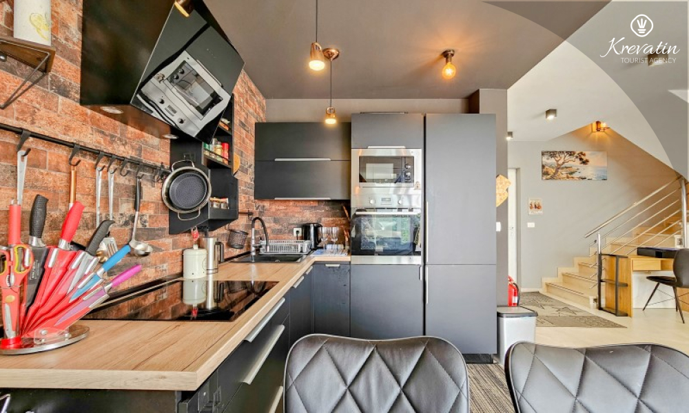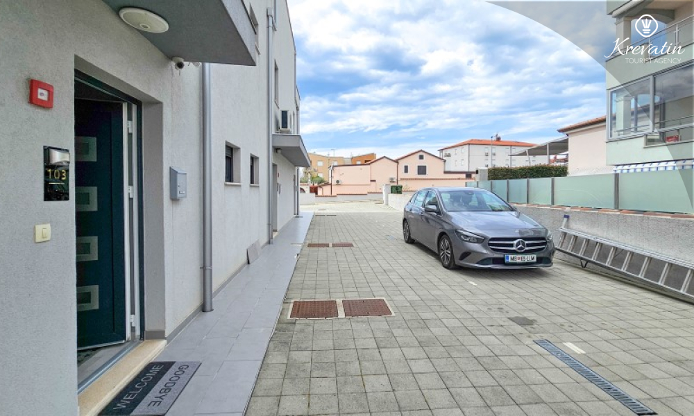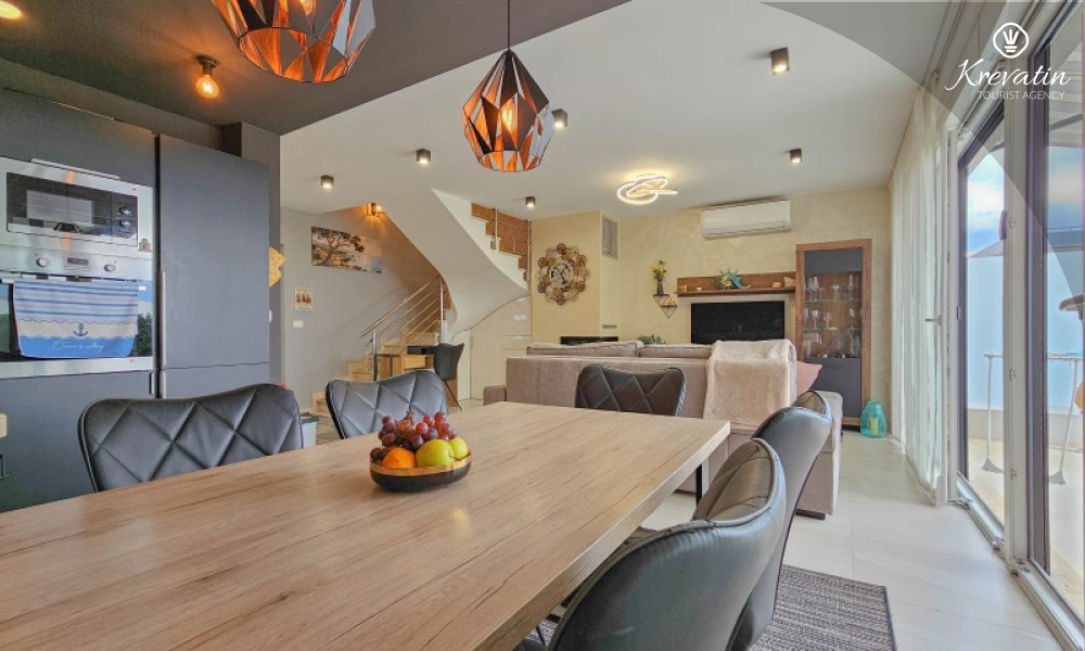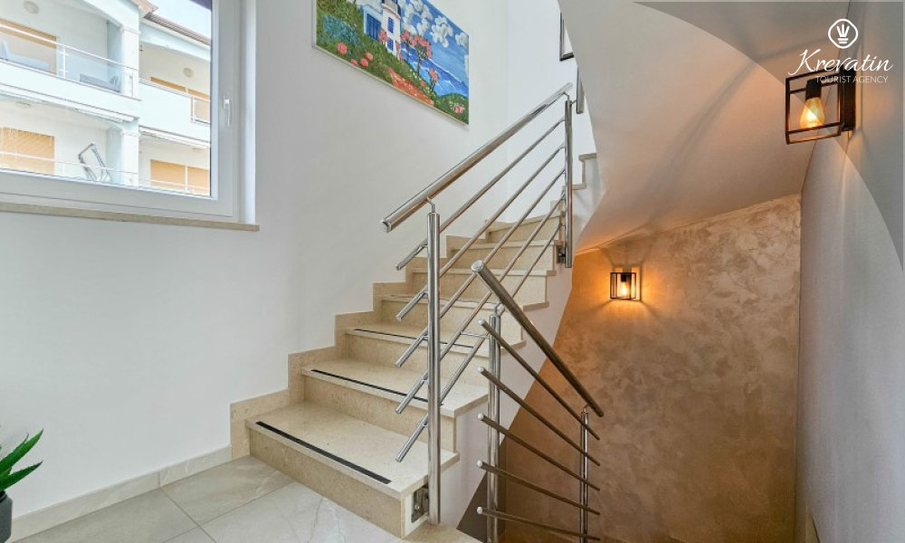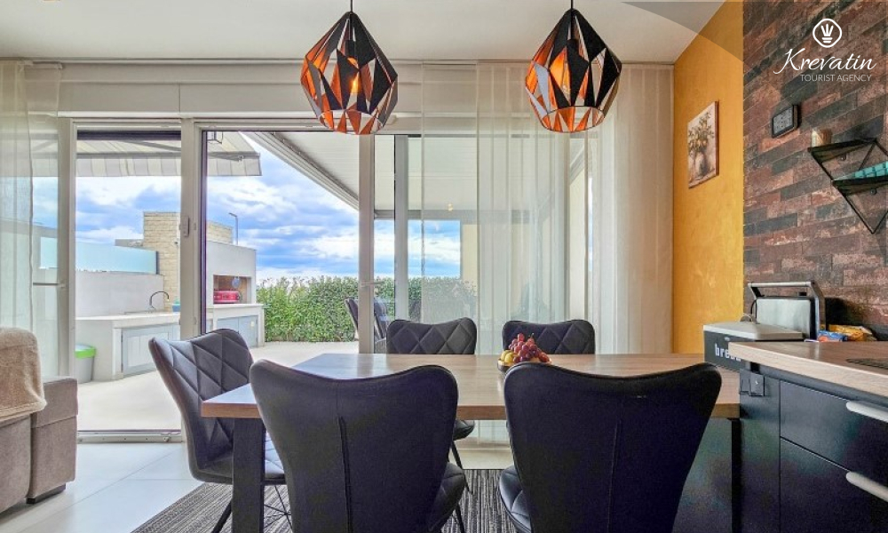Questa moderna casa a schiera su tre piani si trova in una zona tranquilla di Novigrad, abbastanza vicina al centro e al mare, ed è ideale per 4-6 persone.