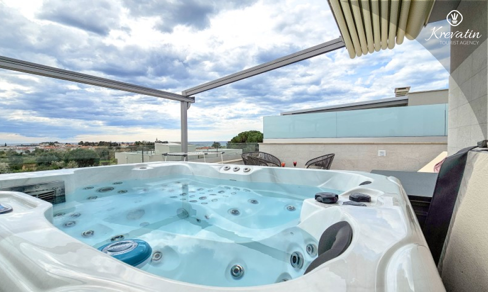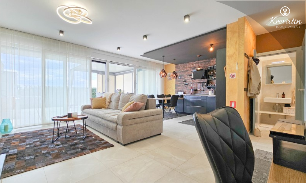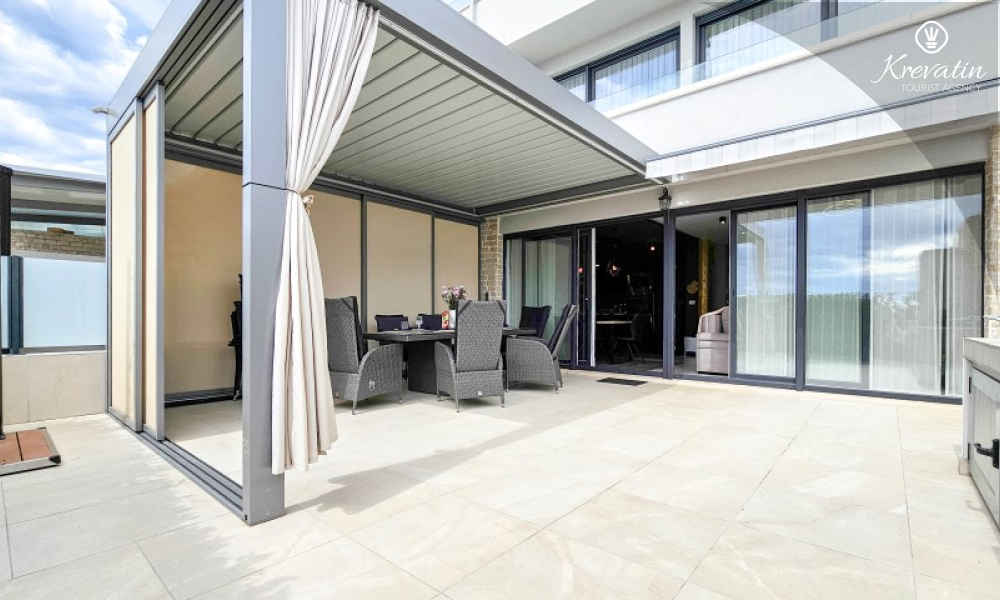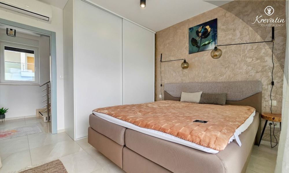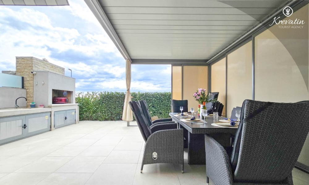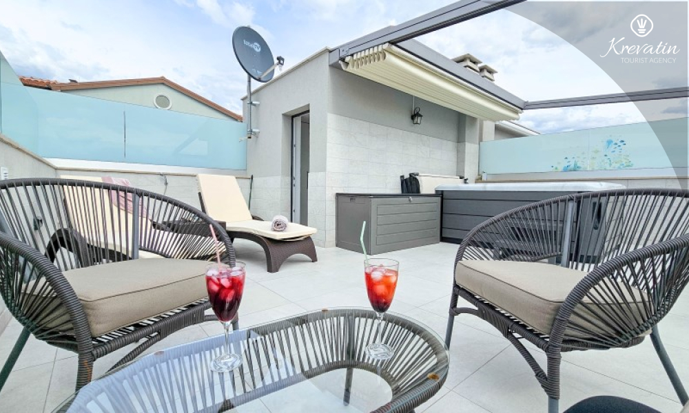 Questa moderna casa a schiera su tre piani si trova in una zona tranquilla di Novigrad, abbastanza vicina al centro e al mare, ed è ideale per 4-6 persone.